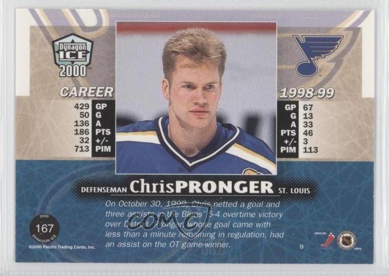 1999-00 Pacific Dynagon Ice - [Base] - Copper Missing Serial Number #167 Chris Pronger - Ice Hockey Card - Featuring the St. Louis Blues - Featuring Chris Pronger Search for more: 1999-00 Pacific Dynagon Ice Search for more: 1999-00 Pacific Dynagon Ice - [Base] - Copper Missing Serial Number View all of our Listings Auctions Buy It Now About Us Located in the beautiful Pacific Northwest, COMC (Check Out My Cards) is the world's largest consignment service for trading card singles. More than 10,000 people have used our consignment service to list over 50 million trading cards. Find out how we can help you consign your items on eBay by contacting us through eBay messaging. COMC -- "The Safe & Easy Way to Buy & Sell" Representative Image - Select Specific Item above to see image of actual item Representative Image - Select Specific Item above to see image of actual item Raw Condition for Modern Cards Unless otherwise noted, raw modern cards are listed in Near Mint-Mint condition or better. A NM-MT card appears to be Mint at first glance, but upon closer inspection, may exhibit some of the following: minor print defects (e.g. roller marks, print line, dimple), minor scratches, slight edge wear, and slight corner wear. Centering is clearly visible in the images provided and does not factor into our condition assessment. Raw Condition for Vintage Cards Unless otherwise noted, raw vintage cards are listed in Excellent condition or better. An EX card may exhibit some of the following: minor rounding of corners, surface wear, print defects, light scratches, and slight edge wear/chipping. Centering is clearly visible in the images provided and does not factor into our condition assessment. Domestic Shipping Combined shipping for multiple items is available. To receive combined shipping, please ensure all desired items are in your eBay shopping cart before proceeding to checkout. eBay limits orders to 40 items per order. We automatically combine multiple orders placed on the same day. If you place multiple orders on the same day, please contact us to request a refund of applicable shipping costs. Signature confirmation may be required on invoices over $400. All cards are protected and shipped securely. International Shipping COMC offers eBay's International Shipping (EIS) for international orders under $2,500* (see country exceptions below). All duties and import fees are paid at checkout; in the rare event that there are additional import fees upon delivery, these are borne by the buyer. EIS packages route through a shipping hub in Erlanger, KY before shipping to their final destination. Please note that EIS does not allow for combined shipments. The shipping rates are determined by eBay and cannot be adjusted. *Maximum sale price exceptions: Colombia, Kuwait ($2,000); Taiwan ($1,539); Chile, Costa Rica, Guatemala, Honduras, Trinidad and Tobago ($1,000); Antigua and Barbuda, Aruba, Belize, Dominica, Grenada, Philippines, Saint Kitts and Nevis, Saint Lucia, Montserrat, Turks and Caicos Islands ($500); Dominican Republic, El Salvador ($200). Please request a shipping quote through eBay messaging for orders that exceed the maximum sale price supported by eBay's International Shipping. You will be responsible for all duties and import fees for international orders shipped outside the EIS. All cards are protected and shipped securely. Payment COMC does not accept offers on our cards through our eBay storefront. COMC utilizes eBay’s managed payments system. If you are experiencing difficulties making a payment, please contact eBay for assistance. Return Policy Returns are only accepted on the rare occasion the item is not as described. If you are making a return, please initiate the return process through eBay so a mailing label can be provided for you. Prior to listing, our expert team carefully assessed this item to represent it accurately. Please review the description and high-definition images prior to purchasing to ensure this item meets your satisfaction. We welcome you to contact us if you have further questions about this item. Trust and Integrity COMC carefully assesses each item consigned to us to prevent fraudulent items from entering the marketplace. If you believe an item offered on COMC may be fraudulent, please contact us with details so we can investigate the issue. Items we determine are outside our supported items policy may be removed. Last Modified: 7/10/2025 9:52:34 PM PDT