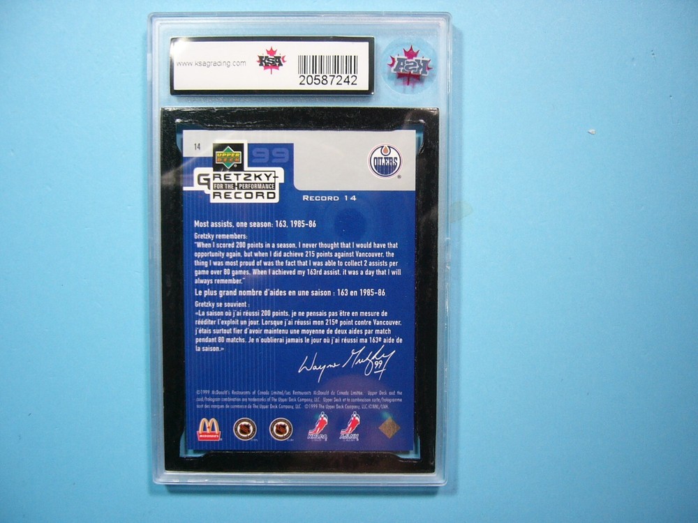 YOU ARE BIDDING ON A 1999/00 UPPER DECK U.D. MCDONALD'S NHL HOCKEY CARD #14 WAYNE GRETZKY, EDMONTON OILERS . FOR THE RECORD. CARD IS GRADED 10 BY KSA IN GEM MINT CONDITION. GREAT COLOUR & GLOSS--A SUPER SHARP, CLEAN & ATTRACTIVE CARD FROM THE GREAT ONE !!! THANK YOU FOR LOOKING AND GOOD LUCK!!! -------------------------------------------------------------------------------------------------------------------------------- SHIPPING WITHIN CANADA IS $4.99. SHIPPING TO THE UNITED STATES IS $8.99 AND INCLUDES TRACKING & INSURANCE. SHIPPING INTERNATIONALLY (ANYWHERE ELSE) IS $25.00 AND INCLUDES TRACKING & INSURANCE. ITEM WILL BE CAREFULLY PACKAGED SO AS NOT TO GET DAMAGED DURING SHIPPING. IF YOU ARE IN CANADA AND WOULD LIKE SHIPPING WITH TRACKING & INSURANCE INCLUDED COST IS $12.99. PLEASE CONTACT US BEFORE PAYMENT IS MADE TO ADJUST THE INVOICE ACCORDINGLY. WE DO COMBINE SHIPPING ON MULTIPLE PURCHASES--ONLY $1.00 MORE FOR EACH ADDITIONAL SINGLE GRADED CARD OR ONLY 25 CENTS MORE FOR EACH ADDITIONAL SINGLE UNGRADED CARD. TAKE A LOOK AT OUR OTHER AUCTIONS AND SAVE ON SHIPPING!!!