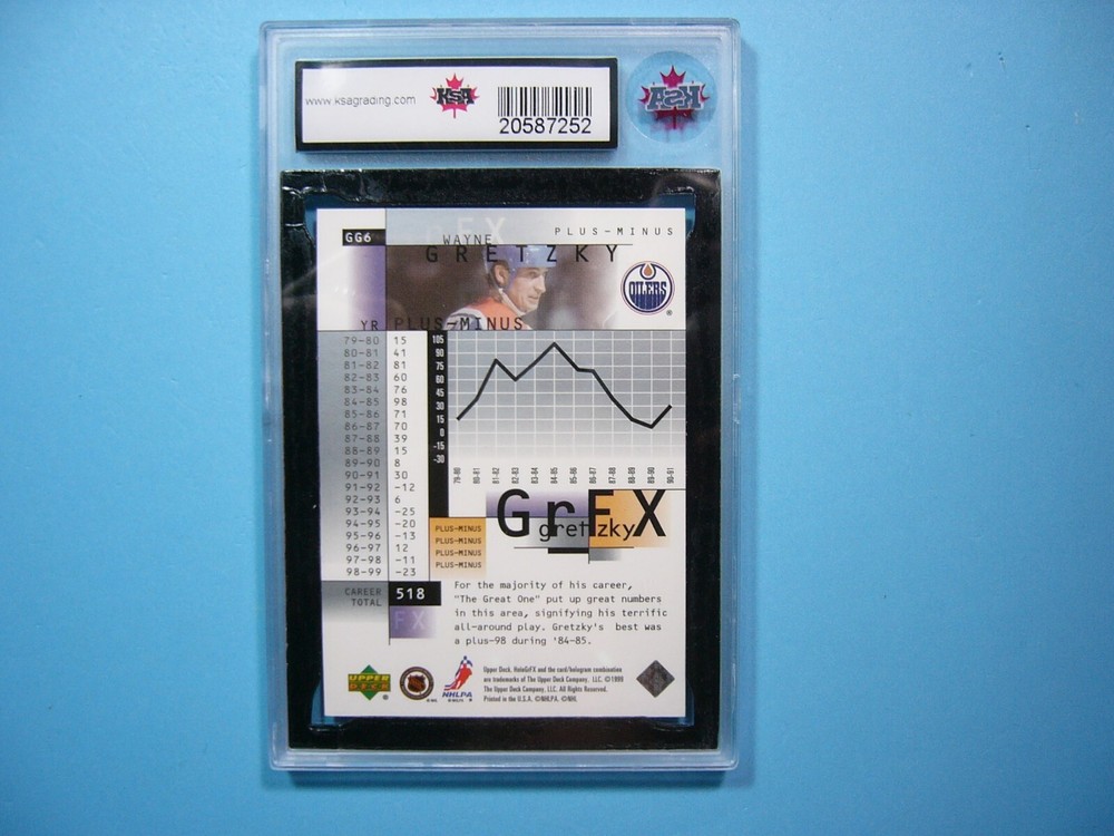 YOU ARE BIDDING ON A 1999/00 UPPER DECK U.D. HOLOGRFX NHL HOCKEY CARD #GG6 WAYNE GRETZKY, EDMONTON OILERS . CARD IS GRADED 10 BY KSA IN GEM MINT CONDITION. GREAT COLOUR & GLOSS--A SUPER SHARP, CLEAN & ATTRACTIVE UNIQUE CARD OF THE GREAT ONE !!! THANK YOU FOR LOOKING AND GOOD LUCK!!! -------------------------------------------------------------------------------------------------------------------------------- SHIPPING WITHIN CANADA IS $4.99. SHIPPING TO THE UNITED STATES IS $8.99 AND INCLUDES TRACKING & INSURANCE. SHIPPING INTERNATIONALLY (ANYWHERE ELSE) IS $25.00 AND INCLUDES TRACKING & INSURANCE. ITEM WILL BE CAREFULLY PACKAGED SO AS NOT TO GET DAMAGED DURING SHIPPING. IF YOU ARE IN CANADA AND WOULD LIKE SHIPPING WITH TRACKING & INSURANCE INCLUDED COST IS $12.99. PLEASE CONTACT US BEFORE PAYMENT IS MADE TO ADJUST THE INVOICE ACCORDINGLY. WE DO COMBINE SHIPPING ON MULTIPLE PURCHASES--ONLY $1.00 MORE FOR EACH ADDITIONAL SINGLE GRADED CARD OR ONLY 25 CENTS MORE FOR EACH ADDITIONAL SINGLE UNGRADED CARD. TAKE A LOOK AT OUR OTHER AUCTIONS AND SAVE ON SHIPPING!!!
