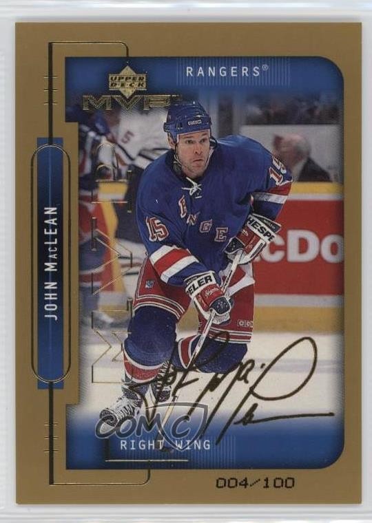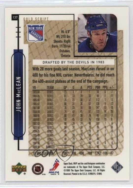 1999-00 Upper Deck MVP - [Base] - Gold Script #137 John MacLean Qty Made: 100 - Ice Hockey Card - Featuring the New York Rangers - Featuring John MacLean Search for more: 1999-00 Upper Deck MVP Search for more: 1999-00 Upper Deck MVP - [Base] - Gold Script View all of our Listings Auctions Buy It Now About Us Located in the beautiful Pacific Northwest, COMC (Check Out My Cards) is the world's largest consignment service for trading card singles. More than 10,000 people have used our consignment service to list over 50 million trading cards. Find out how we can help you consign your items on eBay by contacting us through eBay messaging. COMC -- "The Safe & Easy Way to Buy & Sell" Representative Image - Select Specific Item above to see image of actual item Representative Image - Select Specific Item above to see image of actual item Raw Condition for Modern Cards Unless otherwise noted, raw modern cards are listed in Near Mint-Mint condition or better. A NM-MT card appears to be Mint at first glance, but upon closer inspection, may exhibit some of the following: minor print defects (e.g. roller marks, print line, dimple), minor scratches, slight edge wear, and slight corner wear. Centering is clearly visible in the images provided and does not factor into our condition assessment. Raw Condition for Vintage Cards Unless otherwise noted, raw vintage cards are listed in Excellent condition or better. An EX card may exhibit some of the following: minor rounding of corners, surface wear, print defects, light scratches, and slight edge wear/chipping. Centering is clearly visible in the images provided and does not factor into our condition assessment. Domestic Shipping Combined shipping for multiple items is available. To receive combined shipping, please ensure all desired items are in your eBay shopping cart before proceeding to checkout. eBay limits orders to 40 items per order. We automatically combine multiple orders placed on the same day. If you place multiple orders on the same day, please contact us to request a refund of applicable shipping costs. Signature confirmation may be required on invoices over $400. All cards are protected and shipped securely. International Shipping COMC offers eBay's International Shipping (EIS) for international orders under $2,500* (see country exceptions below). All duties and import fees are paid at checkout; in the rare event that there are additional import fees upon delivery, these are borne by the buyer. EIS packages route through a shipping hub in Erlanger, KY before shipping to their final destination. Please note that EIS does not allow for combined shipments. The shipping rates are determined by eBay and cannot be adjusted. *Maximum sale price exceptions: Colombia, Kuwait ($2,000); Taiwan ($1,539); Chile, Costa Rica, Guatemala, Honduras, Trinidad and Tobago ($1,000); Antigua and Barbuda, Aruba, Belize, Dominica, Grenada, Philippines, Saint Kitts and Nevis, Saint Lucia, Montserrat, Turks and Caicos Islands ($500); Dominican Republic, El Salvador ($200). Please request a shipping quote through eBay messaging for orders that exceed the maximum sale price supported by eBay's International Shipping. You will be responsible for all duties and import fees for international orders shipped outside the EIS. All cards are protected and shipped securely. Payment COMC does not accept offers on our cards through our eBay storefront. COMC utilizes eBay’s managed payments system. If you are experiencing difficulties making a payment, please contact eBay for assistance. Return Policy Returns are only accepted on the rare occasion the item is not as described. If you are making a return, please initiate the return process through eBay so a mailing label can be provided for you. Prior to listing, our expert team carefully assessed this item to represent it accurately. Please review the description and high-definition images prior to purchasing to ensure this item meets your satisfaction. We welcome you to contact us if you have further questions about this item. Trust and Integrity COMC carefully assesses each item consigned to us to prevent fraudulent items from entering the marketplace. If you believe an item offered on COMC may be fraudulent, please contact us with details so we can investigate the issue. Items we determine are outside our supported items policy may be removed. Last Modified: 6/19/2025 12:07:32 PM PDT