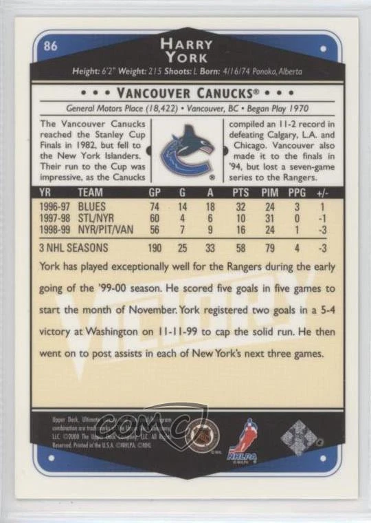 1999-00 Upper Deck Ultimate Victory - [Base] - Victory Collection #86 Harry York - Ice Hockey Card - Featuring the Vancouver Canucks - Featuring Harry York Search for more: 1999-00 Upper Deck Ultimate Victory Search for more: 1999-00 Upper Deck Ultimate Victory - [Base] - Victory Collection View all of our Listings Auctions Buy It Now About Us Located in the beautiful Pacific Northwest, COMC (Check Out My Cards) is the world's largest consignment service for trading card singles. More than 10,000 people have used our consignment service to list over 50 million trading cards. We currently house 20 million cards, each listed for sale with front and back images of the actual card. Find out how we can help you consign your items on eBay by contacting us through eBay messaging. COMC -- "The Safe & Easy Way to Buy & Sell" Representative Image - Select Specific Item above to see image of actual item Representative Image - Select Specific Item above to see image of actual item Raw Condition for Modern Cards Unless otherwise noted, raw modern cards are listed in Near Mint-Mint condition or better. A NM-MT card appears to be Mint at first glance, but upon closer inspection, may exhibit some of the following: minor print defects (e.g. roller marks, print line, dimple), minor scratches, slight edge wear, and slight corner wear. Centering is clearly visible in the images provided and does not factor into our condition assessment. Raw Condition for Vintage Cards Unless otherwise noted, raw vintage cards are listed in Excellent condition or better. An EX card may exhibit some of the following: minor rounding of corners, surface wear, print defects, light scratches, and slight edge wear/chipping. Centering is clearly visible in the images provided and does not factor into our condition assessment. Domestic Shipping Combined shipping for multiple items is available. To receive combined shipping, please ensure all desired items are in your eBay shopping cart before proceeding to checkout. eBay limits orders to 40 items per order. We automatically combine multiple orders placed on the same day. If you place multiple orders on the same day, please contact us to request a refund of applicable shipping costs. Signature confirmation may be required on invoices over $400. Raw cards are shipped in toploaders. International Shipping COMC offers eBay's International Shipping (EIS) for international orders under $2,500* (see country exceptions below). All duties and import fees are paid at checkout; in the rare event that there are additional import fees upon delivery, these are borne by the buyer. EIS packages route through a shipping hub in Erlanger, KY before shipping to their final destination. Please note that EIS does not allow for combined shipments. The shipping rates are determined by eBay and cannot be adjusted. *Maximum sale price exceptions: Colombia, Kuwait ($2,000); Taiwan ($1,539); Chile, Costa Rica, Guatemala, Honduras, Trinidad and Tobago ($1,000); Antigua and Barbuda, Aruba, Belize, Dominica, Grenada, Philippines, Saint Kitts and Nevis, Saint Lucia, Montserrat, Turks and Caicos Islands ($500); Dominican Republic, El Salvador ($200). Please request a shipping quote through eBay messaging for orders that exceed the maximum sale price supported by eBay's International Shipping. You will be responsible for all duties and import fees for international orders shipped outside the EIS. Raw cards are shipped in toploaders. Payment COMC does not accept offers on our cards through our eBay storefront. COMC utilizes eBay’s managed payments system. If you are experiencing difficulties making a payment, please contact eBay for assistance. Return Policy Returns are only accepted on the rare occasion the item is not as described. If you are making a return, please initiate the return process through eBay so a mailing label can be provided for you. Prior to listing, our expert team carefully assessed this item to represent it accurately. Please review the description and high-definition images prior to purchasing to ensure this item meets your satisfaction. We welcome you to contact us if you have further questions about this item. Trust and Integrity COMC carefully assesses each item consigned to us to prevent fraudulent items from entering the marketplace. If you believe an item offered on COMC may be fraudulent, please contact us with details so we can investigate the issue. Items we determine are outside our supported items policy may be removed. Last Modified: 11/30/2024 9:09:50 PM PDT