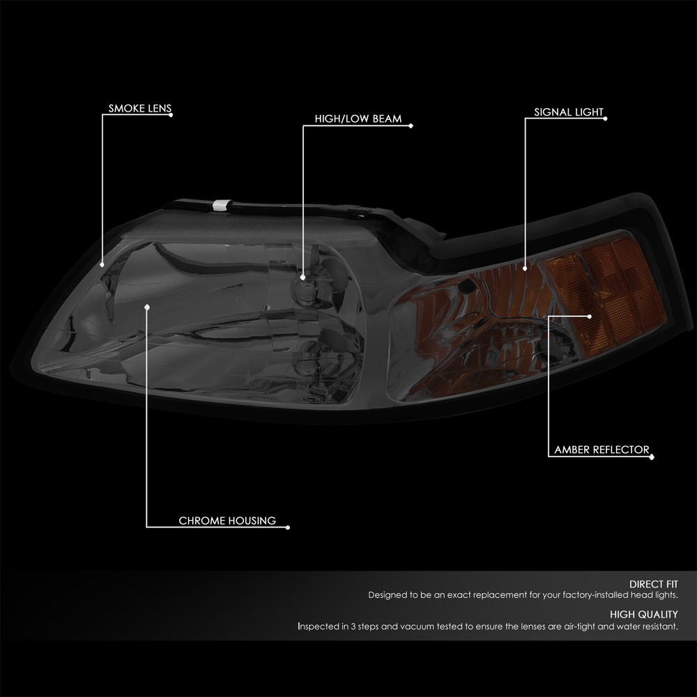 Welcome to our eBay store DPT Motorsport Business Hours: Monday - Friday, 9 AM to 6 PM PST. Store Home Payment Shipping Returns Need Help Add to Favorites About Us Fit 1999-2004 Ford Mustang Pair Smoked Housing Amber Corner Headlight/Lamp Set Product Description A headlight (headlamp) is a lamp attached to the front of a vehicle to light the road ahead. Headlight performance has steadily improved throughout the automobile age, spurred by the great disparity between daytime and nighttime traffic fatalities. Headlights are one of the most important components of your vehicle; they allow you to see the road in front of you clearly during the night and in any bad weather that may arise. Our headlights upgrade the face of your vehicle with clear style and extreme range. Made of High-Grade Durable ABS Plastic Materials Factory Style Headlight Smoke Tinted Lens with Chrome Housing Sold as a Pair (Driver & Passenger Side) S.A.E. and D.O.T. Approved to Ensure the Quality and Fitment Plug and Play Operation Direct Bolt-on Replacement for The Stock Unit Easy Installation without Drilling Needed Improves Visibility and Driving Safety in Hazy Weather Use of 9007 Bulb for High / Low Beam Use of 3157A Bulb for Turn Signal Bulbs are Not Included; Reuse Existing Bulbs Includes: 1 X Pair of Headlights (Left & Right) Notes: Compatible with: 99-04 Ford Mustang 100% Brand New Professional Installation is Highly Recommended Installation Instruction is NOT Included About Us Payment Shipping Returns Feedback Contact Us Have any questions or need info about something you already purchased? We'd love to hear from you! For items already purchased, please kindly include your eBay item number for faster response time. DPT Motorsport operates from Monday through Friday, 10 am to 6 pm (PST). ATTENTION: We are closed on Saturdays and Sundays. All messages will be replied in the order it was received during business days Thank you for choosing DPT Motorsport and happy bidding! We accept PayPal only. We reserve the right to file Non-Paying Bidder if payment is not received 10 days after the auction ended. Shipping Methods All shipments are made via either UPS or United States Postal Service depending on the types of products purchased. Majority of our orders will be ship within 2 business days (mostly within 24hrs) (All mail transit time stated above is best estimated but not guaranteed.) All shipments requires physical addresses, no PO Box address will be shipped. Shipping and handling charges are not negotiable. Return Policy **We stand behind the products we sell. If for any reason you are not satisfied with your purchase, we'll be happy to process a refund the product less S&H within 30 Days of your purchase. All return items will require a RMA number, which is given by our Customer Service Department only. Please allow 10-14 days for returns and exchange to be process. Please inspect all your order(s) upon receipt. All return items MUST be in brand new condition which means the item is never installed and kept in the original packaging. We will not reship replacement(s) before we get a claim approval for the lost or stolen item(s) or the returned item from customers. In most cases, all shipping and handling fees are non-refundable, unless it has been approved by our Customer Service Department. Any item(s) that the buyer states as defective will be tested by our Returns Department, if there is no problems or errors found during testing. Once the RMA# is issued, the buyer will have 30 days to return the item, if any items that is return after 30 days, the item(s) are subject for rejection. All items are brand new unless otherwise stated. PROFESSIONAL installation is highly recommended. Buyer assumes all risk on usage. About Us Have any questions or need info about something you already purchased? We'd love to hear from you! For items already purchased, please kindly include your eBay item number for faster response time. DPT Motorsport operates from Monday through Friday, 10 am to 6 pm (PST). ATTENTION: We are closed on Saturdays and Sundays. All messages will be replied in the order it was received during business days Thank you for choosing DPT Motorsport and happy bidding! Payment We accept PayPal only. We reserve the right to file Non-Paying Bidder if payment is not received 10 days after the auction ended. Shipping Shipping Methods All shipments are made via either UPS or United States Postal Service depending on the types of products purchased. Majority of our orders will be ship within 2 business days (mostly within 24hrs) (All mail transit time stated above is best estimated but not guaranteed.) All shipments requires physical addresses, no PO Box address will be shipped. Shipping and handling charges are not negotiable. Returns >Return Policy **We stand behind the products we sell. If for any reason you are not satisfied with your purchase, we'll be happy to process an exchange or refund the product less S&H within 30 Days of your purchase. All return items will require a RMA number, which is given by our Customer Service Department only. Please allow 10-14 days for returns and exchange to be process. Please inspect all your order(s) upon receipt. All return items MUST be in brand new condition which means the item is never installed and kept in the original packaging, otherwise you will be subjected to a 20% restocking fee. We will not reship replacement(s) before we get a claim approval for the lost or stolen item(s) or the returned item from customers. In most cases, all shipping and handling fees are non-refundable, unless it has been approved by our Customer Service Department. Any item(s) that the buyer states as defective will be tested by our Returns Department, if there is no problems or errors found during testing, there will be a mandatory 20% restocking fee for the price of the item. Once the RMA# is issued, the buyer will have 30 days to return the item, if any items that is return after 30 days