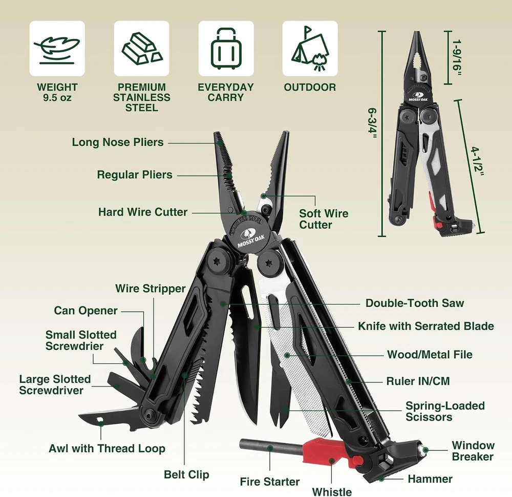 Versatile 19-in-1 Stainless Steel Pocket Multitool for Outdoor Adventures ‹ › ‹ › ‹ › ‹ › ‹ › ‹ › ‹ › ‹ › ‹ › Versatile 19-in-1 Stainless Steel Pocket Multitool for Outdoor Adventures Discover the ultimate companion for your outdoor escapades with our innovative 19-in-1 Multitool. Designed to enhance your preparedness and versatility, this multi-tool is a must-have for enthusiasts of camping, fishing, hiking, and everyday DIY projects. Features: 19-IN-1 MULTITOOL: Long nose pliers, regular pliers, hard wire cutter, soft wire cutter, awl with thread loop, large and small slotted screwdrivers, can opener, wire stripper, double-tooth saw, wood/metal file, window breaker, hammer, spring-loaded scissors, whistle, fire starter, ruler in/cm, belt clip, and a serrated blade knife. ESSENTIAL SURVIVAL TOOLS: Sturdy hammer for building/repairs, reliable window breaker for emergencies, quick ignition fire starter, high-pitched whistle for attracting attention in dire situations. CONVENIENT SELF-LOCKING DESIGN: Effortlessly accessible, ensuring swift tool operation while maintaining safety with a remarkable self-locking structure. EDC POUCH & POCKET CLIP: Durable black pouch and pocket clip for seamless everyday carry. Easily attachable to your belt or backpack strap for effortless portability. PREMIUM MATERIALS & CONSTRUCTION: Crafted from ultra-durable stainless steel, ensuring longevity and corrosion resistance. Reliable for various outdoor activities. Benefits: Be prepared in critical situations with versatile tools. Unmatched convenience with self-locking safety features. Portable and easy to carry, ensuring you are always ready for adventure. Durable materials guarantee longevity and reliability. Perfect gift for Father's Day or as an everyday carry item. Why choose our 19-in-1 Stainless Steel Multitool? Elevate your outdoor adventures with our 19-in-1 Stainless Steel Pocket Multitool, the epitome of practicality and preparedness. From the essential hammer and window breaker to tools that ignite fires, we’ve packed everything you need into one sleek design. Whether camping, fishing, or tackling DIY projects, this multitool adapts to your every need. Don’t leave your preparedness to chance; order your versatile multitool today and embark on your next adventure with confidence! Shipping Free & Fast Shipping - We offer free shipping to most of the USA with a normal delivery time of 3-7 days. However, due to the current situation, additional delivery time (up to 3 weeks) may be required for some items. Alternative Carriers - We may use alternative carriers (e.g. USPS, FedEx, UPS, etc.) to ensure your package arrives safely and on time. Due to the use of multiple carriers, we are unable to provide a tracking number automatically. Handling Time - Orders are processed and shipped within 1-2 business days of receiving cleared payment. Shipping Restrictions - Shipping to Alaska, Hawaii, Puerto Rico, Guam, and other US territories may incur shipping charges or delivery restrictions. Please contact us before ordering, or your order can be refunded/cancelled. State Restrictions - There may be restrictions based on your state of purchase. For example, certain items may not be shipped to California due to state regulations. Contact for Tracking Updates - If you require tracking updates or have any concerns about the delivery of your order, please feel free to contact us, and we will be happy to assist you. Return Please see our eBay Return Policy. Thank you. Payment We accept all major credit cards, PayPal, and Apple Pay for your convenience. Your payment information is secure and encrypted to ensure a safe and seamless transaction. Please complete your payment within 3 days of purchase to avoid any delays in shipping. Feedback Your feedback is extremely important to us. We strive to provide the best products and customer service possible. If you are satisfied with your purchase, please take a moment to leave us a positive review. If you have any concerns or issues with your order, please contact us before leaving negative feedback. We are committed to resolving any problems and ensuring your satisfaction. Contact Us If you have any questions or concerns, please feel free to reach out to our customer support team. You can contact us through the eBay messaging system. We are available Monday to Friday, 9:00 am to 5:00 pm EST, and we will do our best to respond to your inquiry within 24 hours. Thank you for supporting our small family business! UPC: Not Set Blade Length: Not Set Closed Length: Not Set Model: Not Set Item Weight: 10.5 ounces Overall Length: Not Set Unit Quantity: 1 Tools Included: None,long nose pliers,regular pliers,hard wire cutter,soft wire cutter,awl with thread loop,large slotted screwdriver,small slotted screwdriver,can opener,wire stripper,double-tooth saw,wood/metal file,window breaker,hammer,spring-loaded scissors,whistle,fire starter,ruler in/cm,belt clip,serrated blade knife Material: Stainless Steel Blade Material: Stainless Steel Features: Corrosion Resistant,Self-Locking Design,Durable Pouch,Pocket Clip Brand: Unbranded Type: Multi-Tool Number of Tools: 19 Blade Edge: Serrated Color: Black Country/Region of Manufacture: Not Set Manufacturer Warranty: Not Set MPN: Not Set Unit Type: oz