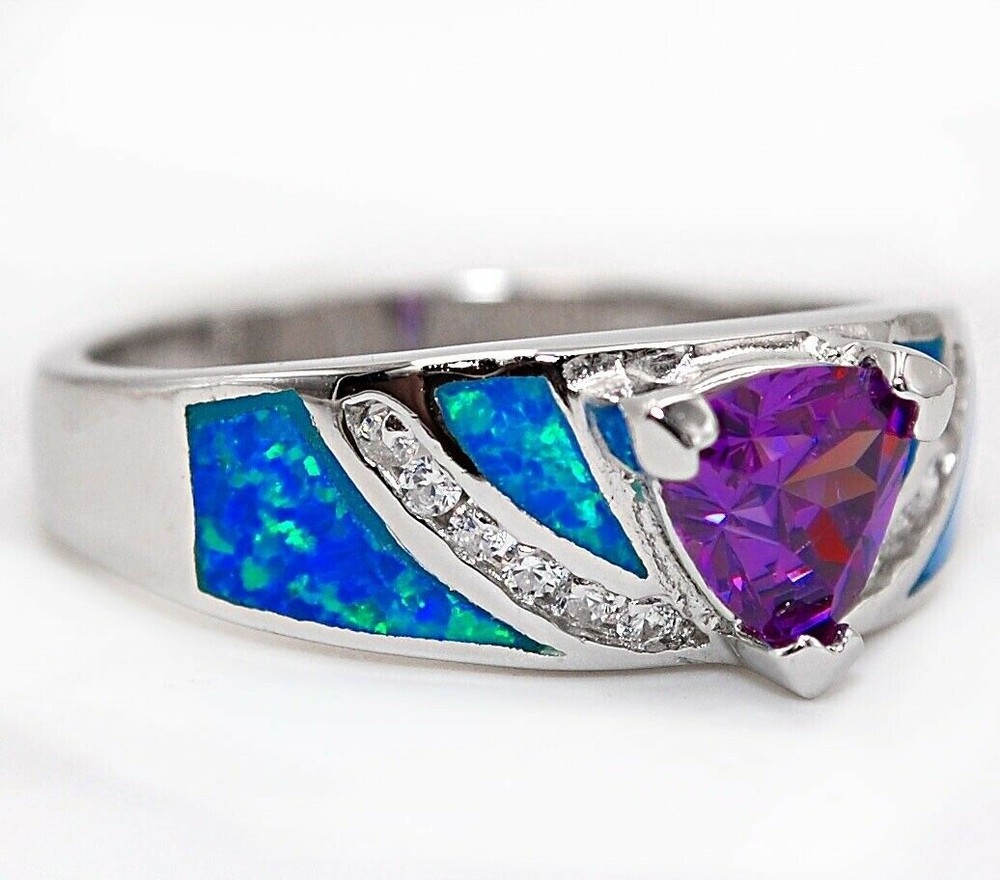 Band Width: Not Applicable Main Stone Treatment: Not Enhanced Base Metal: Sterling Silver, 925 parts per 1000 Gemstone Clarity Grade: Eye Clean Type: Ring Cut Grade: Excellent Material: Gemstone Country of Origin: Thailand Metal: Sterling Silver Country/Region of Manufacture: Thailand Certification: Not Applicable Number of Diamonds: Not Applicable Metal Purity: 925 Brand: Handmade Occasion: Anniversary/Engagement/Birthday/Confirmation/Communion Features: Nickel-Free Colored Diamond Intensity: Not Applicable Color: Blue Theme: Fashion & Costumes Number of Gemstones: Not Applicable Diamond Color Grade: Not Applicable Main Stone Color: Purple Style: Charm, Cocktail Setting Style: Prong Total Carat Weight: 1 Main Stone Shape: Trillion Diamond Clarity Grade: Not Applicable Secondary Stone: Opal Main Stone: Amethyst Ring Size: 8