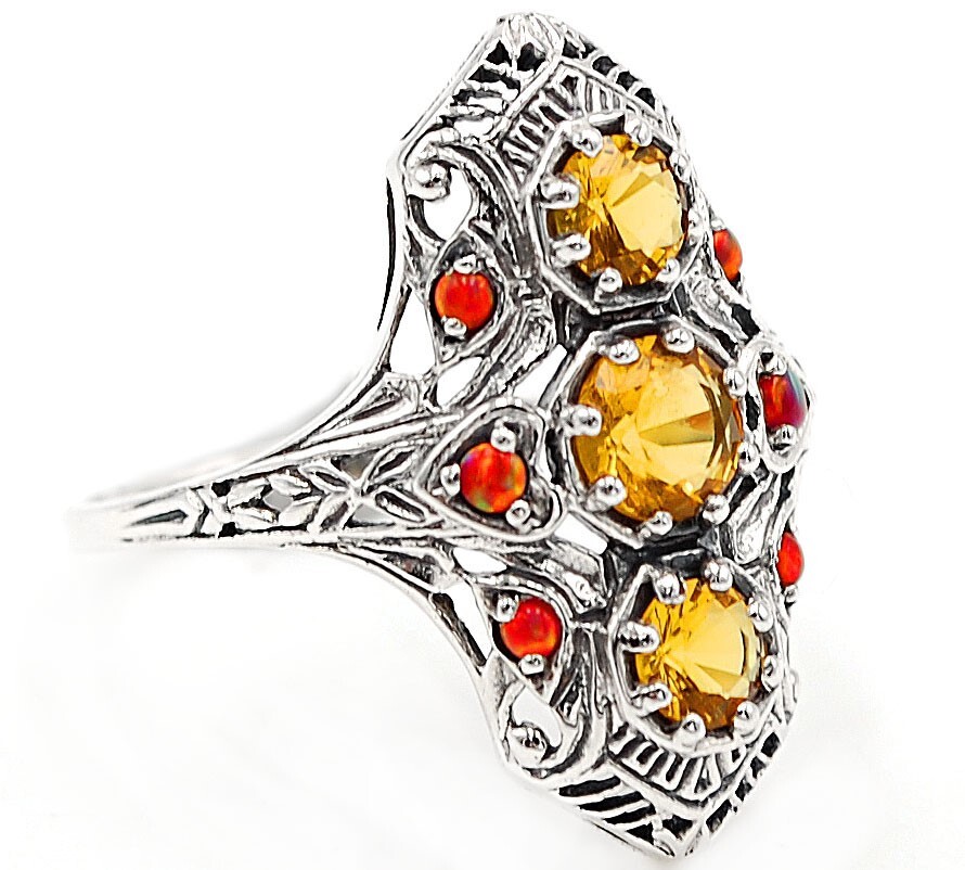 Menu Store FAQ Payment Shipping returns Feedback CONTACT US SHOP BY RING SIZE 4 4.5 5 5.5 6 6.5 7 7.5 8 8.5 9 9.5 10 10.5 11 11.5 All STORE CATEGORIES 99 cent daily deals Auctions Ending Soon New Arrivals Buy it now Rings Pendants Earrings Necklace Bangles & Bracelets POPULAR STONES Aquamarine Ruby Sapphire Pink Sapphire Emerald Topaz Opal Pearl Amethyst Blue Topaz Kunzite Herkimer Diamond Hand Carved Fossils Citrine Garnet Alexandrite Natural Rough Two-Tone Sterling Silver Store Newsletter Add old-english-silver to your Favorites and receive our e-mail newsletters about new items and special promotions. General Interest Sign Up Gemstone : Natural citrine & red fire opal Metal : Genuine 925 Solid Sterling Silver Total Carat Wt : 1 Total Gram Wt : 5 Ring Sz : 7 Shipping & Handling