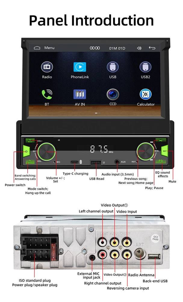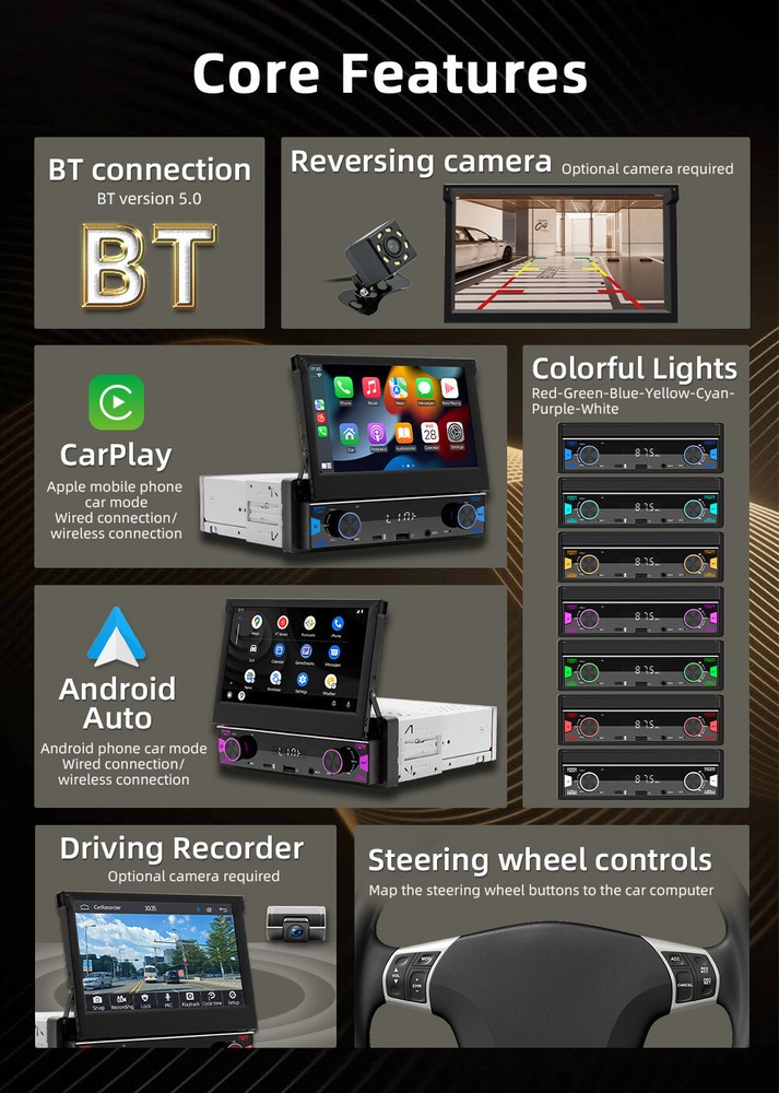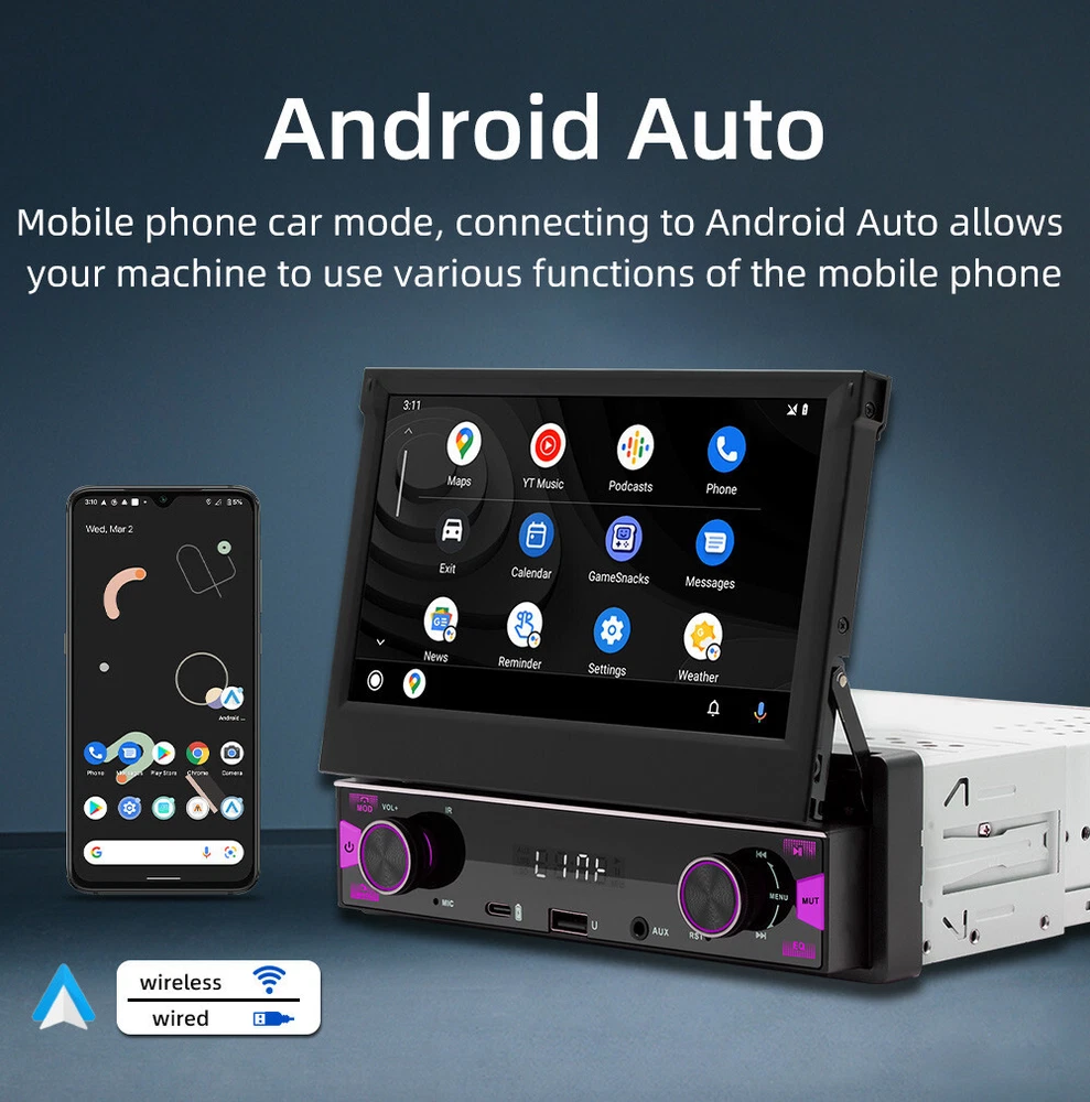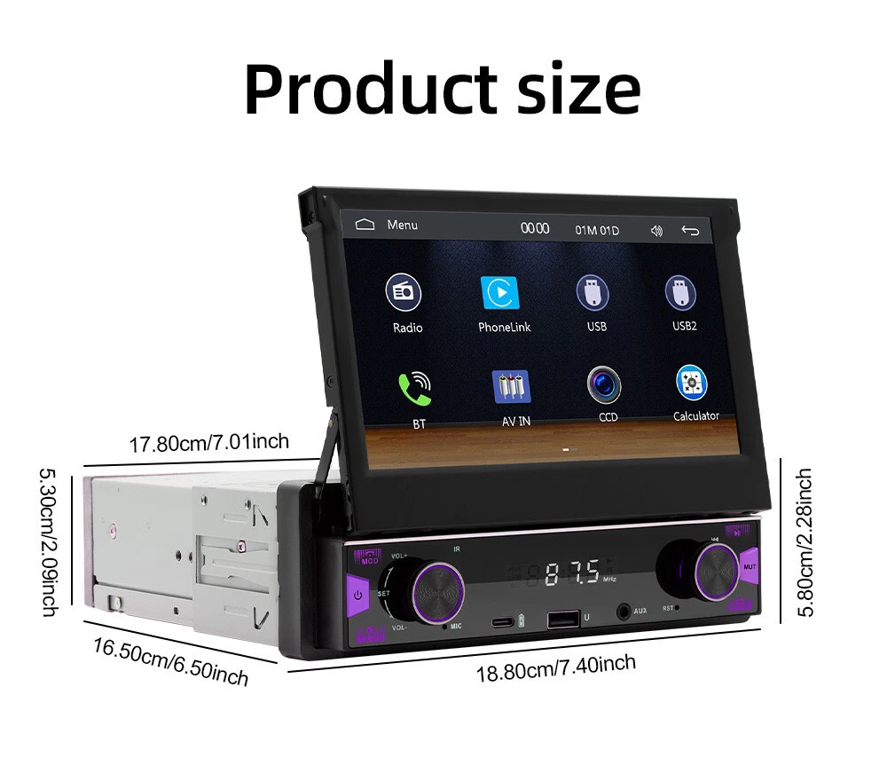 Product View Detail 1 Din Car Radio 7" Retractable Screen Multimedia Video Player MP5 Car Audio Video Bluetooth Head Unit Support For Apple Carplay Android Auto Note:Please check size whether fit for your car before purchasing !!! Basic parameters Type: Car MP5- Manual retractable screen (capacitive screen) System: Overview Melis System Software solution: F133 Radio frequency: FM 87.5~108.0MHz AM 522~1620KHz (switchable between radio frequencies in China, America 1, America 2, Japan, Russia, Middle East, and Europe) Radio IC: 9636 Amplifier IC: CD7388CZ Output power :60Wx4 Working voltage: 12~14.4V Working temperature: -10~60 ℃ Bluetooth version: 5.1 (default name: SWL-BT) WiFi frequency:can be selected as 2.4G, 5.2G, or 5.8G (automatically switched according to the frequency band of the hotspot connected to the phone, connected) ,Used for Android AUTO and Apple CARPLAY Performance parameters CPU: F133 Running memory: 533M Display resolution: 1024x600 Screen size: 7 inches+LED digital tube Installation size: 178x53MM Shell size: 188x58MM Host depth: 165MM Functional parameters Mobile Internet : supports: √, does not support: × For Apple CarPlay: wired √, wireless √; Android Auto: wired √, wireless √; IPhone screen mirroring: wired √, wireless √; Android screen mirroring: wired √, wireless √ Screen rotation: not supported Reverse image: support (optional camera) Video playback warning: support Steering wheel control: supports button learning Video output: support USB interface: front USB 2.0+front TYPE-C charging+rear USB 2.0 TF card : not supported External microphone input: support (rear, optional external microphone configuration) Reset button: support The dash cam: supports external USB dash cam (optional camera) Audio output: 2 channels (left channel+right channel) Video output: 2 channels AUX input: before audio input (left channel+right channel) Video input: 1 channel Reverse video input: 1 channel Audio format :MP3/AAC/APE/OGG/M4A/RA/WAV Video format :H263/H264/H265/DIVX HD/AVI/FLV/MKV/MPEG/MP4/WMV9/VC/ASF/TS/QT Image format: JPEG/PNG/BMP/GIF/TIFF Language parameters: English/Chinese/French/German/Arabic/Italy/Japanese/Portugal/Russian/Spanish/Hebrew/Polish/Turkish/Czech/Korean/Indonesian/Thai/Ukrainian/Greek/Dutch Factory password: 113266 Accessories 1. Host 2. Manual 3. Power cord 4. Remote control 5. Disassembly key (accessories, manual, packaging may be updated from time to time, subject to actual receipt) Basic functions 1. Radio 2. Read USB flash drive (audio/video/image) 3. AUX function 4. Bluetooth function 5. RCA audio output can be connected to a subwoofer 6. Reverse rearview function 7. Video output function, video input function 8. Original steering wheel learning function 9. Colorful lights 10. Wired and wireless phone screen mirroring, wired and wireless Apple CarPlay, wired and wireless Android AUTO 11. RDS function 12. Power supply positive and negative polarity reverse protection function Shipping Policy Payment Method Returns Policy Shipping Policy Payment Method Returns Policy Copyright © 2017 DataCaciques Home Payment Shipping About us Contact us BCSMMCAR Store Categories Store Categories Other Product View Detail 1 Din Car Radio 7" Retractable Screen Multimedia Video Player MP5 Car Audio Video Bluetooth Head Unit Support For Apple Carplay Android Auto Note:Please check size whether fit for your car before purchasing !!! Basic parameters Type: Car MP5- Manual retractable screen (capacitive screen) System: Overview Melis System Software solution: F133 Radio frequency: FM 87.5~108.0MHz AM 522~1620KHz (switchable between radio frequencies in China, America 1, America 2, Japan, Russia, Middle East, and Europe) Radio IC: 9636 Amplifier IC: CD7388CZ Output power :60Wx4 Working voltage: 12~14.4V Working temperature: -10~60 ℃ Bluetooth version: 5.1 (default name: SWL-BT) WiFi frequency:can be selected as 2.4G, 5.2G, or 5.8G (automatically switched according to the frequency band of the hotspot connected to the phone, connected) ,Used for Android AUTO and Apple CARPLAY Performance parameters CPU: F133 Running memory: 533M Display resolution: 1024x600 Screen size: 7 inches+LED digital tube Installation size: 178x53MM Shell size: 188x58MM Host depth: 165MM Functional parameters Mobile Internet : supports: √, does not support: × For Apple CarPlay: wired √, wireless √; Android Auto: wired √, wireless √; IPhone screen mirroring: wired √, wireless √; Android screen mirroring: wired √, wireless √ Screen rotation: not supported Reverse image: support (optional camera) Video playback warning: support Steering wheel control: supports button learning Video output: support USB interface: front USB 2.0+front TYPE-C charging+rear USB 2.0 TF card : not supported External microphone input: support (rear, optional external microphone configuration) Reset button: support The dash cam: supports external USB dash cam (optional camera) Audio output: 2 channels (left channel+right channel) Video output: 2 channels AUX input: before audio input (left channel+right channel) Video input: 1 channel Reverse video input: 1 channel Audio format :MP3/AAC/APE/OGG/M4A/RA/WAV Video format :H263/H264/H265/DIVX HD/AVI/FLV/MKV/MPEG/MP4/WMV9/VC/ASF/TS/QT Image format: JPEG/PNG/BMP/GIF/TIFF Language parameters: English/Chinese/French/German/Arabic/Italy/Japanese/Portugal/Russian/Spanish/Hebrew/Polish/Turkish/Czech/Korean/Indonesian/Thai/Ukrainian/Greek/Dutch Factory password: 113266 Accessories 1. Host 2. Manual 3. Power cord 4. Remote control 5. Disassembly key (accessories, manual, packaging may be updated from time to time, subject to actual receipt) Basic functions 1. Radio 2. Read USB flash drive (audio/video/image) 3. AUX function 4. Bluetooth function 5. RCA audio output can be connected to a subwoofer 6. Reverse rearview function 7. Video output function, video input function 8. Original steering wheel learning function 9. Colorful lights 10. Wired and wire