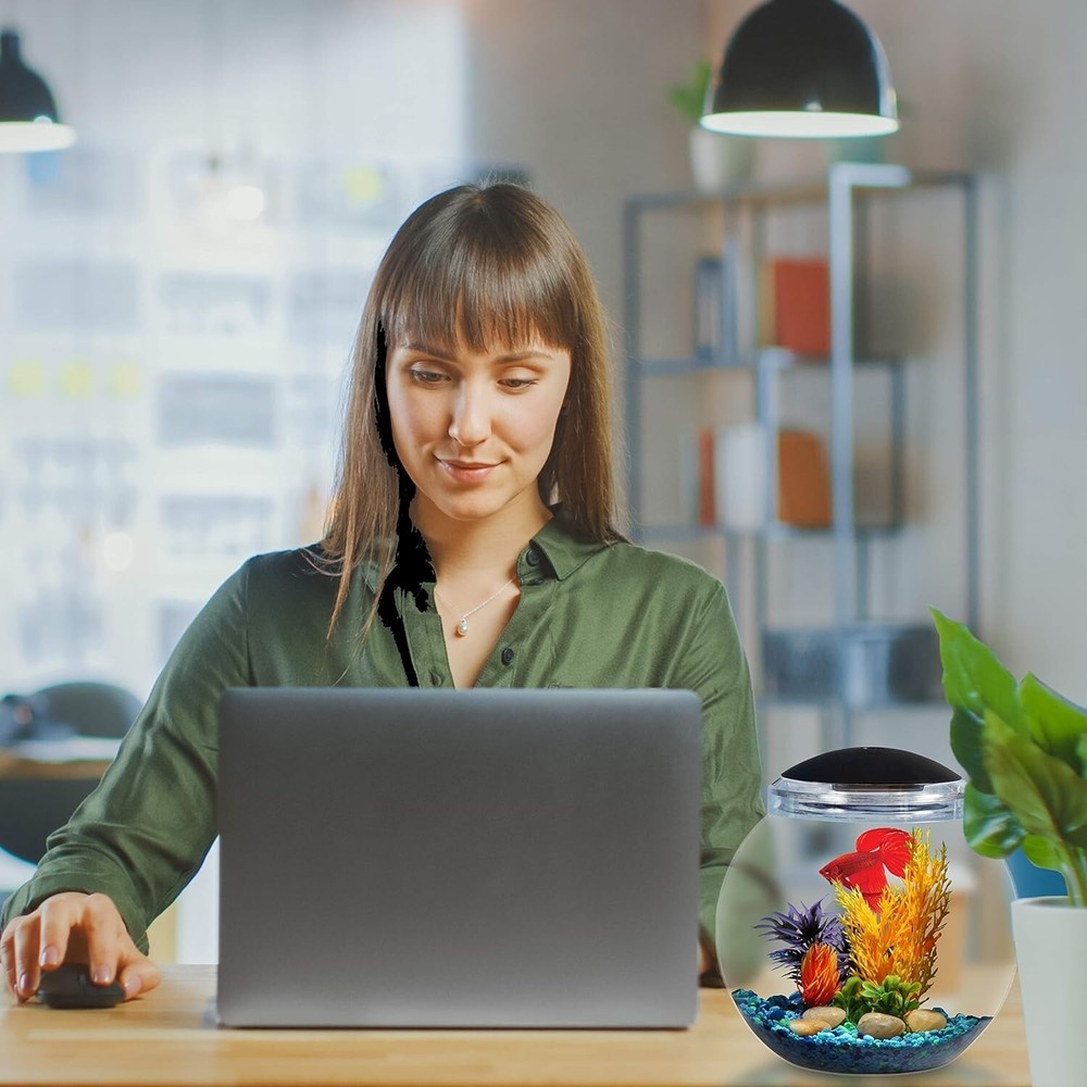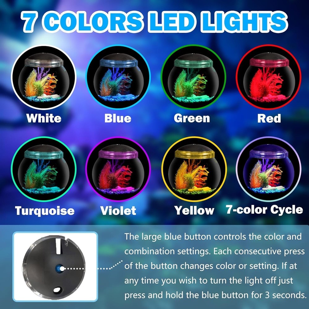 1-Gallon Globe Fish Bowl, Impact- Resistant Plastic Aquarium Starter Kits with LED Lighting, Buit-in Timer, Crystal-Clear Clarity, Desktop Fish Tank for Home Décor Aquarium Starter Kit - This 1 gallon fish tank is suitable for a betta fish, a pair of shrimp, snails or small goldfish. Whether you are creating a small aquarium in your home or want to give your children a close-to-nature experience, our aquarium tank is perfect for you. 7 Color LED Light - With colorful 7-color LED lighting, it provides comfortable and warm light for your aquarium creatures, enhancing the ambiance with charming light and shadow effects in the fish tank. Built-in Timer - The convenient timer enables easy control of the lighting time. Set your LED light to come on at the same time every day, offering the option to keep the light on for 2 hours, 4 hours, or Continuous On, ensuring ample light for your aquarium world at the right time. Durable Construction - Made of impact-resistant plastic, this fish bowl eliminates the worry of accidents and debris that is common with traditional glass material, providing you with peace of mind for your fish keeping environment. Superior Viewing Angle - 360° panoramic viewing brings the best visual effect and crystal clarity, enabling you to enjoy the world of desktop fish tank from any angle. Compact Design - Measuring 8 inches in diameter and 9 inches in height, maintaining a stylish and compact design, perfectly adapting to your home environment. 1-Gallon Fish Bowl includes energy-efficient LED lighting with 7 color choices plus 4 transitioning and color combinations you can choose depending on time of day or to enhance your viewing pleasure. Yes, watching an aquarium can help with tension and significantly reduce your stress levels, just imagine watching a beautiful betta fish swimming gently back and forth, all the while enhancing calmness, tranquility, and positive feelings. Perfect for home, dorm, or office. Gravel and decor sold separately. Uses 2 AA batteries (not included). Dimensions: " DIA x " H. This fish bowl is totally a W.