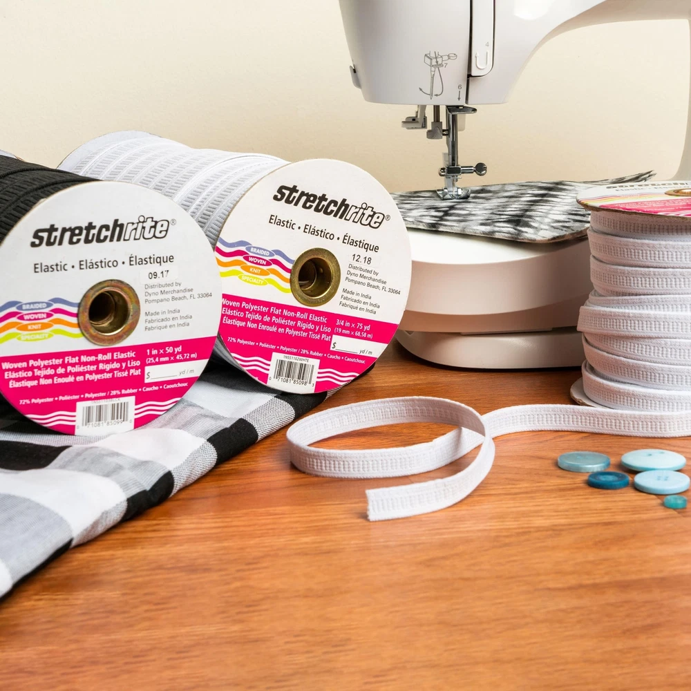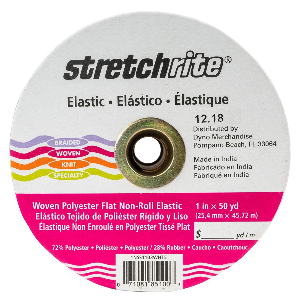Each spool contains 50 yards of white elastic measuring 1-inch wide 72% polyester and 28% rubber Elastic is perfect for waistbands in skirts, slacks, shorts and pants Ribbing prevents rolling and adds body to waistband construction Stretches easily and resumes its original shape and length