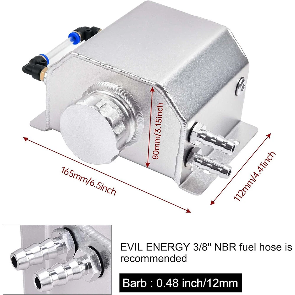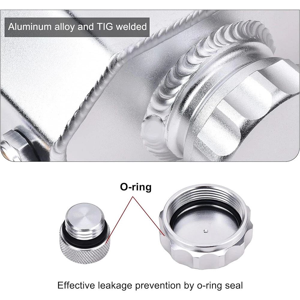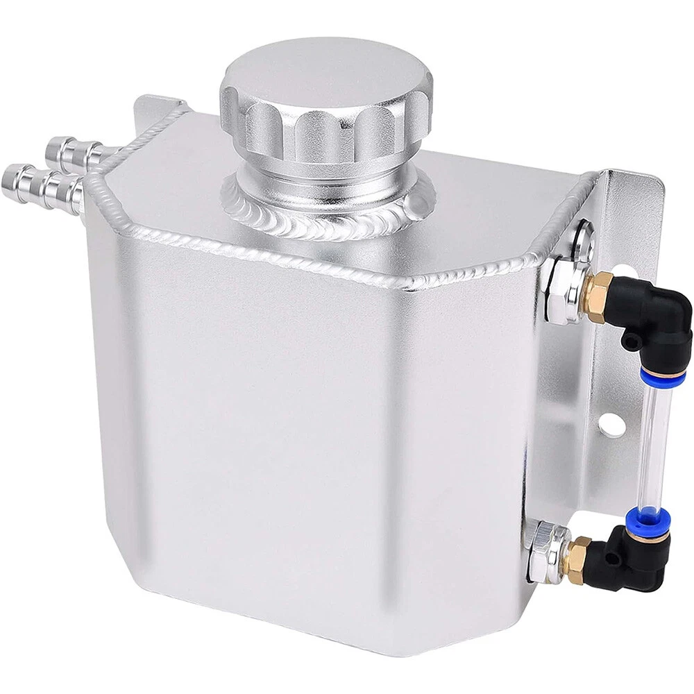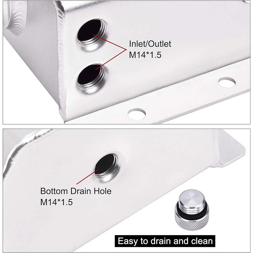 [Size] The Male to barb fitting thread size is M14*1.5.can work with 3/8" ID fuel hose.Overflow tank storage volume1L. [Fitment]Universal coolant reservoir tank, fit for mostly of vehicles.Please measure before purchase to make sure there is enough space for installation. [Note]Tight closed cap, fully TIG welded and thread come with O-ring gasket, let coolant reservoir can keep a good closed environment and prevent coolant leakage.It is high recommended use Tetflon tape when install, it can enhance airtightness prevent interface leakage. [Function]When the coolant pressure in the radiator exceeds the pressure cap setting, the coolant is sealed through the pressure cap and flows through the overflow tube into the radiator coolant overflow tank.Bottom port is radiator overflow Universal coolant reservoir tank, fit for mostly of vehicles.Please measure before purchase to make sure there is enough space for installation. Feature: Capacity:1L Pipe ID :3/8" Thread size:M14*1.5 Size:165mm/6.5inchx80mm/3.15inchx112mm/4.41inch Package: Coolant Overflow Tank * 1 Hollow Nut & Pneumatic Connector *2 Hose Connector *2 Aluminium Cap *1 1L Universal Coolant Overflow Tank,Reservoir Expansion,Aluminum Coolant Radiator Expansion Tank Universal coolant reservoir tank, fit for mostly of vehicles 1L storage capacity It can enhance airtightness and prevent interface leakage Please measure before purchase to make sure there is enough space for installation High Quality & Durable Color: Silver Material: Aluminum alloy Anodized polished and durable,it has the advantages of good corrosion resistance,high hardness,wear resistance and heat resistance Level indicator Level indicator,easy to read level Bottom drain valve with o-ring.Easy to clean,seals well and reusable constantly When the coolant pressure in the radiator exceeds the pressure cap setting, the coolant is sealed through the pressure cap and flows through the overflow tube into the radiator coolant overflow tank