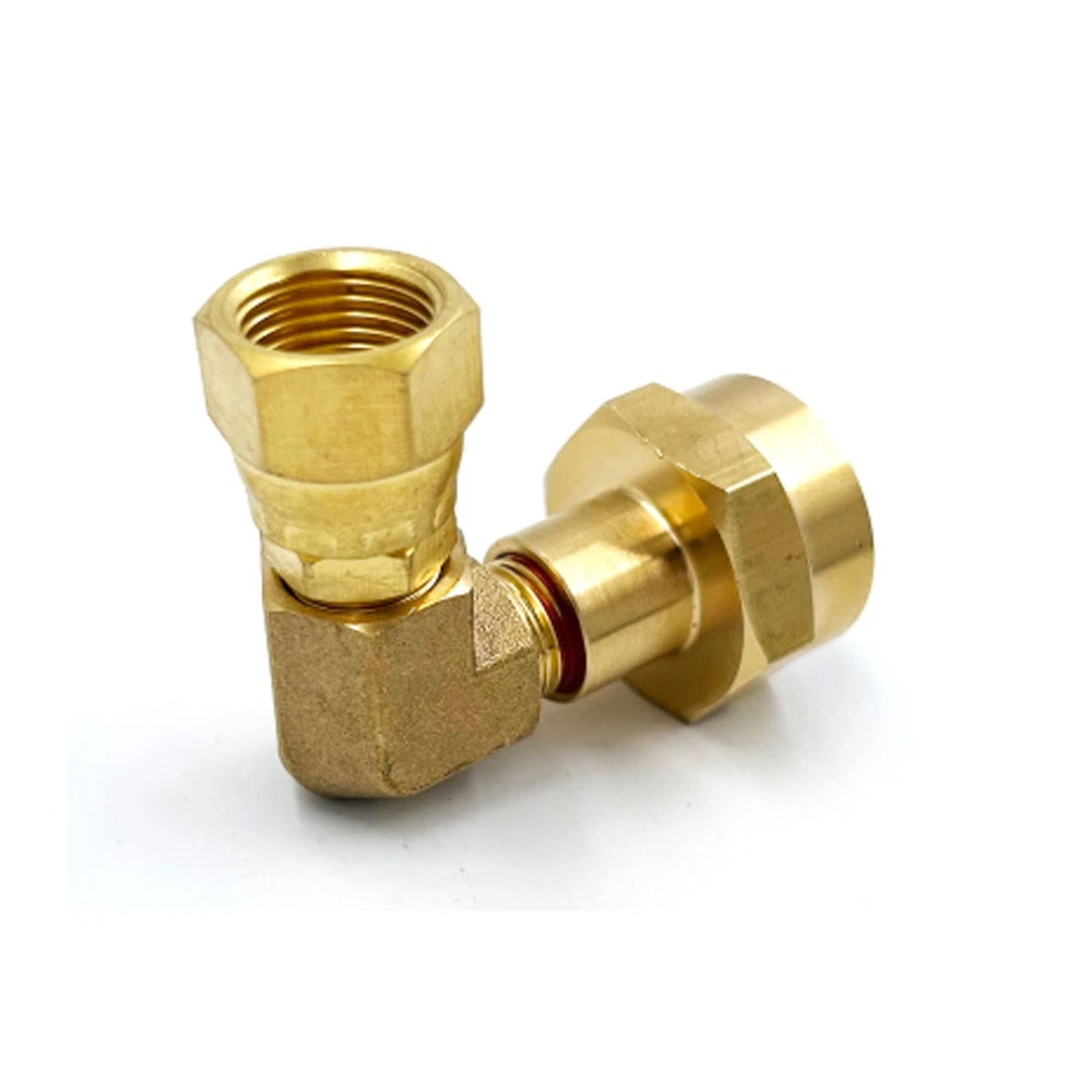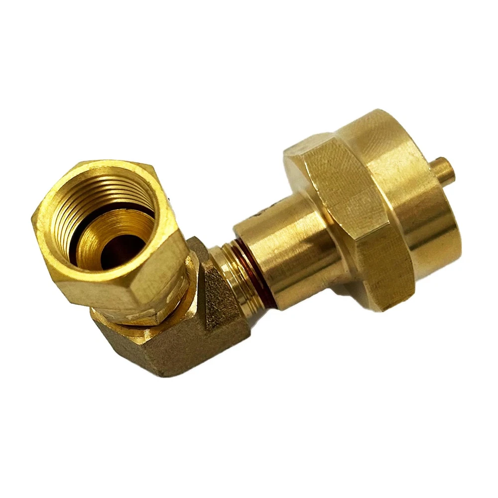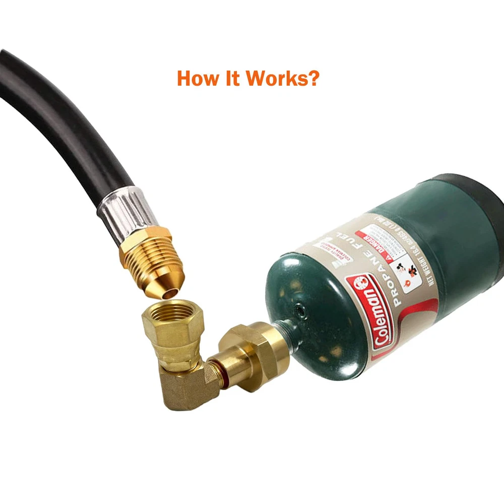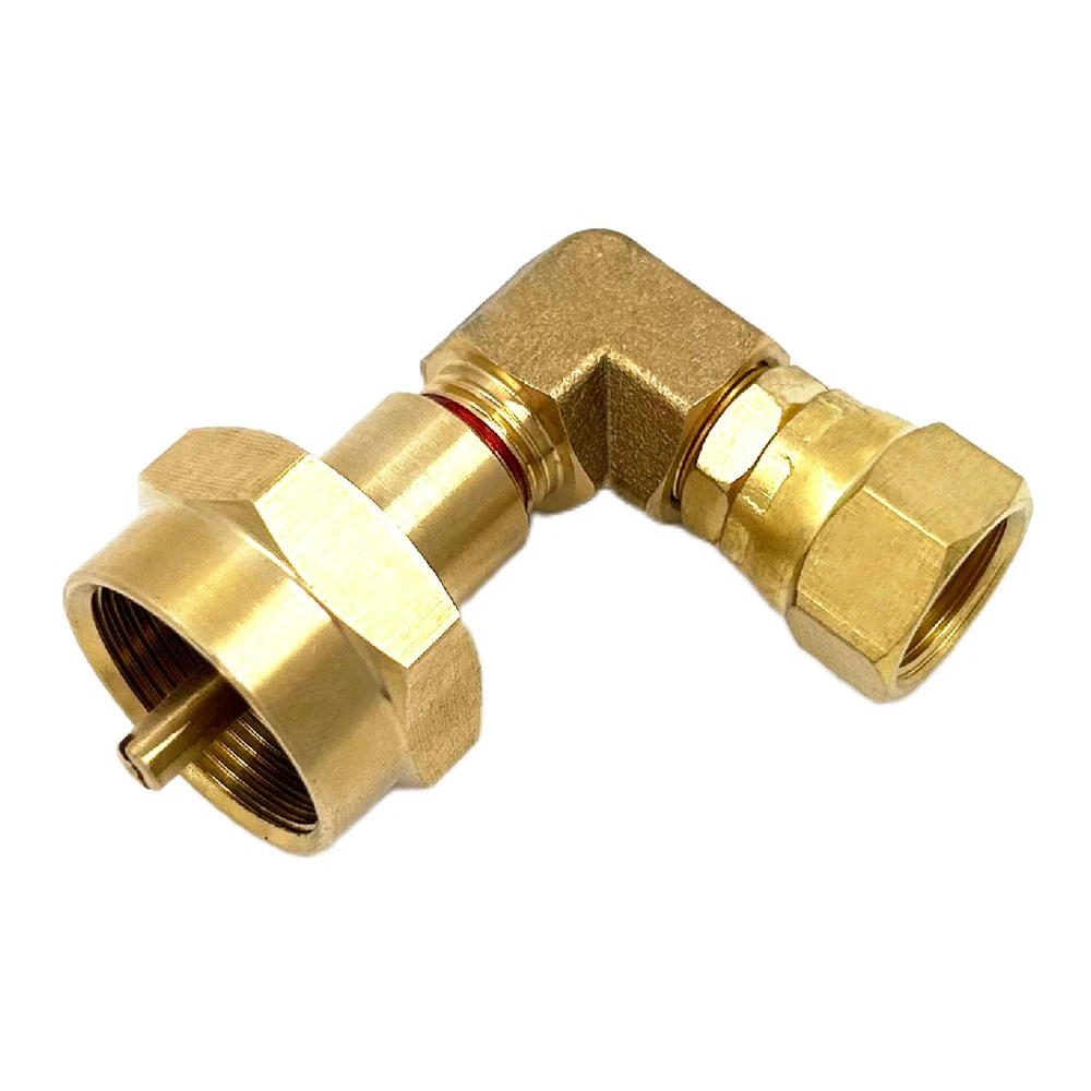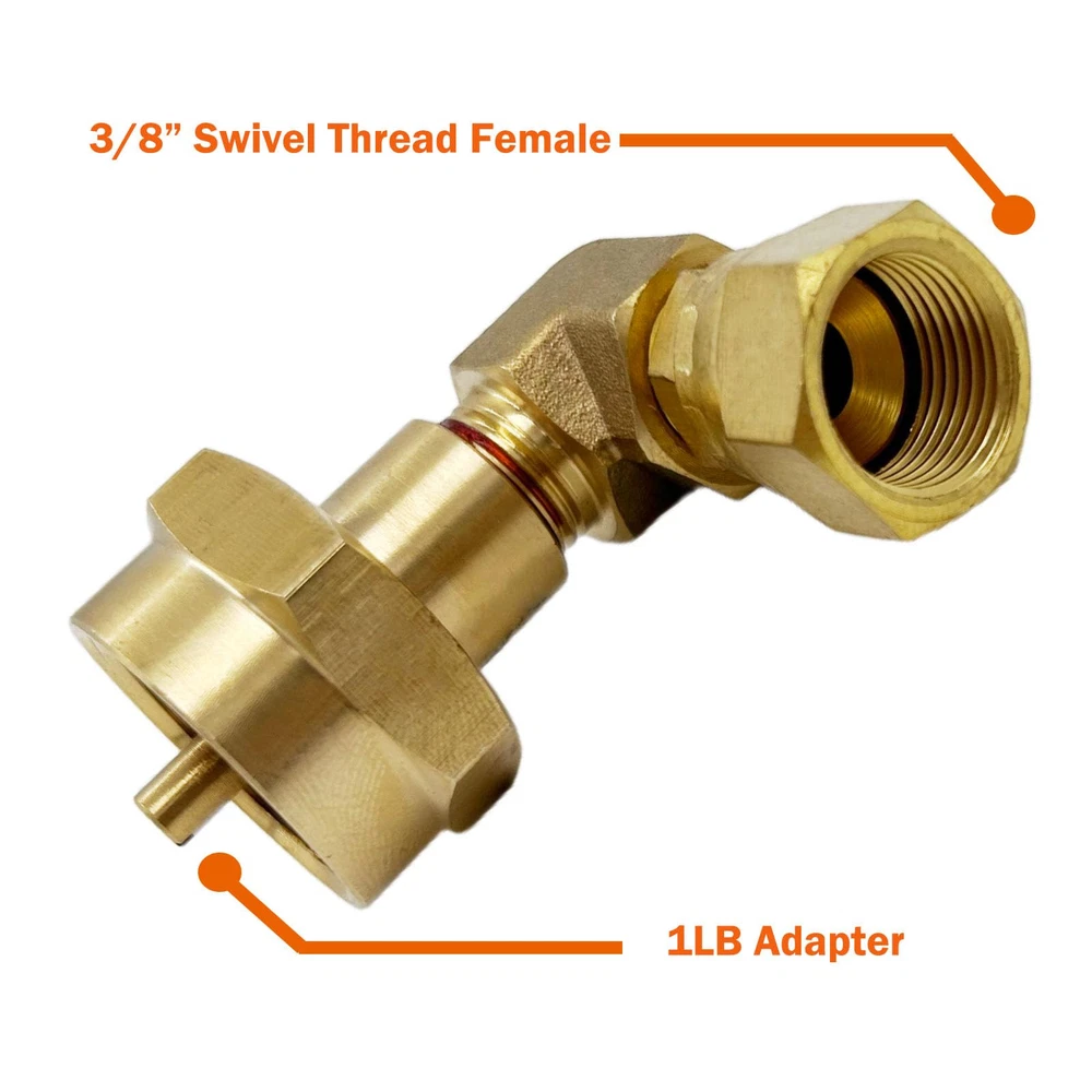 - Solid Brass Material Propane Gas Water Oil 90 Degree Elbow Connector Coupling Fittings For BBQ Grills, Torch, And Fire Pits Connector with 3/8" Male Flare Thread. - Elbow Design is Helping You to Save Much Space And Easy Handle your Torch during Use. - Size: Inlet Hook the Standard Mapp gas, or Green Bottle Gas with Female 1"-20UNEF Thread. And Exits Comes with 3/8" Swivel Female, The Nuts Can be Adjust Any Installation Directions. - Widely Used for Any Gas Appliance, Not Good for Water Application. Great Tool Fittings for all gas grill, heater with 3/8" Female Flare thread to a 90 degree elbow converter - You can Easy change your propane grill with 20lbs or 50lbs regulator connection to a small bottle gas supply without low cost.