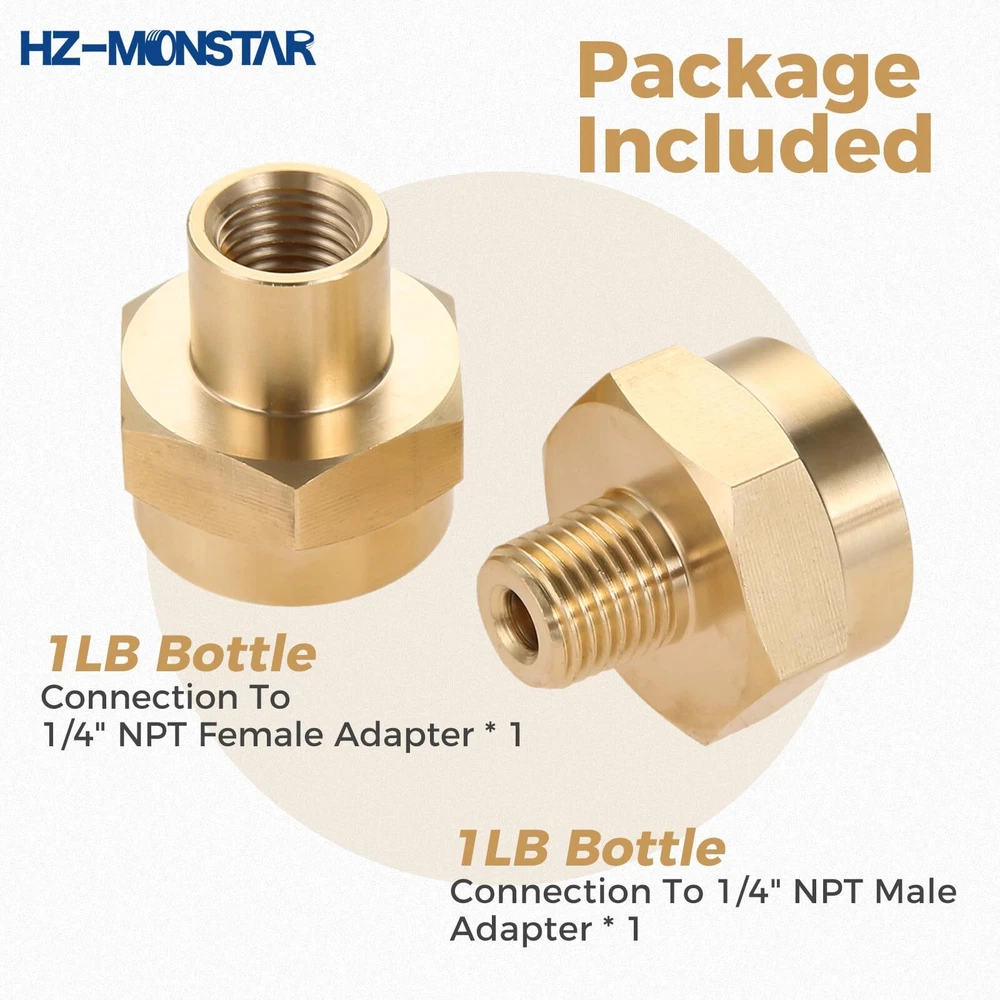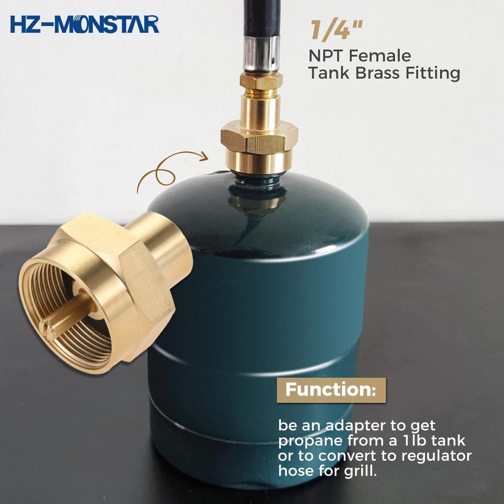 [Widely Use]---Great for tailgaters, caterers, campers and anyone that cooks on the grill/has cookouts. [Size]---1/4 Male Pipe Thread x 1"-20 Female Universal Fitting, connect your propane fitting or the QCC refill adapter. 1/4" NPT Female thread, can be used to connect male 1/4" NPT thread adapters. [Function]---Great for 1-lb tanks. Can be an adapter to get propane from a 1lb tank or to convert to regulator hose for grill. [Premium Quality]---High quality solid brass construction makes it corrosion resistant. [Package Incude]---1/4" NPT female tank brass fitting x 1, 1/4" male NPT thread x 1.