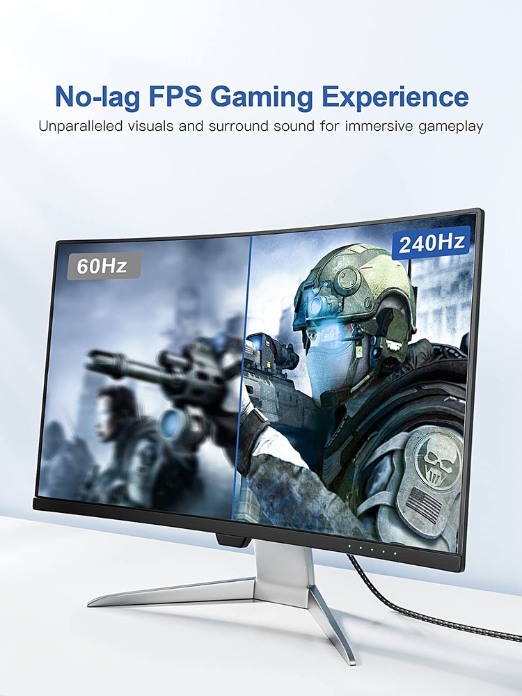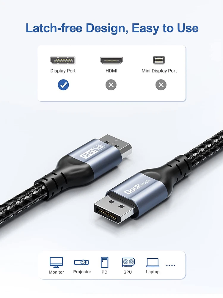 The birth of each high-quality cable is the crystallization of the hard work of 's strong engineering team. From the stylish of the appearance to the high-end durability of the material, it is controlled strictly. Only the items that have passed tens of thousands of performance tests will be put into the market and serve global customers! DisplayPort 1.4 is born for games, HDTV, large screen monitors and projector screens. In order to further meet your requirements for games, meeting, home theater, home officeand other scenes through external displays. - dp to dp 1.4 -Specifications: DisplayPort 1.4 Specs, 8K@60Hz -Connector Type: DisplayPort to DisplayPort (Both ports are NOT HDMI) -Backwards Compatible: DisplayPort 1.3 / 1.2 / 1.1 / 1.1a / 1.0 -Conductor Material: 32AWG Tinned Copper (Top material) -Bandwidth: HBR3 Rated, Supports up to 32.40 Gbit/s -Features: Supports HBR3 / HDCP 2.2 / HDCP1.4 / HDR / DPCP 1.0 / DP++ / Stereoscopic 3D video / Multi-stream transport (MST) / DSC -Supports: FEC Forward Error Correction and maximum 32 audio channels Note: please check the connector interface of your source and display devices (such as graphic card and monitor) before purchase, For 8K video support, it requires Both ports are DisplayPort. *For 8K video support, it requires both your computer and monitor have 8K video capacity. *This DisplayPort 1.4 cable supports 8K and is backward compatible with 5K / 4K / 2K / 1080p displays, ready to prepare for your future 8K displays. Refresh Rate: 8K (7680 x 4320) @ 60Hz / 30Hz 5K (5120 x 2880) @ 60Hz / 30Hz 4K (4096 x 2160) @ 144Hz / 120Hz/60Hz/30Hz 2K (2560 x 1440) @ 240Hz / 165Hz/144Hz/120Hz/60Hz/30Hz 1080p (1920 x 1080) @ 240Hz / 165Hz/144Hz/120Hz/60Hz/30Hz 【8K Ultra DP to DP 1.4 Cable】latest 8K DP Cable [NOTE: It is 2 display port male ends, NOT HDMI] supports high resolutions 8K(7680x4320)@60Hz, 5K(5120x2880)@60Hz, 4K@144Hz, 2K@240Hz, 1080P@240Hz, Dynamic HDR & HDCP 2.2. With 32.4Gbps data transmission speeds. DP 1.4 is the latest technology, which has qualitatively improved the visual experience of video, and is the mainstream trend in the future. 【Ideal for FreeSync/G-SYNC gaming monitors】The DisplayPort 1.4 Cable can provide higher bandwidth, HBR3 supports 32.4 Gbps of bandwidth. High refresh rate and high resolution, Maximize the performance of your graphics card and monitor, No motion blur, screen tearing or flickering. Dynamic HDR can optimize the game's dark picture and enhance the details, especially in FPS, 3A masterpieces and MOBA games, providing the best gaming experience for all game lovers. 【Great Choise for Quality Durability 】Display Port cable 1.4 is made of 32AWG tinned copper with triple shielding to ensure stable signal transmission. Tinplate plated connectors and Aluminum shell has stable heat dissipation while extending product life. The nylon braid design makes the cable more flexible and light to bend, preventing the cable from fraying. 【Widely Compatible】Compatible with all DP lower version compatible devices, and has higher bandwidth, refresh rate and better gaming experience. Compatible with Samsung odyssey G7 G9 CHG90 CRG9, Ben Q, Dell, LG, HP, ASUS, Acer, iiyama, Alienware monitors and others. Supports DP, DP++, and DisplayPort++.Works with graphics cards and monitors with display ports (do not use extensions or adapters, signal conversion degrades performance) 【Lifetime Exclusive Customer Service】 has a strong and professional team of engineers to solve the problems you encounter during the use of the product. Our products provide 24-month warranty service and exclusive customer service within 24 hours.