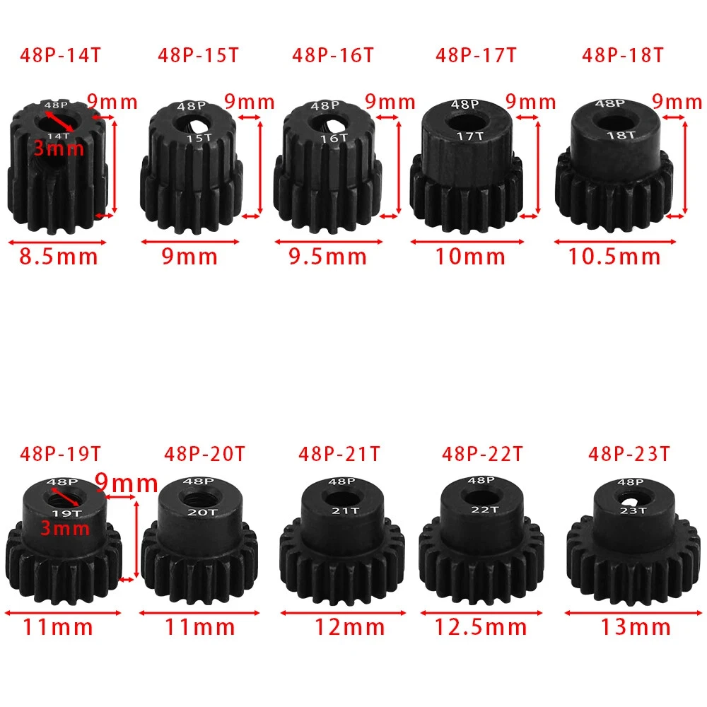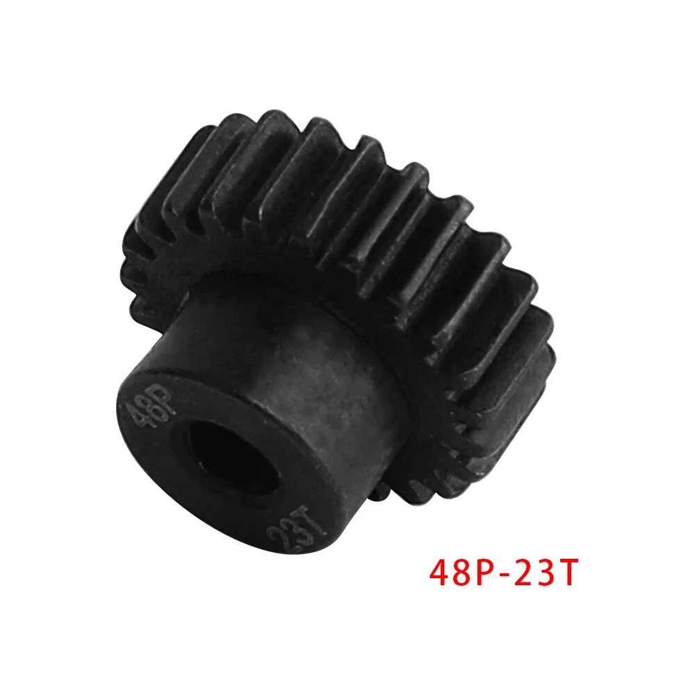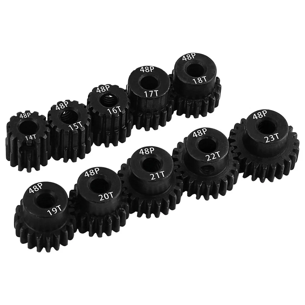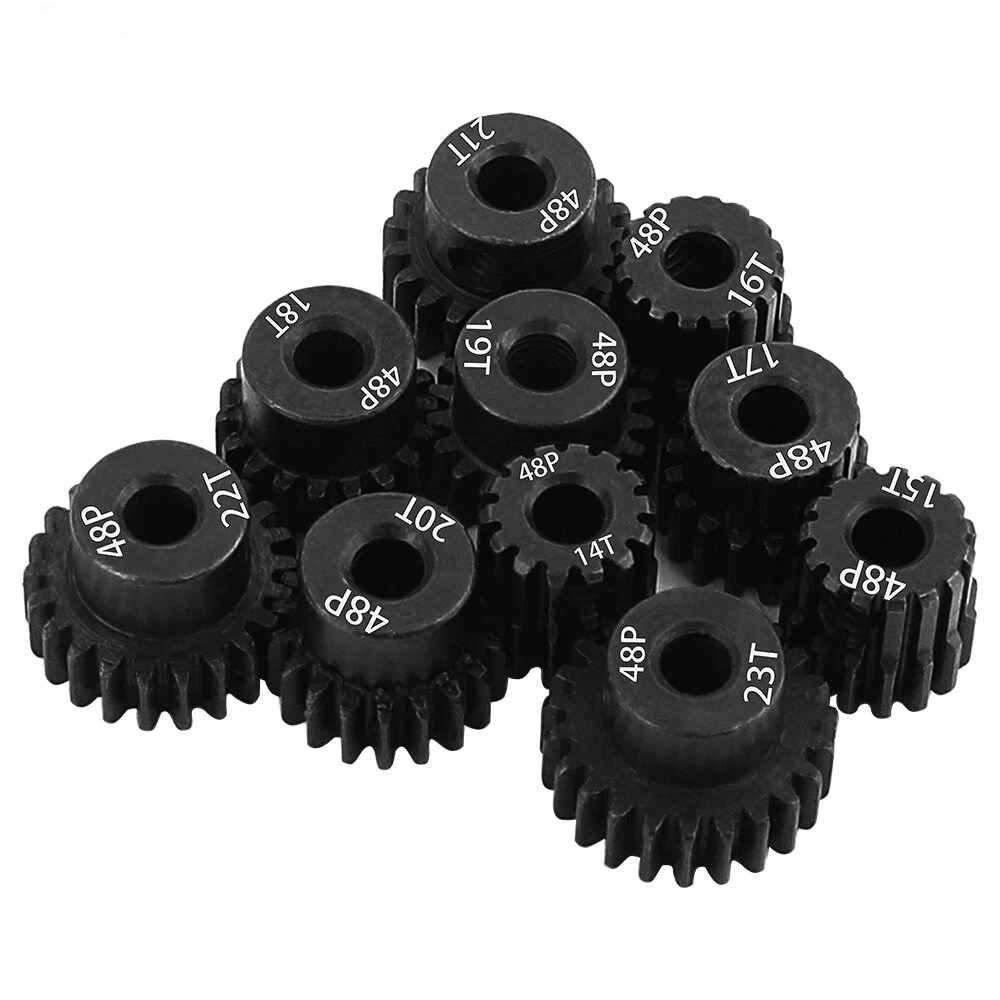 Description: 48P 3.175mm Black Hardened Steel Metal Pinion Motor Gear 14T-23T. Features: Easy installation, long service life and high quality. Hardened Steel Metal surface. Anti-rust treatment on the surface of the gear. Suitable for 1/10 RC model car 3.175mm shaft brushless brush motor. Specifications: Material: Hardened Steel Metal Color:Black Diametral pitch: 48P Teeth: 14T 15T 16T 17T 18T 19T 20T 21T 22T 23T Suitable shaft diameter: 3.175mm Suit for: 1/10 RC Car Brushed Brushless Motor. Package included: 1*48P 3.175mm Motor Pinion Gear