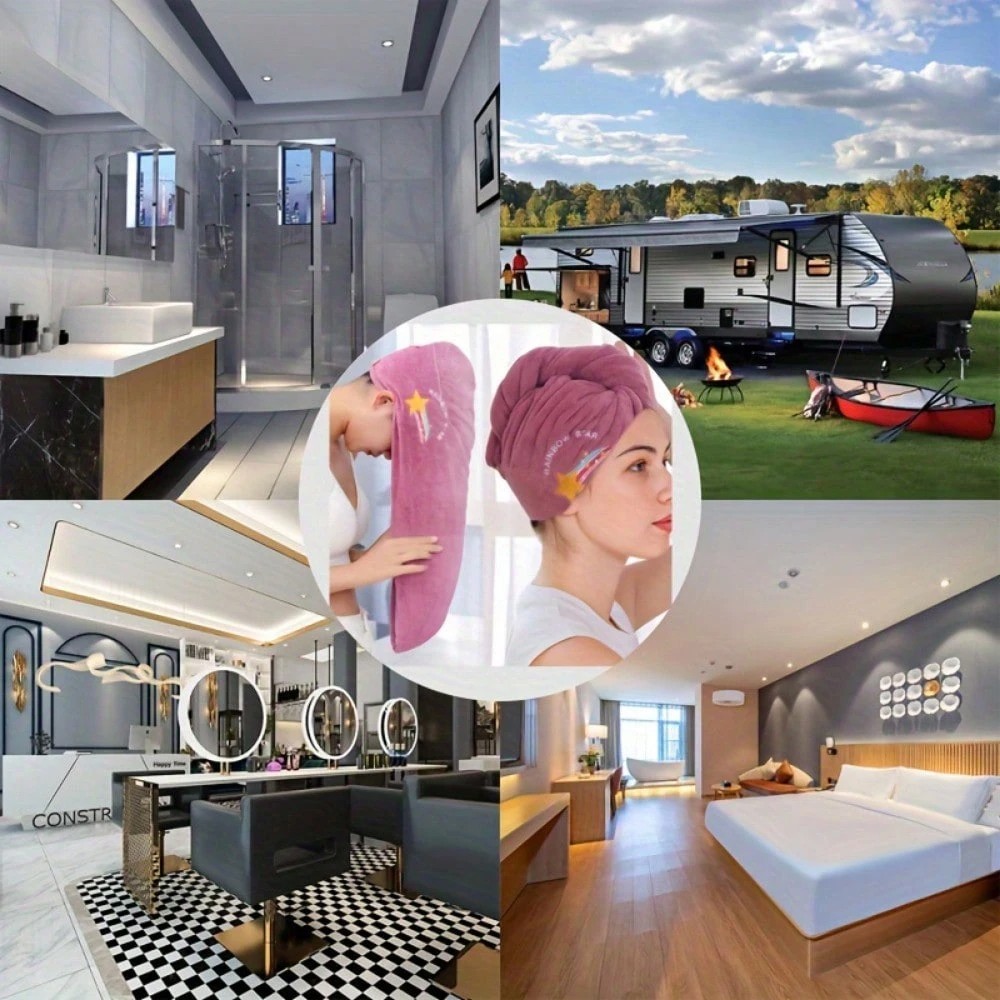 Dry your hair faster and more gently with this 1PC Microfiber Hair Towel Wrap – designed for modern women who value comfort, efficiency, and a touch of style. Made from soft, high-quality 260GSM microfiber knit fabric with a unique modern geometric pattern and space-themed embroidery , this hair turban is perfect for everyday use, travel, or spa days. 🌟 Key Features: Quick-Dry Technology: Super absorbent microfiber speeds up drying time while reducing heat damage from blow dryers. Soft & Lightweight Gentle on hair and scalp, suitable for all hair types including long, thick, curly, or fine hair. Stylish & Unique Design: Modern geometric knit pattern with fun space-inspired embroidery – a cute and cozy addition to your bathroom routine. Secure & Hands-Free: Elastic loop and button closure keeps the towel firmly in place, allowing you to move freely while your hair dries. Multi-Use: Ideal for after shower, spa, gym, swimming, or as part of your summer bathroom accessories and home décor.