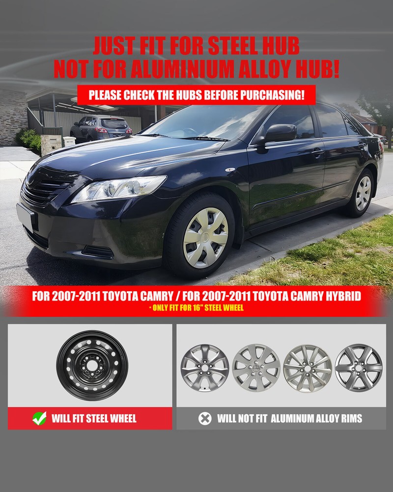 Store Categories Other Car Refrigerator Front Bumper Rear Bumper Fender Flares Inner Fenders Side Steps Running Board A-Pillar Light Mount Brackets Headlights Taillights Fog Lights LED Headlights LED Taillights LED Fog Lights Jeep Chevrolet Ford Toyota Dodge GMC Wheel Covers Features ✴ PERFECT FIT: This wheel hub cap is specifically designed to perfectly fit for 16-inch wheels, ensuring a seamless match and enhanced aesthetics. It complements the overall design of the vehicle, elevating its visual appeal. ✴ HIGH-QUALITY MATERIAL: Constructed from high-quality materials, this wheel hub cap guarantees durability and longevity. It withstands various road conditions and environmental factors encountered during daily driving, maintaining its pristine condition. ✴ EASY INSTALLATION: Installing this wheel hub cap is a breeze and requires no specialized tools or modifications. It comes with a user-friendly system, allowing for a hassle-free installation process by following the provided instructions. ✴ PROTECTIVE FUNCTION: Besides its aesthetic appeal, this wheel hub cap serves as a protective barrier for the wheels. It prevents scratches and potential damage caused by stones, debris, or other objects, safeguarding the wheel's surface. ✴ AFTER-SALES SERVICE: If There Is a Loss of Product Parts, or Any Parts of The Problem, We Can Provide After-Sales Service, Please Contact Us on The Order Page. Wheel Covers Specification ✴ Type: Hub caps ✴ Number in Pack: 1 ✴ Color: Silver Lacquer ✴ Material: ABS ✴ Compatible Wheel Diameter: 16 in ✴ Finish: Glossy ✴ Installation Type: Snap-On ✴ Model: For 2007-2011 Toyota Camry / For 2007-2011 Toyota Camry Hybrid Wheel Covers Package ✴ 1 Hub cap and 1 retention ring Payment Delivery details Terms of sales About us Contact us Payment We accept PayPal, credit card , Apple Pay & Google Pay etc. Delivery details All items will be shipped within 1-3 business days after payment received, we will try our best to ship out as soon as we can, hope for your understanding. Please double confirm your address and contact information, which will help the delivery faster and more accurately. Note :buyers who purchase international products need to pay import tariffs!!! Terms of sales Professional installation is highly recommended. Any problem of the item please feel free to contact us first , please D o Not leave negative feedback before that, or simply return it within 60 Days in original condition. We will resolve it for you ASAP. About us Any questions please do not hesitate to contact us directly by eBay message . We will reply you within 24 hours asap, thanks for your understanding. Contact us Should you have any problem or require any further information please feel free to contact us . If you are satisfied with our product and service, please kindly leave us a positive feedback. Popular Categories On Mar 14, 2025 at 20:35:13 PDT, seller added the following information: