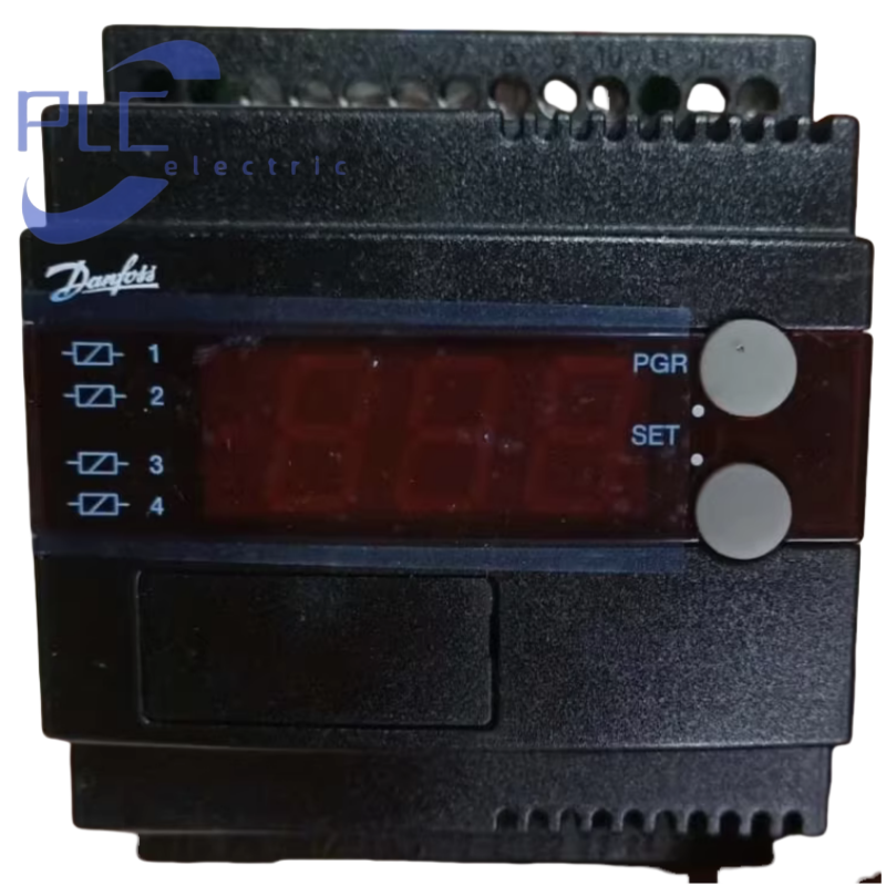 Direct Supply BRAND NEW PARTS Application scenarios : Suitable for refrigeration systems such as small and medium-sized cold storage, commercial refrigerators, and food preservation equipment. It can realize centralized control of core equipment like compressors, evaporator fans, and defrosting devices, and is particularly compatible with systems using common refrigerants such as R134a, R404A, and R507. Core control functions : Multi-equipment linkage control : Supports linkage control of 1 compressor, 1 evaporator fan, and 1 defrosting system. It monitors the storage temperature through temperature sensors (such as NTC or Pt1000), automatically starts/stops the compressor and fan, and triggers defrosting according to preset logic (e.g., timed defrosting, temperature difference defrosting) to ensure refrigeration efficiency and equipment safety. Precise temperature regulation : Adopts a proportional-integral (PI) control algorithm, with a storage temperature control accuracy of ±1℃. It supports a temperature setting range of -50℃ to +10℃ to meet different refrigeration/freezing needs; it also has a temperature deviation alarm function, which outputs an alarm signal through a relay when the temperature is excessive. Protection mechanisms : Integrates functions such as compressor high-pressure/low-pressure protection (requires external pressure switch), motor overload protection, and sensor fault detection (disconnection/short circuit alarm) to prevent equipment damage due to abnormal working conditions; supports setting the minimum downtime of the compressor to avoid frequent start-stop cycles. Defrost management : Allows setting 1-6 timed defrosts per day, with adjustable defrost duration of 0-60 minutes. It supports defrost end temperature detection (to ensure thorough defrosting) and fan shutdown logic during defrosting, applicable to electric heating defrosting or hot gas defrosting methods. Input and output specifications : Temperature input: 1-2 sensor interfaces (compatible with NTC-M 2020 or Pt1000), used to monitor storage temperature and evaporator temperature (for defrost control) respectively. Digital input: 1-2 digital inputs, which can be connected to signals from external pressure switches, door magnetic switches, etc., to realize linkage protection or status monitoring. Output signals: 3 relay outputs (usually SPST, AC250V/5A) to control the compressor, fan, and defrosting device respectively; 1 alarm relay output (AC250V/3A) for abnormal status alarms such as over-temperature and faults. Power supply and environmental parameters : Power supply voltage: AC 230V ±10%, 50/60Hz, with a power consumption of approximately 3VA. Operating environment: Temperature range of -10℃ to +55℃, humidity of 20%-85%Rh (no condensation), protection class IP20. It is suitable for DIN rail mounting in control cabinets (size approximately 120×75×35mm). Configuration and operation : Parameters such as temperature upper/lower limits, defrost cycles, and protection thresholds can be set via panel buttons or dedicated programming tools (e.g., Danfoss Service Tool). It supports parameter locking to prevent misoperation. Equipped with a 3-digit LED digital display for storage temperature and set values, and indicator lights to show operating status (refrigeration, defrosting, alarm, etc.), facilitating on-site monitoring.
