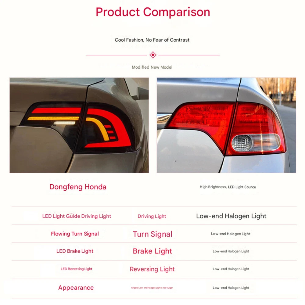 Fitment: For Honda Civic Sedan 2006-2011 Package Includes: 1 Pair (Left Side + Right Side) Taillights Assembly Set Specification : Type: LED Taillights Assembly A few second of Start up Animation Sequential Turn Signal Full LED, No need to purchase additional light bulbs Functions:Running light +Brake light +Turn Signal+Reverse light Housing Color: Black Lens Color:Smoked Operating Voltage: 12V-14V Material:High Quality ABS Plastic+PC+PMMA Waterproof Rate:IP68 Features:DOT-Certifed, Durable, Easy lnstalation, High Quality, OE-Certified, SAE-Cerified, Sealed Assembly, Waterproof, ISO-Certifed, Dustproof And Shurdy