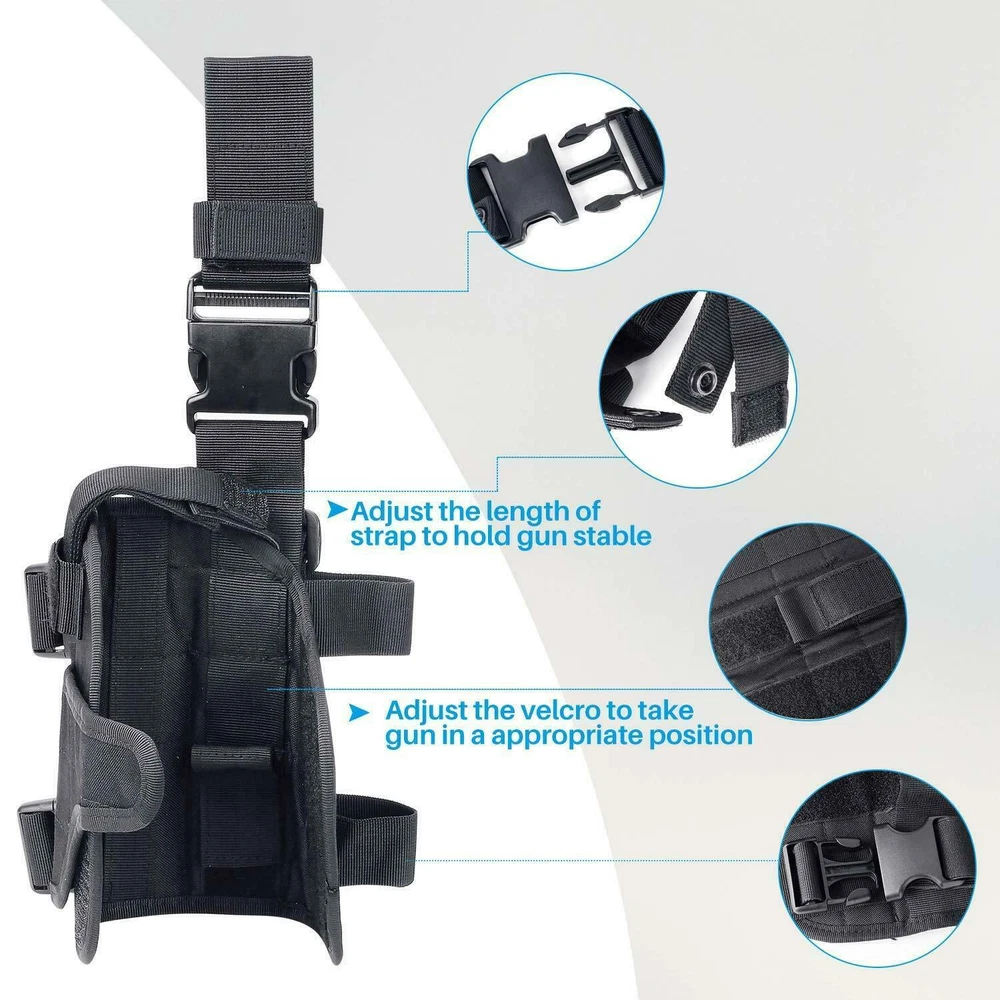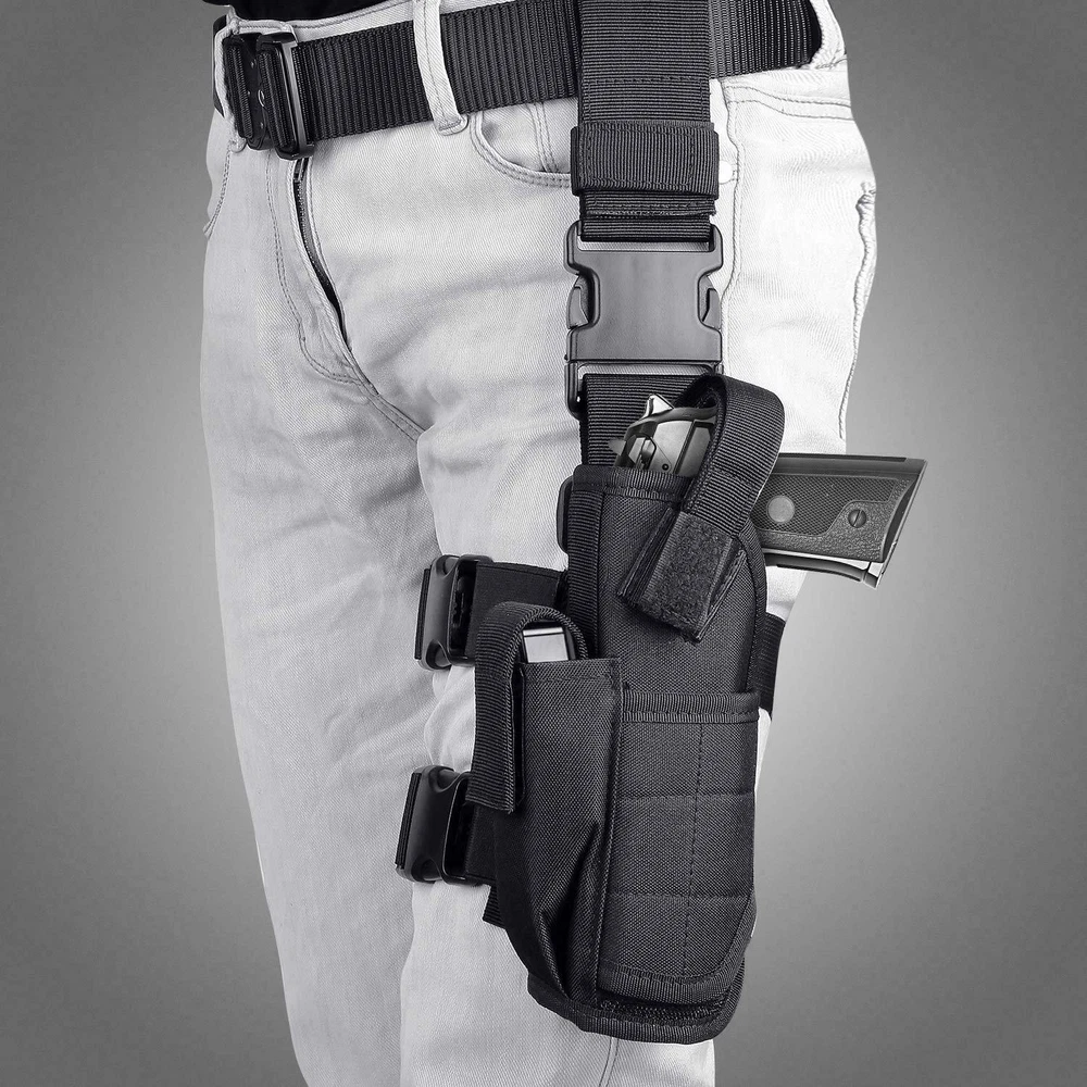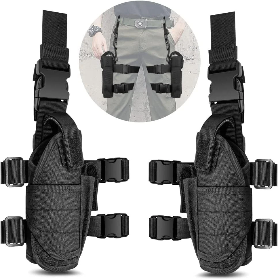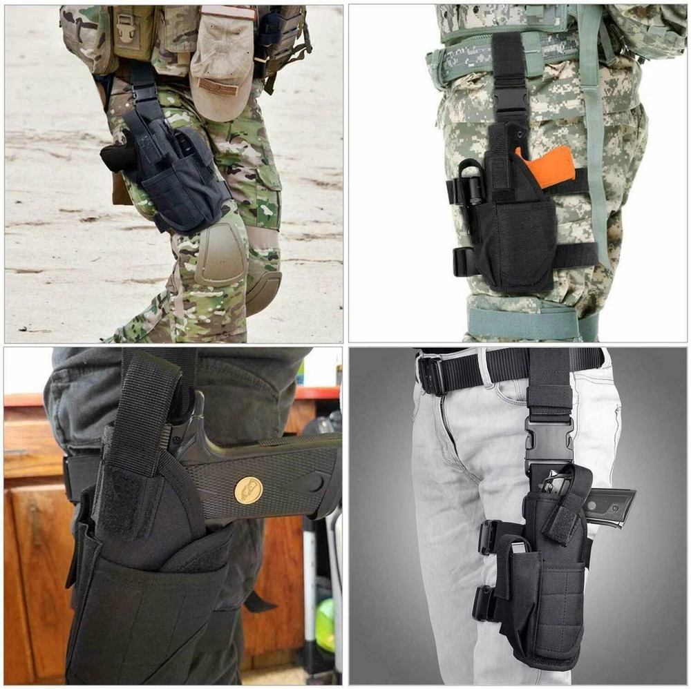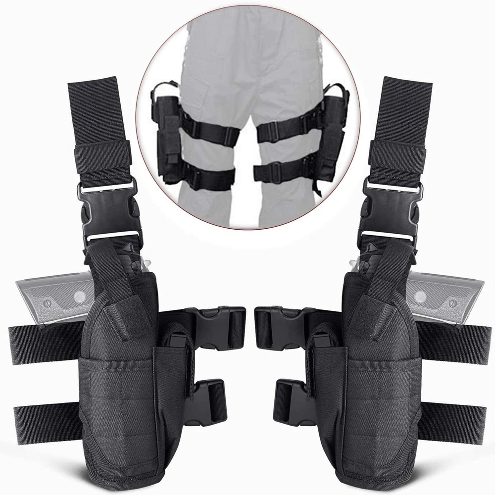 Product Description You may want to take your weapon with you while you hike. Sometimes a waistband holster just doesn't cut it. You may want to carry extra items like spare mags, a flashlight or tactical knife. Normally worn by military or outdoor types, the drop leg holster is great for lots of movement, and little person interaction. Drop leg holsters are primarily a military item that were designed for the battlefield. The point is to disperse your necessary equipment over a larger part of your body, making it easier to carry. Additionally, a drop leg holster makes it much easier to draw your firearm.It also comes into its own when you're wearing a rappelling harness. There is no point in extending your draw stroke and adding unnecessary weight to your legs (when your hips are better at carrying it) unless you're going to gain something from it. This style of holster definitely has distinct advantages, but they will only be realized when used in the right circumstances. Description: Type: Drop Leg Holsters Material: Nylon Size: 105mm x 50mm x 565mm Package: 1 x Holster(Left) 1 x Holster(Right) Specification: Used to hold handgun, pistol & revolver Can be attached in the wrist belt and fasten to the leg Fully adjustable wrap-around design for additional fit and security Adjustable non-slip leg straps minimize movement and provide maximum comfort Quick release buckle and Velcro strap make this holster fully adjustable Ideal for military, law enforcement, hunters, home /self defense and more How to Install Step 1 Take it out and hold your belongings. Step 2 Connect it to your belt and put onto your thigh. Step 3 Connect the two interface and buckle.