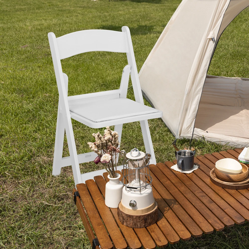 Introductions: Experience the perfect blend of comfort and portability with our Folding Chair with Padded Seat. Featuring an ergonomic design and soft PVC leather cushions, these chairs ensure lasting comfort even during long events. Their foldable design allows for easy storage and transport, making them an ideal choice for family gatherings, outdoor camping, weddings, and more. Crafted from durable, weather-resistant materials, these stylish chairs are perfect for both indoor and outdoor use, offering a versatile seating solution for any occasion. Features: 1. Exceptional Comfort: With ergonomic seat and backrest, complemented by soft PVC leather cushions, these chairs are perfect for long hours of sitting, ensuring your guests remain comfortable throughout any event. 2. Effortless Storage and Transport: The folding design allows the chair to open and close in seconds, making storage and transportation a breeze. Whether you're hosting a family gathering, going camping, or planning a celebration, these lightweight chairs are easy to carry and store. 3. Weather-Resistant Durability: Constructed from waterproof and moisture-proof resin material, these chairs offer long-lasting use both indoors and outdoors. 4. Robust Triangular Structure: Engineered to meet the needs of different body shapes, these chairs provide outstanding stability and each chair supports up to 280 lbs. 5. Versatile and Stylish Design: With a simplistic modern appearance, these chairs enhance any setting. Perfect for decorating your garden, embellishing your balcony, or adding elegance to indoor and outdoor events like weddings and church functions. Specifications: 1. Material: PP, Pearl Cotton, PVC Leather 2. Color: White 3. Product Dimensions: (17.5 x 17.1 x 30.7) in / (44.5 x 43.5 x 78) cm 4. Net Weight: 10.6 lbs / 4.8 kg Package Includes: 1 x Folding Chair