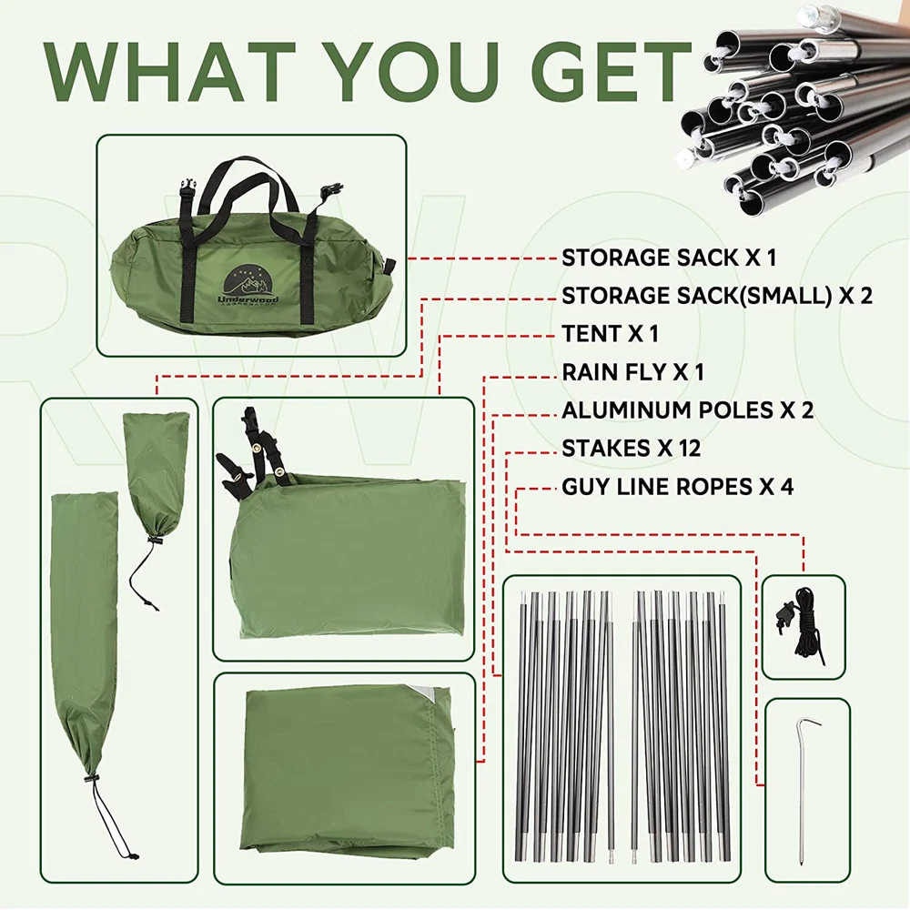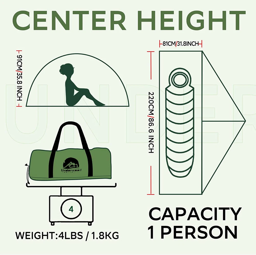 FOUR SEASON TENT: While other 3 season tents are only available for spring, summer and fall, this extreme weather tent is suitable for all seasons of the year. In winter, the snow skirt of this 1 person backpacking tent makes sure that it can keep snow away. The roll-able design makes it convenient when there is no snow around. In other seasons, the mesh design of the 4 season backpacking tent keeps bugs away while the double-layer door ensures ventilation SMART DESIGN: Two-way zipper is a little trick of using the ultralight backpacking tent at ease. The interior of the hiking tent has a camping light hook to hang a lantern and a mesh pocket to store your camping accessories or cell phone. Double layered corner can withstand high winds and powerful storms. That makes it a heavy duty tent. This single person tent is a good choice for outdoor activities. Moreover, this winter camping tent pairs well with the camping mattress in the store SINGLE PERSON TENT: This lightweight backpacking tent is designed for single person, a good choice when you want to have some private space. With a center height of 35.8’’ and a floor size of 31.8’’ X 86.6’’, its packed size is 5.1’’ X 15’’, weighing just 4 pounds. This outdoor camping tent is super compact, lightweight and easy to store. The free standing structure can keep this small camping tent together with aluminium poles and the duraflex fasteners connect the tent and the rain fly UPGRADED MATERIALS: The backpack tent is designed with high quality materials to be used in all weather of the year. Includes durable aircraft grade aluminum poles and full cover rain fly for winter temperatures. The aluminum poles of the waterproof tent feature light and tough. The rain fly design and PU5000mm coating of the cold weather tent make sure the interior dry and clean. All these make the small camping tent windproof and waterproof 100% : The Underwood Aggregator winter tent undergoes rigid inspection before its departure from the factory. Should you have any problems with the 1 man tent, please feel free to reach out to us. We are ready to help and happy to hear from you. Your satisfaction, our responsibility BRAND STORY It is universally acknowledged that it is not easy to find trustworthy camping gear and that is one of the main reasons we built Underwood Aggregator. Established in 2010, Underwood Aggregator is a hands-on think tank of imaginative designers, materials experts, and product developers. Below you'll find a comprehensive guide to a easy set up camping tent. Underwood Aggregatordome dome tents are the one item that should be on every backpacker's pack list. We live for outdoor adventure and we hope you find our honest recommendations helpful. WHY UNDERWOOD AGGREGATOR BACKPACKING TENT? 1. The personal tent has a rare combination of comfort, support, and warmth that make it very tough to beat for backpacking. 2. This superior cheap tents for camping comes with a carry bag, which makes it easy to carry around for moonlight lovers alike when they go camping, hiking, on any expeditions, and much more. Fabric Material: Polyester Capacity: 1 Person Dimension: 86.6''x 31.8''x 35.8'' Weight: 4lbs Packed Size: 15''x 5.1''x 5.1''