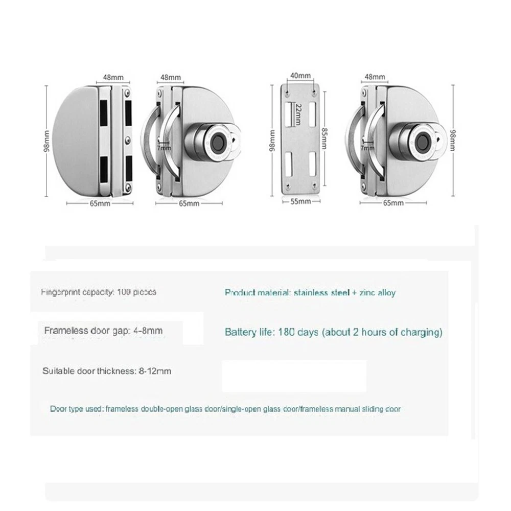 Product Description Features: *Fingerprint recognition technology: This intelligent electronic lock features advanced fingerprint recognition technology, providing a secure and convenient way to for Unlock your glass door. *Suitable for single and double doors: Whether you have a single glass door or a double sliding door, this lock is designed to fit perfectly. Its versatile design makes it suitable for various types of doors in residences, offices, and shops. *Easy installation: Installing this glass door lock is a breeze. It comes with the necessary mounting hardware and a user-friendly manual, allowing you to quickly and effortlessly set it up on your door. *Multiple access options: In addition to fingerprint recognition, this electronic lock offers mechanical key. You can choose the most convenient and secure method to for Unlock your door. * and reliable: Made from high-quality materials, this glass door lock is built to last. It is resistant to wear and tear, long-term reliability and performance. You can trust that your door is securely locked with this intelligent electronic lock. Specifications: *Product Name:Fingerp rint Glass Door Lock Intelligent Electronic Lock *Material: Stainless steel + zinc alloy *Size: Show as the picture *Color: Silve r Single door : side glass and side wall Double door: Both sides are made of glass for Unlock method: fingerprint/-compatible/app/ key APP:OKLOCK Batteries included: Yes Suitable for 8-12mm glass doors Features: -compatible unlocking, fingerprint unlocking, can store 100 fingerprints with mechanical key unlocking (equipped with keys) It takes about 2 hours to charge and has a battery life of 180 days. Package Content: 1* Glass Door Ele ctronic Lock( with key) 1* Data cable 1* Manual Note: . The real color of the item may be slightly different from the pictures shown on website caused by many factors such as brightness of your monitor and light brightness. 2. Please allow slight manual measurement deviation for the data. Payment Payment must be completed within 5 days. If you have any problems about payment, please contact us via message. Delivery details We only ship to confirmed Order addresses. Please comfirm that your Order address is in line with your shipping address. Please kindly note that the c ombined shipping is not provided because the shipping fee is calculated by weight. Also, the each additional item means exactly the the same color and size. It takes about 7 -15 working days to US; about 10-30 working days to other countries. for TRANSIT time may be a little delayed because of the bad weather and customs inspection . If you do not receive your item within 30 working days since payment finished, please contact us immediately for further assistance. Contact us We strive for 100% customer satisfaction! Positive is very important to us. If you have any questions, p lease feel to contact us via "Ask seller a question" . We will reply your email within 24 working hours. On Mar 21, 2025 at 04:01:32 PDT, seller added the following information: