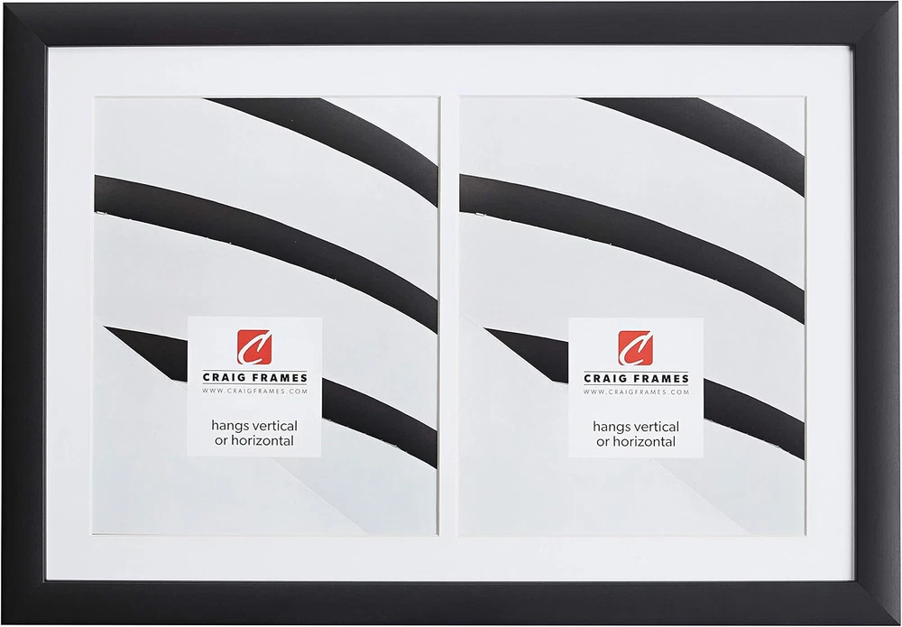 Celebrate and display your cherished memories with our framed collage mats Complete collage kit includes: picture frame, white matting, acrylic facing, cardboard backing and hanging hardware Matting has 2 - 8 by 10-inch openings (actual opening size: 7.5 by 9.5-inch) Frame moulding is 1 inch wide; black; smooth wrap finish; wood composite material Matting is .05 inches thick; white with cream core; pH neutral; bevel cut openings Introducing the Craig Frames 12x18 Black Picture Frame, designed with a collage mat to elegantly display two 8x10 photos. This sleek and modern wall display frame is the perfect addition to any home or office, adding a touch of sophistication to your cherished memories. Crafted with high-quality materials, the frame is durable and built to last, while the black finish complements any decor style. Showcase your favorite moments in style with the Craig Frames 12x18 Black Picture Frame.