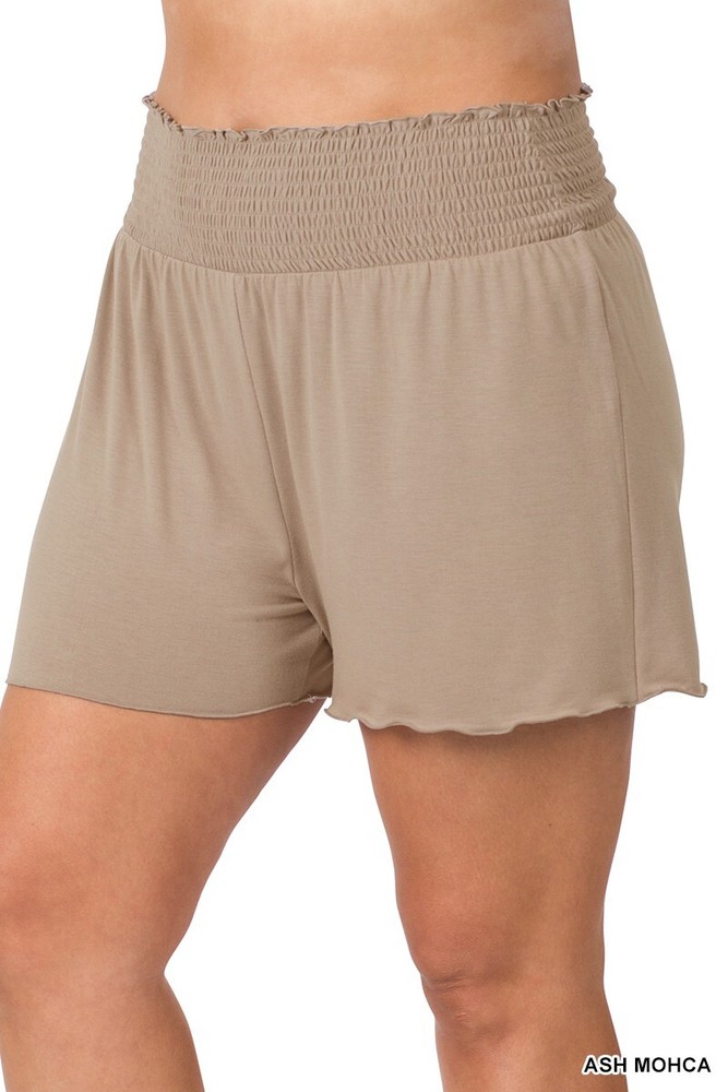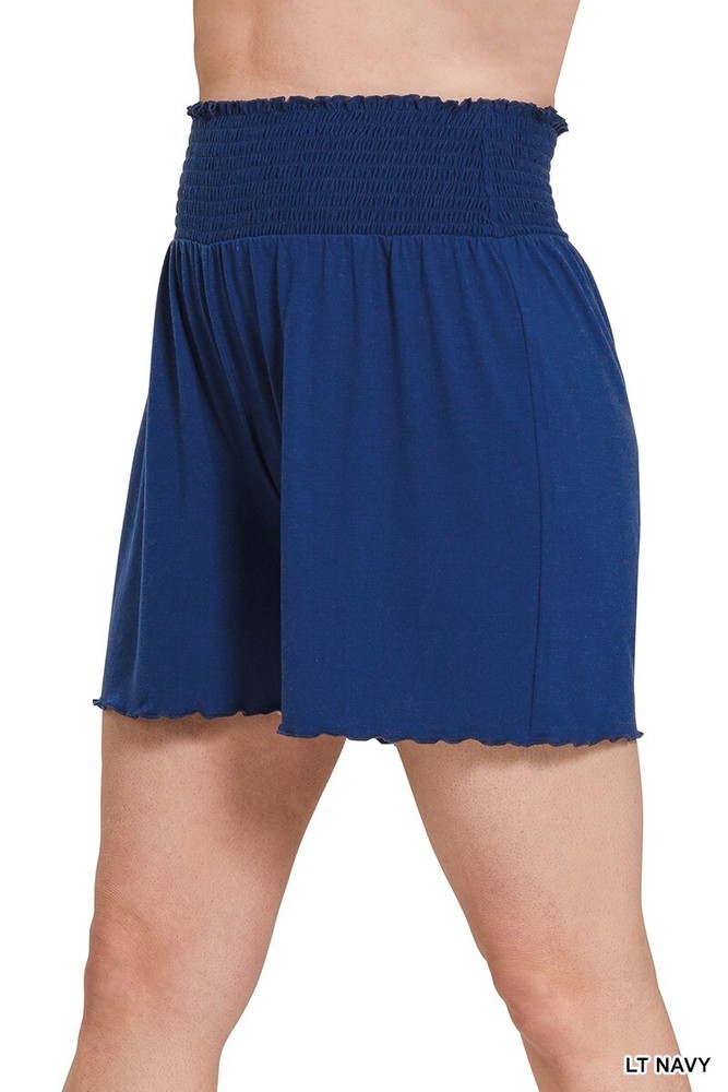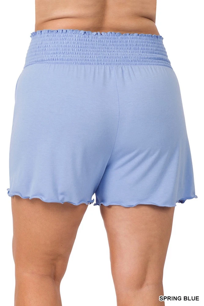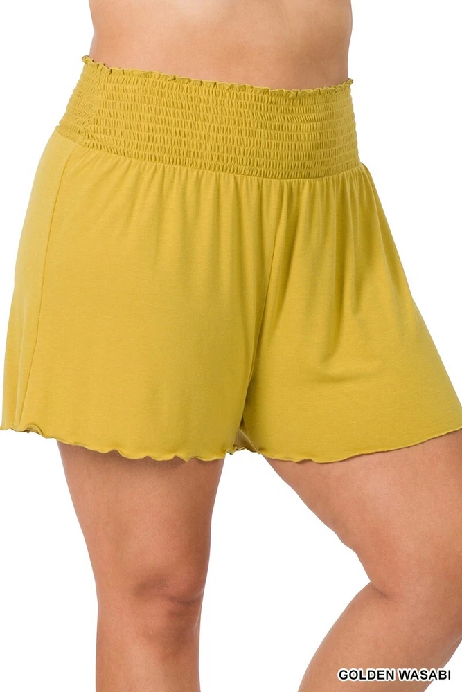 WOMEN'S SMOCKED WAIST SHORTS Description Premium poly rayon smocked waist shorts. Soft stretch fabric for all day comfort. - Fabrics: 57% Polyester, 38% Rayon, 5% Spandex Waist ~ 1X: 31-34" 2X: 33-36" 3X: 35-38" Measurements - Total Body Waist: 31" Approx. - Inseam: 3.5" Approx. ~ Measured from 1XL