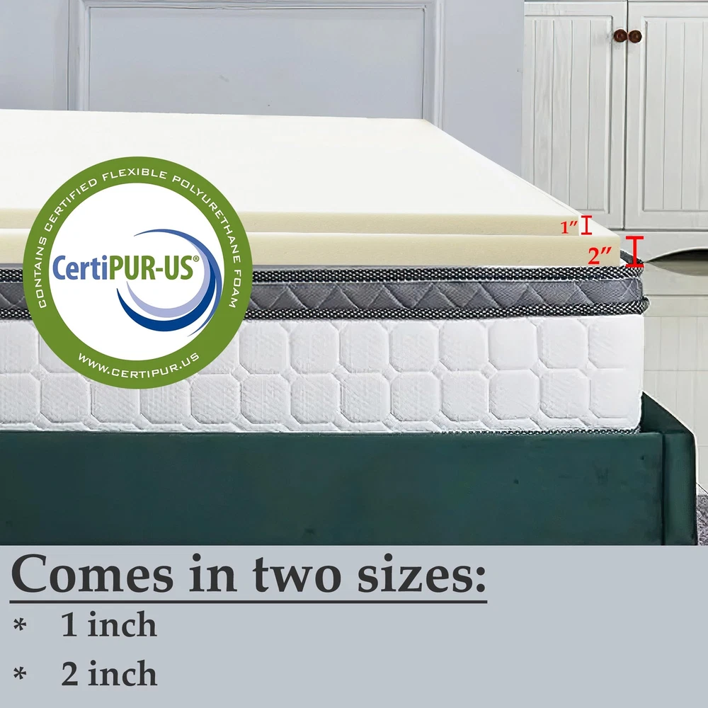 The 1-inch premium foam adds luxurious softness while not taking away from the support of the mattress. These bed toppers have been effective in enhancing the comfort level of new and old mattresses alike, providing a better sleep experience for most people. This Breathable Foam Topper is made from good quality foam that gently cradles you in individualized comfort and support. It also provides you with pressure-relieving cushioning in the hip and shoulder areas while still supplying enough support, so the body doesn't get imbalanced. These unique mattress toppers are to be used on top of your mattress for additional comfort. This prevents your body from sinking and curling while sleeping and promotes a better posture, which reduces and strain on your spine and increases energy levels during the day. Our premium-level mattresses are here to help you get the best possible comfort at all times when you sleep or lie down to relax. Comfort: A mattress topper can add an extra layer of comfort to your mattress, making it feel softer and more luxurious. This can be especially beneficial if you have a firm or uncomfortable mattress. Support: Toppers can provide additional support to your body while you sleep. This can help alleviate pain and pressure points and promote better alignment of your spine. CertiPUR-US certified foam: Rest easy knowing that the topper's foams are CertiPUR-US certified, meeting stringent standards for durability, performance, and content. Quality you can trust. Temperature regulation: Mattress toppers are designed to regulate temperature and keep you cool during the night. This can be especially beneficial if you tend to overheat while you sleep. Cost-effective: If you're not ready to invest in a new mattress, a mattress topper can be a cost-effective solution to improve your sleep experience. It's also easier to replace a topper than a mattress, which can be a more affordable option in the long run.