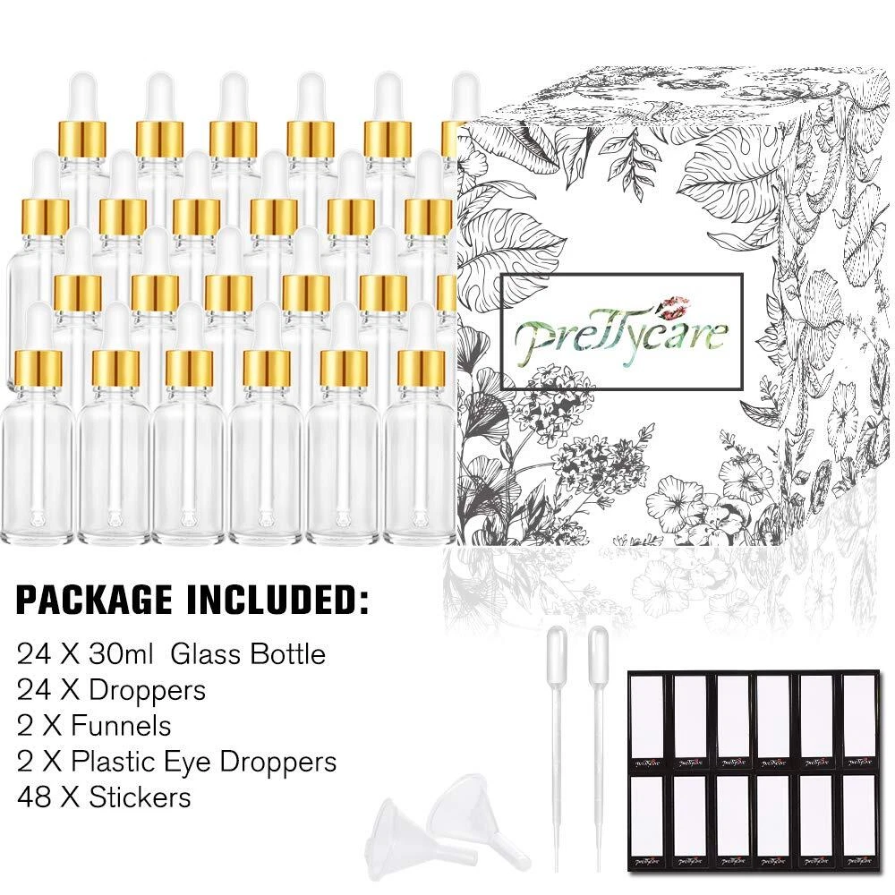 Dropper Bottles 1oz (Clear Glass Bottle 30ml with Golden Caps, Lables & Funnel) Cosmetic Sample Container for Essential Oils, Perfume Premium Quality Dropper Bottle: Our glass pipettes are longer than other brands to prevent wasting oils and thicker to prevent breaking easily. UV Resistant Glass: The amber glass is BPA free and lead-free with UV resistant properties to protect oils from UV rays and evaporation. Perfect for Aromatherapy: Comes with 24 droppers to fill essential oils for massage, hair salon, aromatherapy and relaxation. Leakproof Design: The screw thread finish bottle mouth is matched with a tight aluminum cap to prevent leakage. Additional Accessories: Package includes funnels, pipettes, and stickers to refill and organize essential oils.