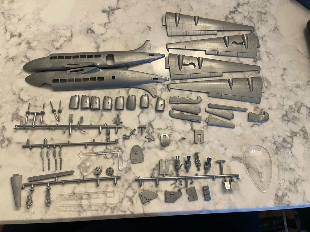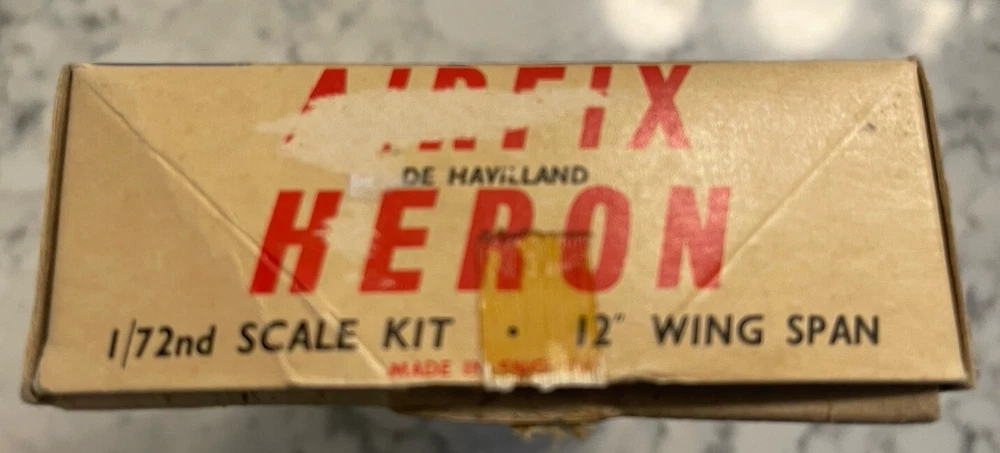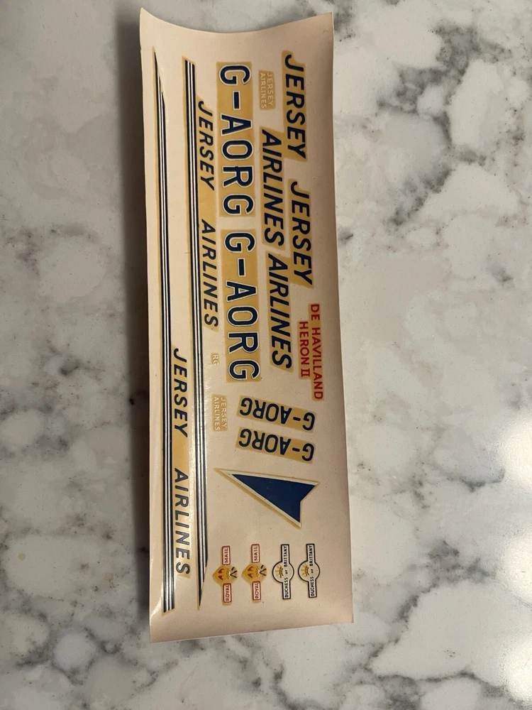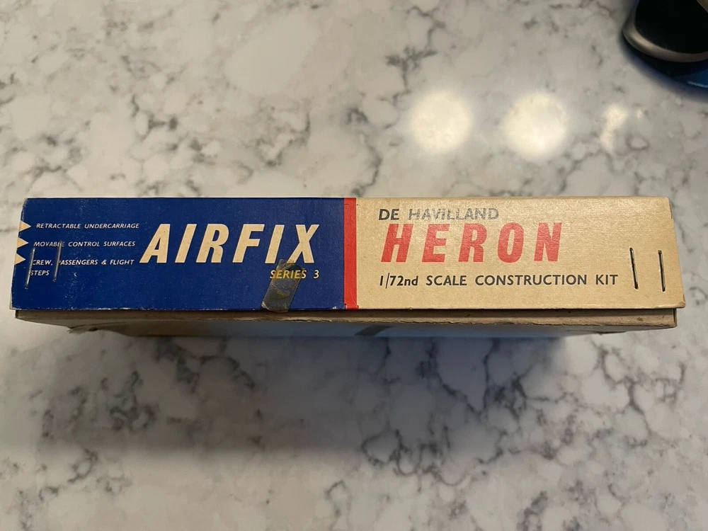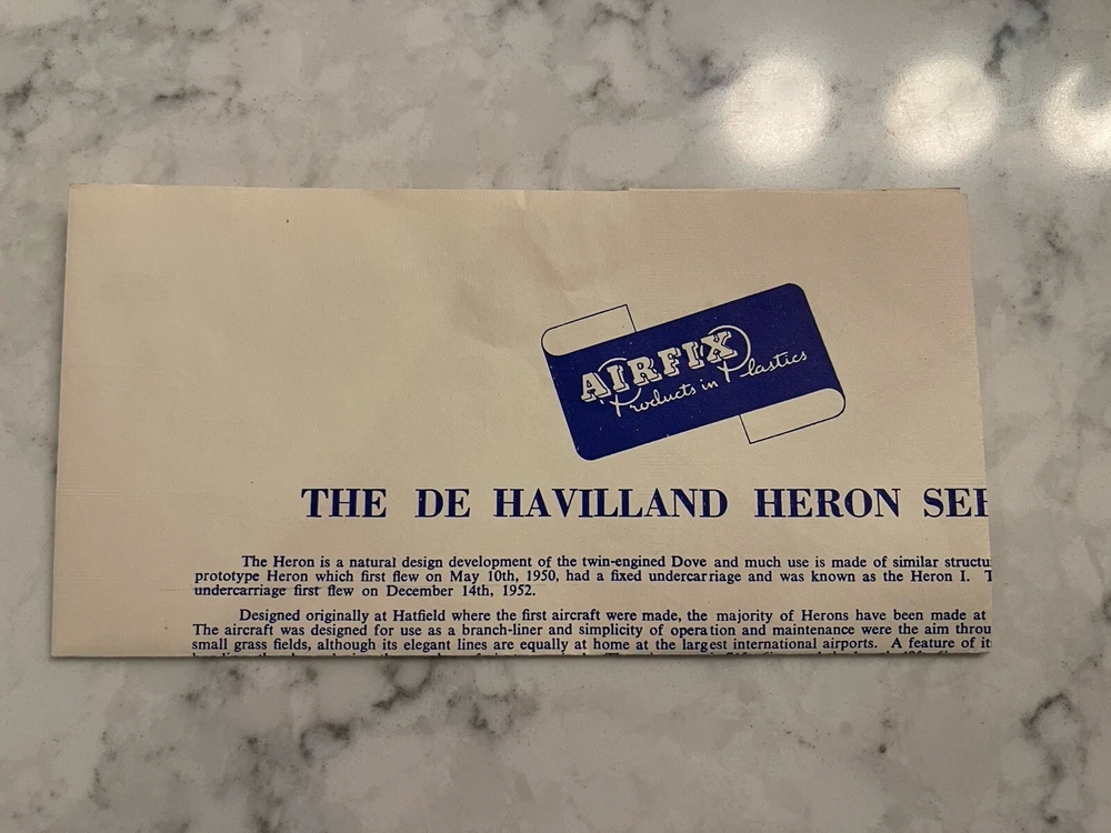 The product is a 1st edition 1959 Airfix model kit number 381, featuring the DE HAVILLAND HERON JERSEY AIR airplane in 1:72 scale. It is an unassembled kit that comes complete in its original box. This vintage kit is from Jersey and is part of the Aerial theme. The kit is not painted and was manufactured in 1959. It is a detailed representation of the DE HAVILLAND HERON JERSEY AIR airplane, perfect for model enthusiasts and collectors. Kit has been inventoried complete 67 parts plus stand, instructions, 2 sets of decals and a Jersey Airlines brochure.
