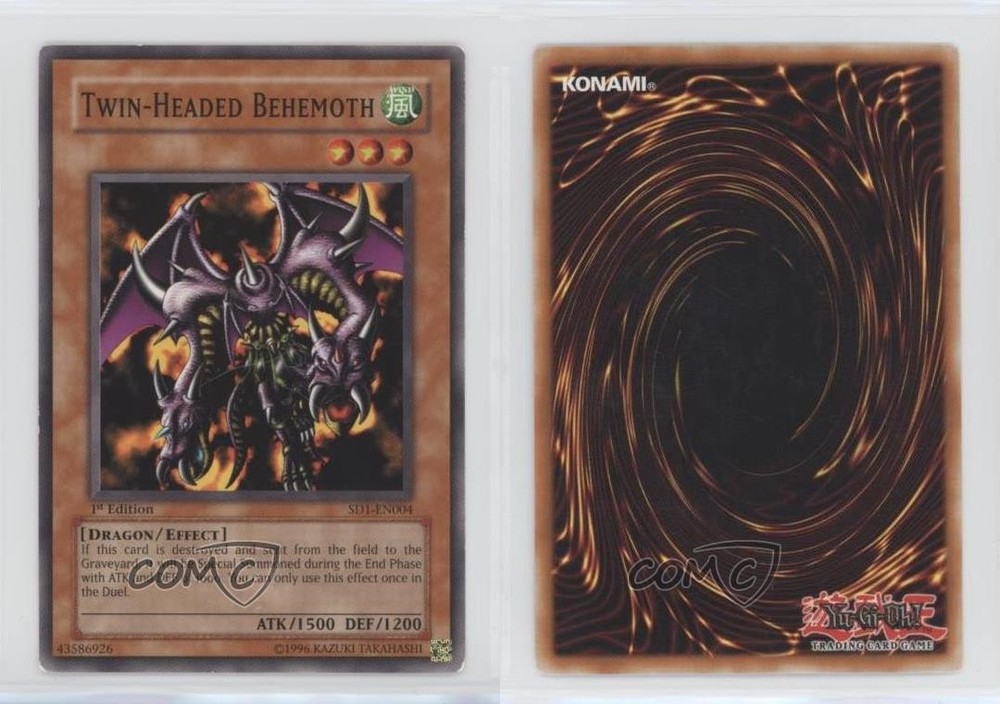 2005 Yu-Gi-Oh! Dragon's Roar - Structure Deck [Base] - 1st Edition #SD1-EN004 Twin-Headed Behemoth COMC Item: 160247962 - YuGiOh Card - Featuring Twin-Headed Behemoth Search for more: 2005 Yu-Gi-Oh! Dragon's Roar Search for more: 2005 Yu-Gi-Oh! Dragon's Roar - Structure Deck [Base] - 1st Edition View all of our Listings Auctions Buy It Now About Us Located in the beautiful Pacific Northwest, COMC (Check Out My Cards) is the world's largest consignment service for trading card singles. More than 10,000 people have used our consignment service to list over 50 million trading cards. Find out how we can help you consign your items on eBay by contacting us through eBay messaging. COMC -- "The Safe & Easy Way to Buy & Sell" Raw Condition for Modern Cards Unless otherwise noted, raw modern cards are listed in Near Mint-Mint condition or better. A NM-MT card appears to be Mint at first glance, but upon closer inspection, may exhibit some of the following: minor print defects (e.g. roller marks, print line, dimple), minor scratches, slight edge wear, and slight corner wear. Centering is clearly visible in the images provided and does not factor into our condition assessment. Raw Condition for Vintage Cards Unless otherwise noted, raw vintage cards are listed in Excellent condition or better. An EX card may exhibit some of the following: minor rounding of corners, surface wear, print defects, light scratches, and slight edge wear/chipping. Centering is clearly visible in the images provided and does not factor into our condition assessment. Domestic Shipping Combined shipping for multiple items is available. To receive combined shipping, please ensure all desired items are in your eBay shopping cart before proceeding to checkout. eBay limits orders to 40 items per order. We automatically combine multiple orders placed on the same day. If you place multiple orders on the same day, please contact us to request a refund of applicable shipping costs. Signature confirmation may be required on invoices over $400. All cards are protected and shipped securely. International Shipping COMC offers eBay's International Shipping (EIS) for international orders under $2,500* (see country exceptions below). All duties and import fees are paid at checkout; in the rare event that there are additional import fees upon delivery, these are borne by the buyer. EIS packages route through a shipping hub in Erlanger, KY before shipping to their final destination. Please note that EIS does not allow for combined shipments. The shipping rates are determined by eBay and cannot be adjusted. *Maximum sale price exceptions: Colombia, Kuwait ($2,000); Taiwan ($1,539); Chile, Costa Rica, Guatemala, Honduras, Trinidad and Tobago ($1,000); Antigua and Barbuda, Aruba, Belize, Dominica, Grenada, Philippines, Saint Kitts and Nevis, Saint Lucia, Montserrat, Turks and Caicos Islands ($500); Dominican Republic, El Salvador ($200). Please request a shipping quote through eBay messaging for orders that exceed the maximum sale price supported by eBay's International Shipping. You will be responsible for all duties and import fees for international orders shipped outside the EIS. All cards are protected and shipped securely. Payment COMC does not accept offers on our cards through our eBay storefront. COMC utilizes eBay’s managed payments system. If you are experiencing difficulties making a payment, please contact eBay for assistance. Return Policy Returns are only accepted on the rare occasion the item is not as described. If you are making a return, please initiate the return process through eBay so a mailing label can be provided for you. Prior to listing, our expert team carefully assessed this item to represent it accurately. Please review the description and high-definition images prior to purchasing to ensure this item meets your satisfaction. We welcome you to contact us if you have further questions about this item. Trust and Integrity COMC carefully assesses each item consigned to us to prevent fraudulent items from entering the marketplace. If you believe an item offered on COMC may be fraudulent, please contact us with details so we can investigate the issue. Items we determine are outside our supported items policy may be removed. Last Modified: 6/1/2025 1:23:08 AM PDT
