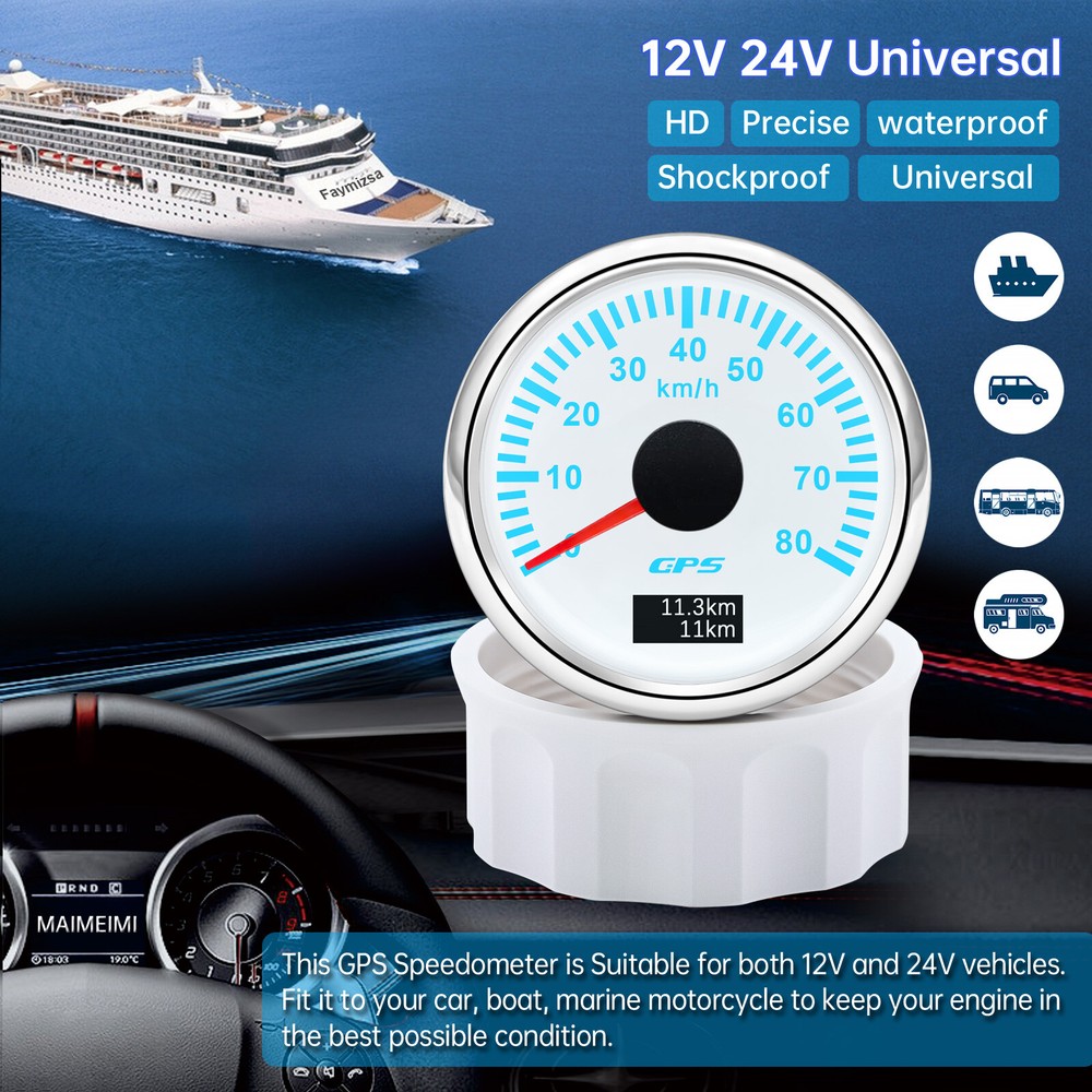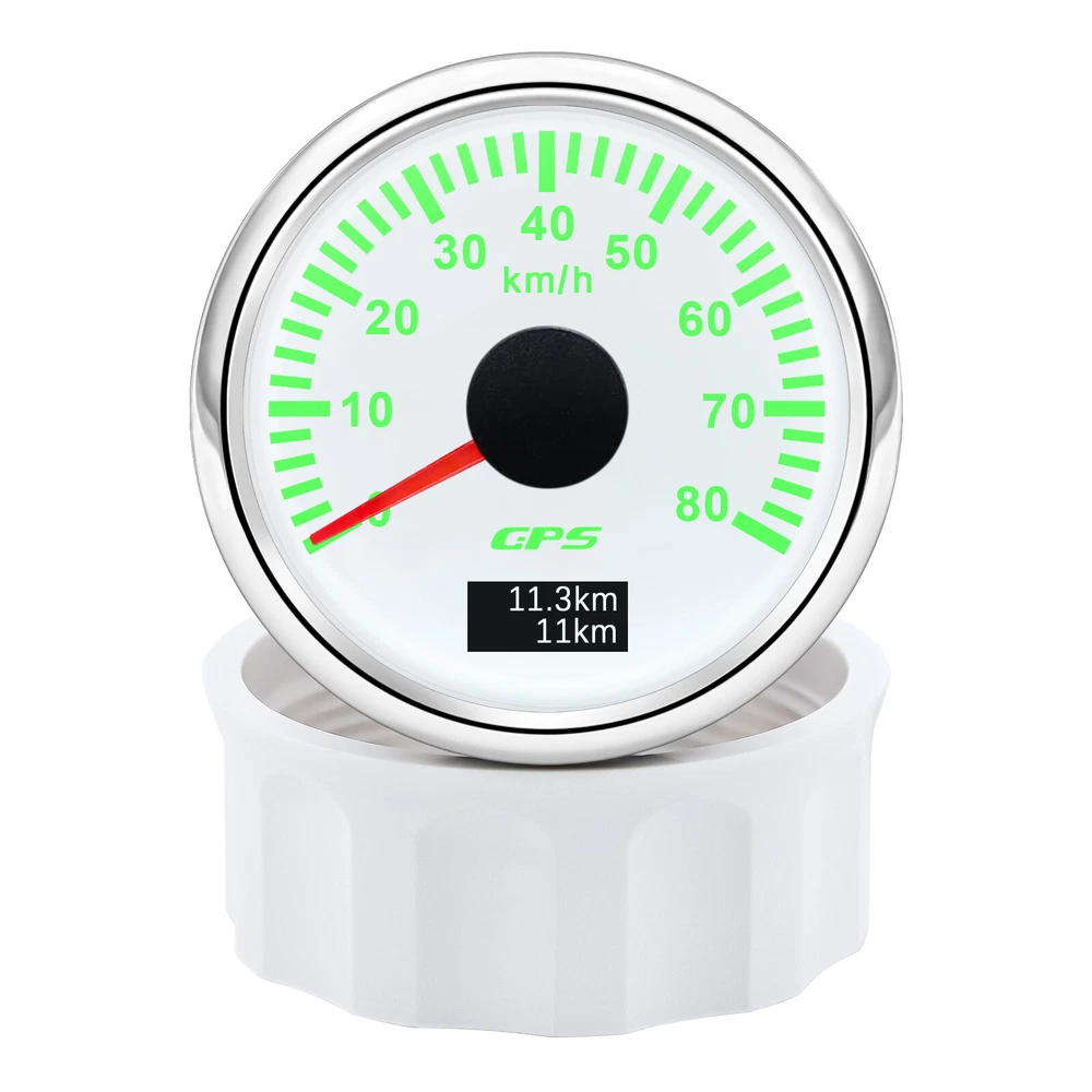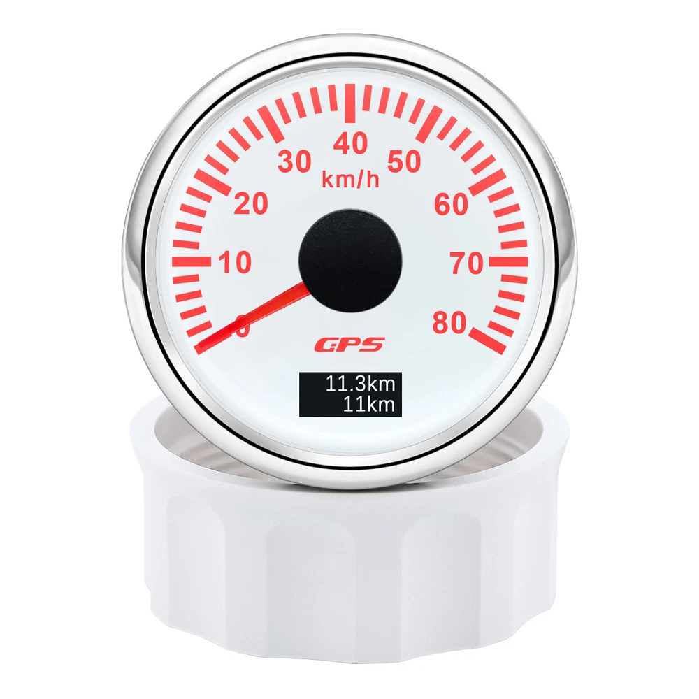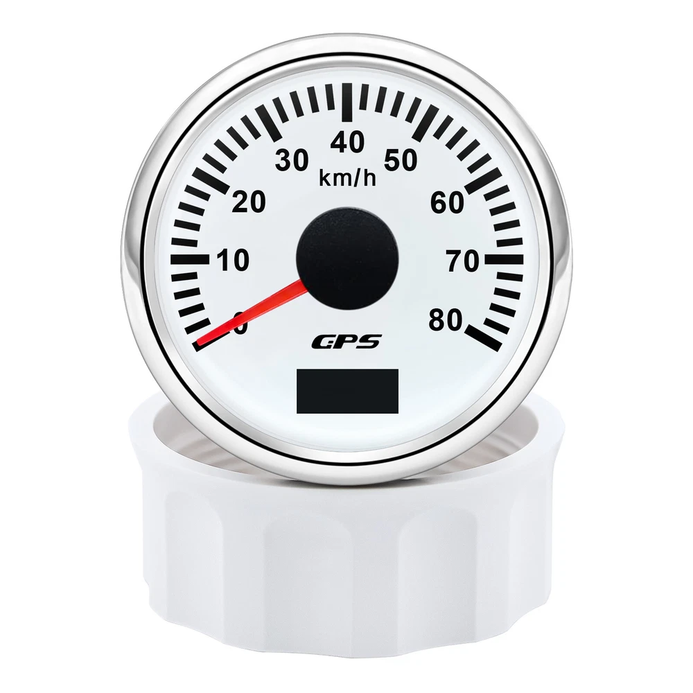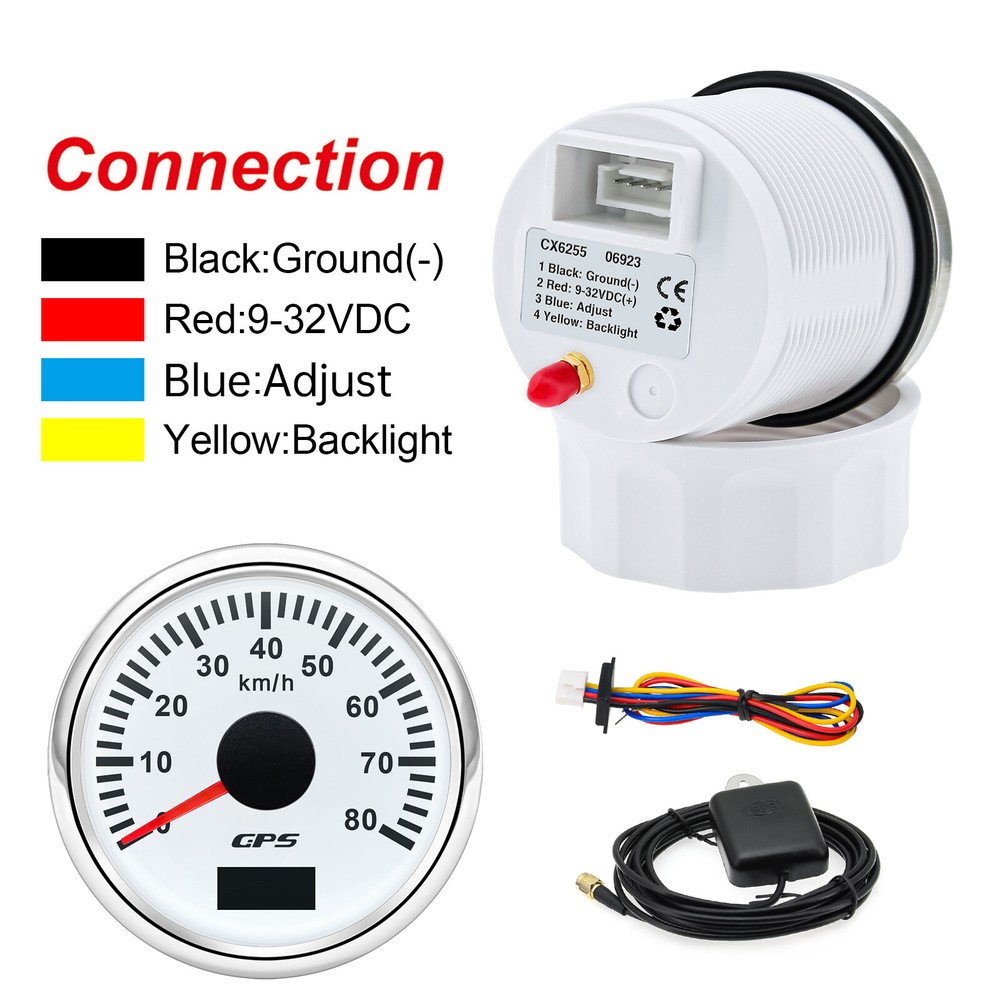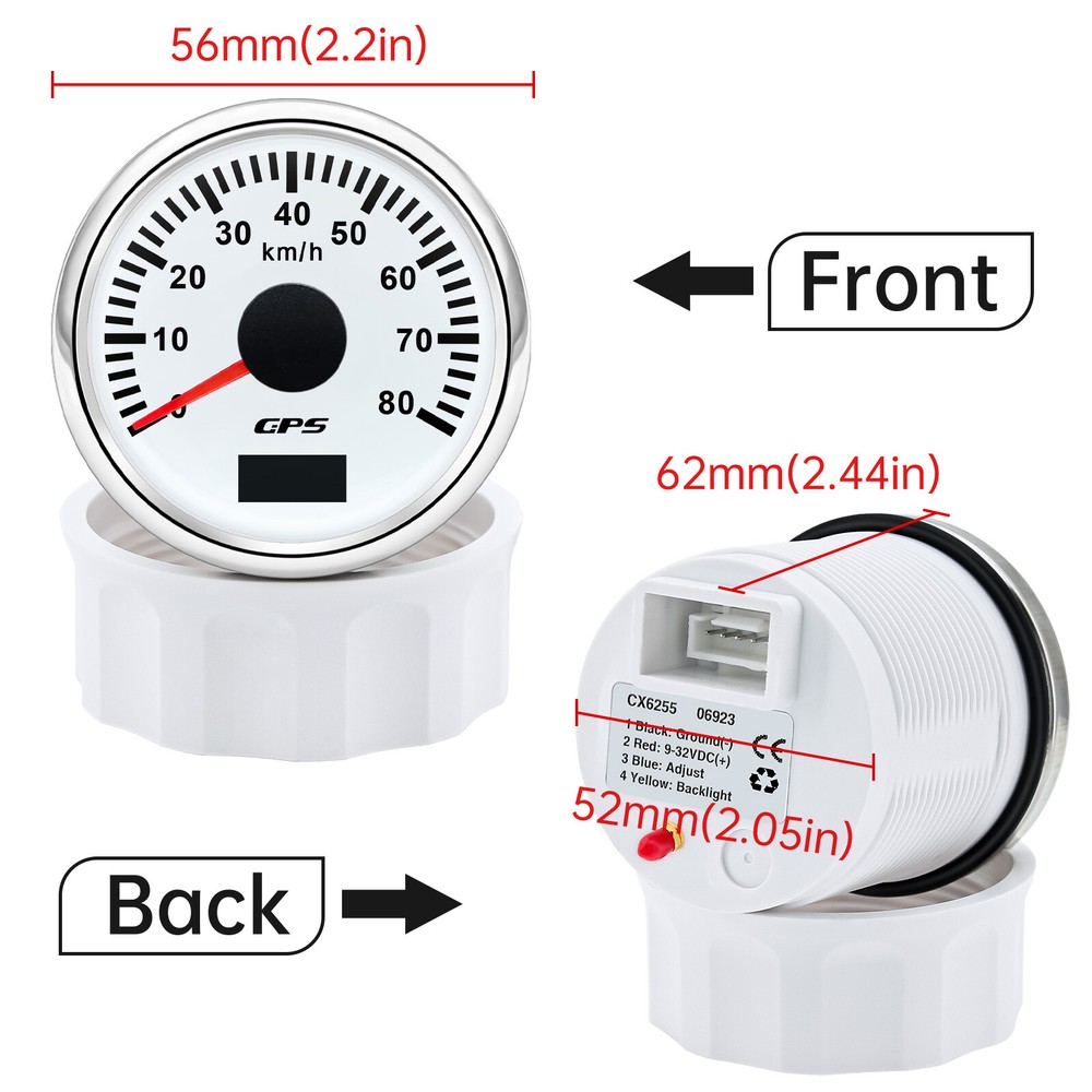 2'' 52mm GPS Speedometer 0-80km/h Gauge Odometer for Motorcycles Boat Car Truck 52mm Digital GPS Speedometer Speed Odometer Gauge 0-80Km/h for Car Boat Truck Specifications Item Name: 52mm GPS Speedometer Gauge Dial: White Material: Stainless Steel 316L Bezel + Anti-fog Glass Install Diameter: Φ52mm or 2" Signal: GPS Working Voltage: 9~32V DC Working Current: ≤100mA Operating Temperature: -30℃ ~ 75℃ Storage Temperature: -40℃ ~ 85℃ Size: 12x8x12cm / 4.72x3.1x4.75 inch IP67 waterproof and dustproof grade Indication Range: 0-80Km/h Backlight:7 Colors Backlight Product Descriptions High-brightness LED backlight. 316 stainless steel for long-term use even in acid-base, humid environment. IP67 waterproof and dust-proof grade. With curved glass( with anti-fog function). Suitable for all kinds of vehicle modification. Using stepper motor drive pointer, accurate display of the engine speed, and with the LCD display clear display mileage. Gauges have many kinds backlight color (red,yellow,orange,green,blue,purple,white),customers can adjust any color that you like. Connection: Black: Ground(-) Red: 9-32VDC Blue: Adjust Yellow: Backlight Package Includes: 1X 52MM Digital GPS Speedometer Gauge 1X Instruction 1X Wire Harness 1X GPS Antenna