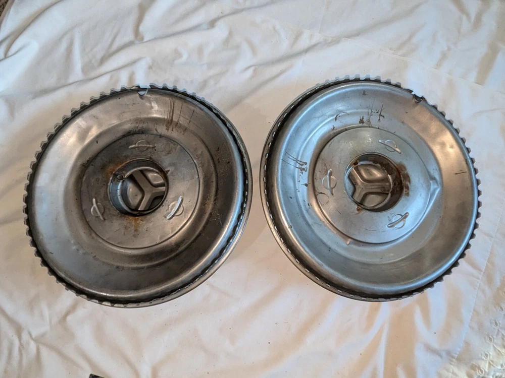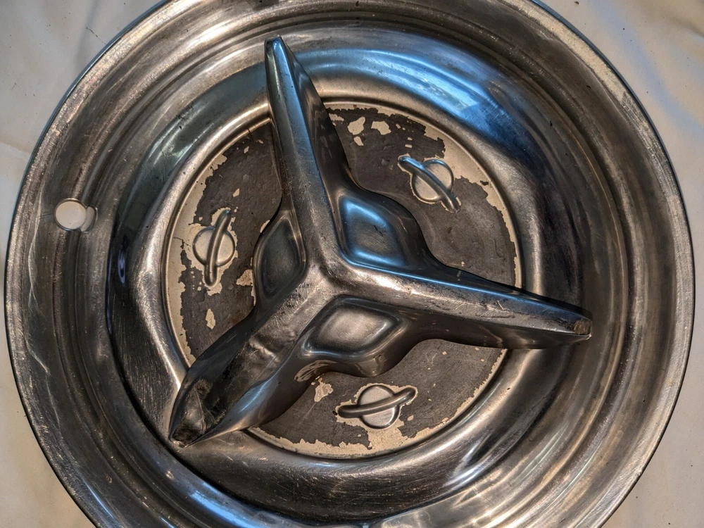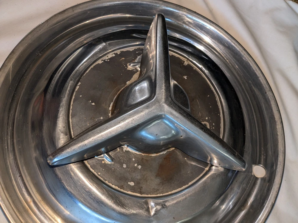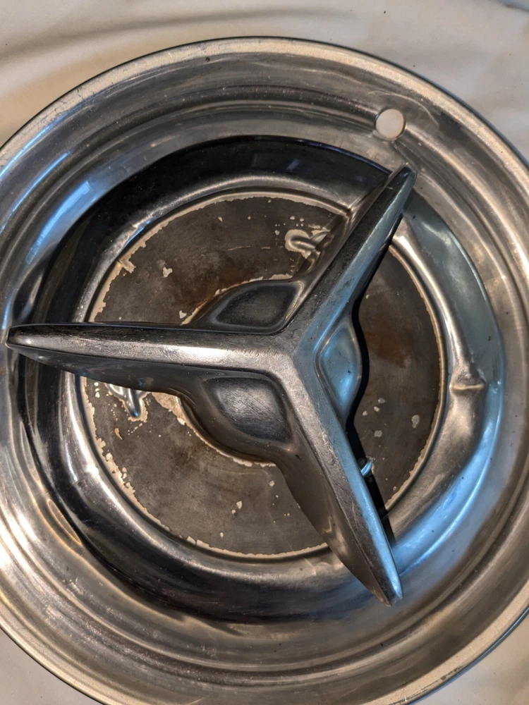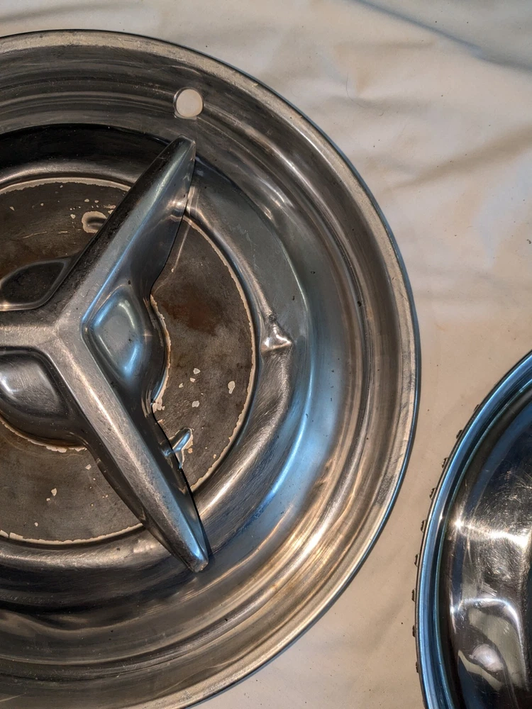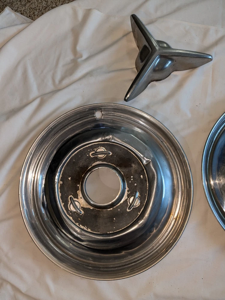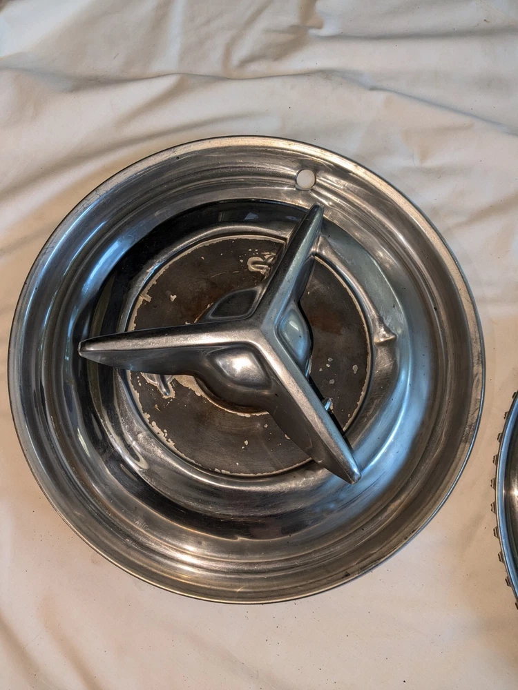 The photos show everything. As far as I know, these are for the year / make / model listed in the title. I could be wrong , they could fit these and/or other models, other years. I do not know . I am counting on you knowing, when you see them, if these are what you need for your automobile. There are no returns . You can see the condition of these hubcaps, they are dented, and you can see the spinner on the one hubcap is not attached. You will have to supply the screws on the back, as you can see in photo number 14. And on the other one, the spinner is attached. The spinner is a bit bent and/or dented, as you can see. This will need to be reshaped. You can see in the last photo of this particular spinner is attached to the hubcap, but the screws are rusted and may need to be replaced after you remove the spinner. I believe these to be fairly rare. They are approximately 15 inches in diameter, I am assuming for 15-inch wheels. I could be wrong. Again, I am counting on you knowing when you see them if these are what you need for your automobile. There are no returns. Be sure these are what you want. THESE WILL SHIP USING UPS, FEDEX OR USPS, WHICHEVER I SELECT AT TIME OF SHIPPING.