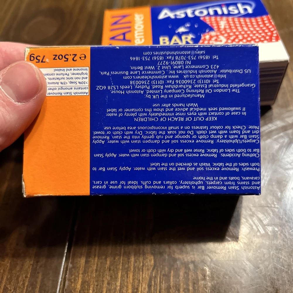 UPC:048256229905Personalize:NoNumber in Pack:2Fomulation:Soap BarFor:FabricCustom Bundle:Nogtin13:048256229905Item Weight:75 gForm:BarType:Stain RemoverBrand:AstonishVolume:75 g.