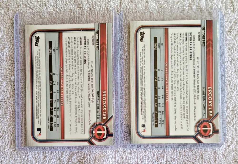 2 BROOKS LEE 2022 BOWMAN CHROME MEGA MOJO REFRACTOR RC LOT # BDC1253 TWINS SHIPPING WILL BE $4.99. I DO COMBINE SHIPPING FOR ADDITIONAL ITEMS PURCHASED. PLEASE CONTACT ME FOR DISCOUNTED RATES. USPS FIRST CLASS SHIPPING UNLESS OTHERWISE LISTED. I ONLY SHIP TO THE U.S. EBAY SELLER WITH 100% FEEDBACK. PLEASE VIEW MY OTHER LISTING. MONEY BACK IS GURANTED IF YOU NOT SATISFIED WITH THE RETURN OF THE ITEM OR ITEMS.