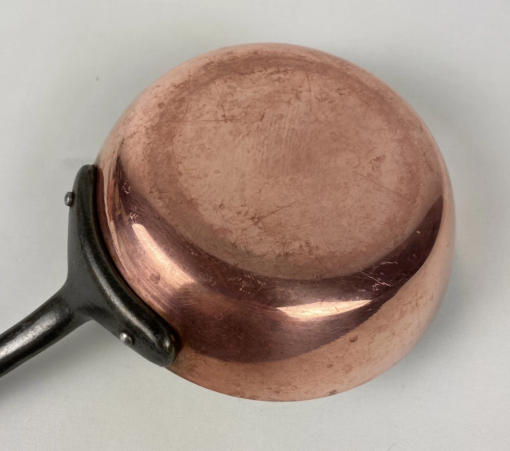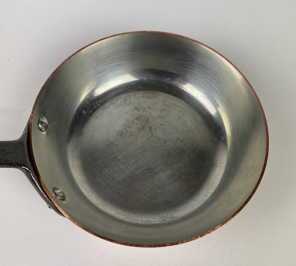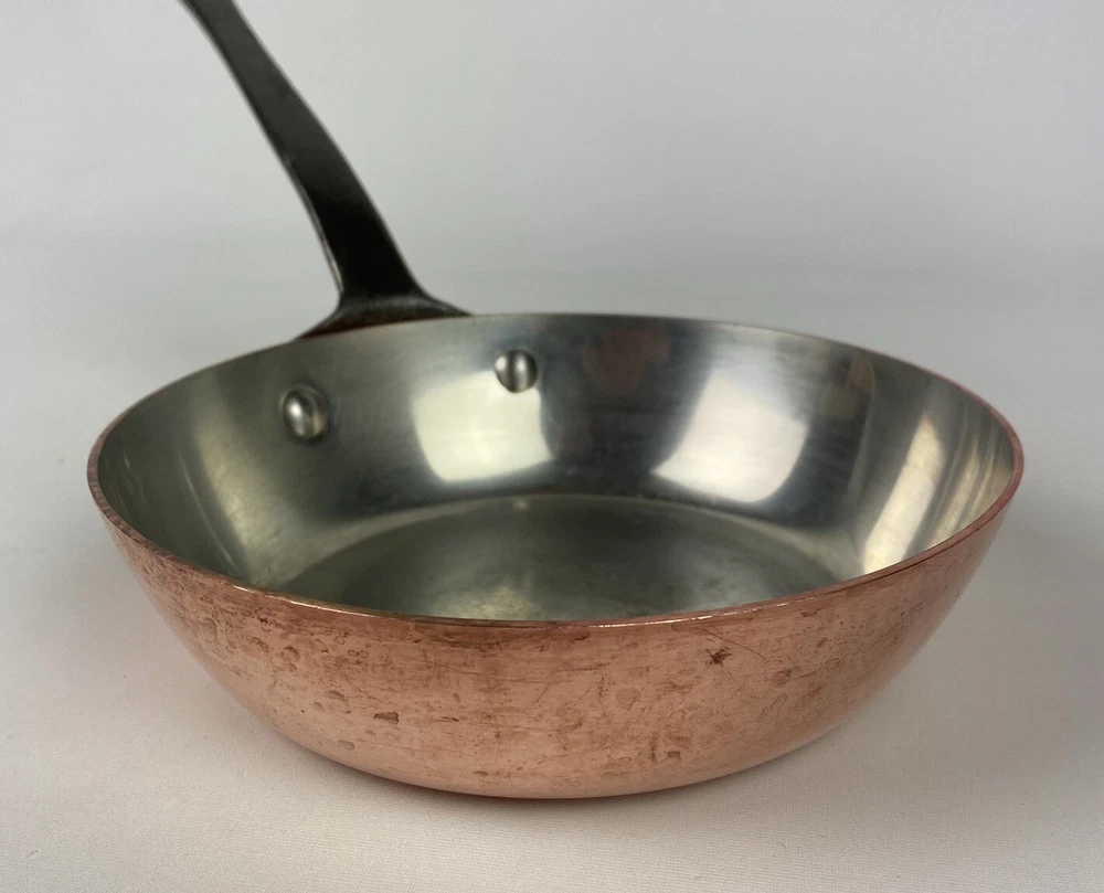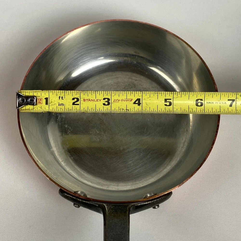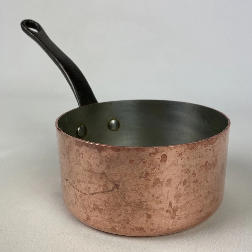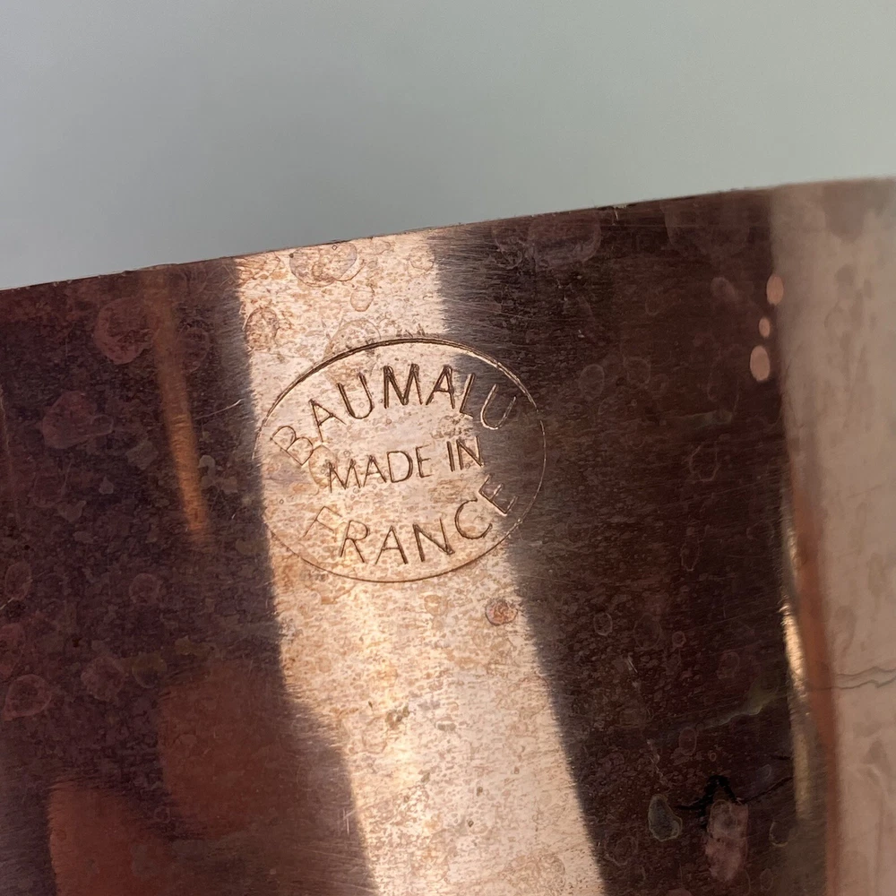 Up for sale is a set of two Baumalu copper cookware pieces made in France. The set includes a 6.5" skillet and a 5" saucepan, both featuring cast iron handles. The copper surface coating adds a touch of elegance to any kitchen and is compatible with both electric and gas stove types. This set is a great addition for any collector of vintage or antique cookware. The round shape and copper color make for a beautiful display piece, while also being functional for cooking. Don't miss out on the opportunity to own this original, two-piece set from Baumalu. Most of our items are second hand and have some shelf wear on them. We do not guarantee mint condition unless otherwise noted. Please take time to look closely at all photos of items and specifics, as they are all part of the complete description. Most noticeable flaws we see will be pointed out with a pen. All items in the photos are of the actual product being shipped directly to you (minus display props and measuring devices) If an item is not in the photos, please do not expect it. If you have any questions or concerns, please reach out to us. Our feedback speaks for itself. We do all we can to keep you satisfied with your buying experience from Streamline717