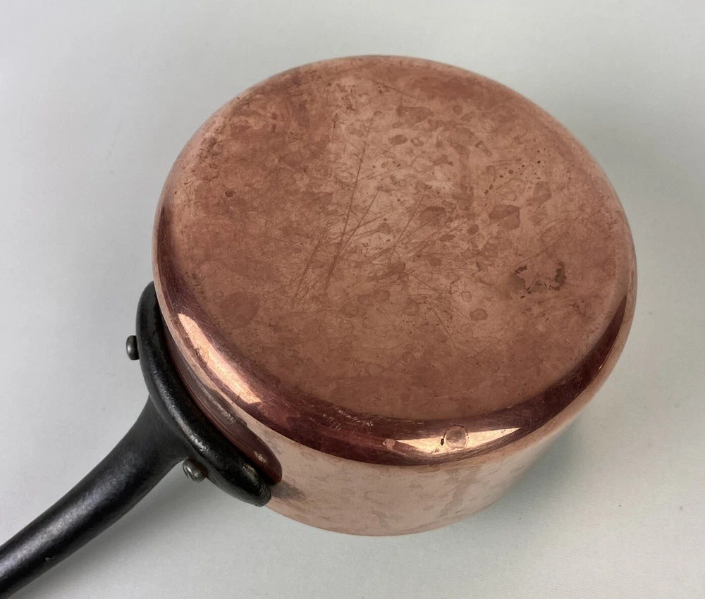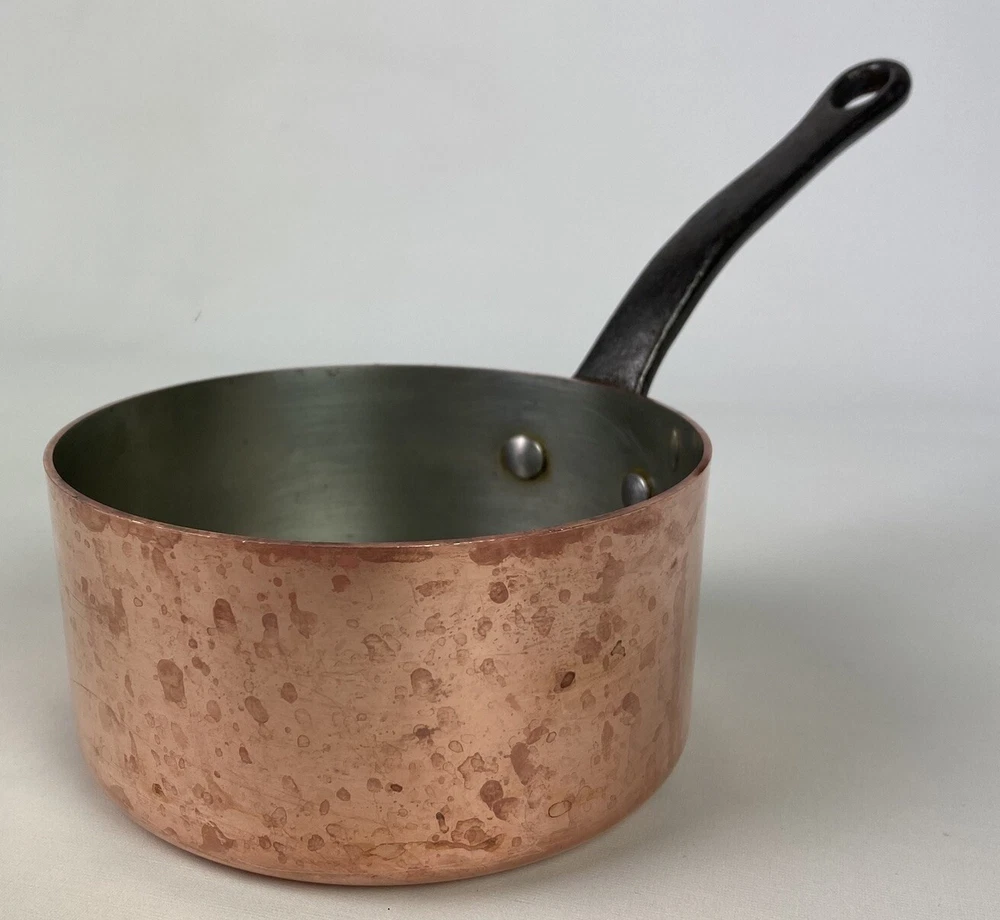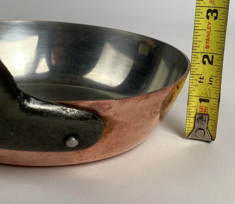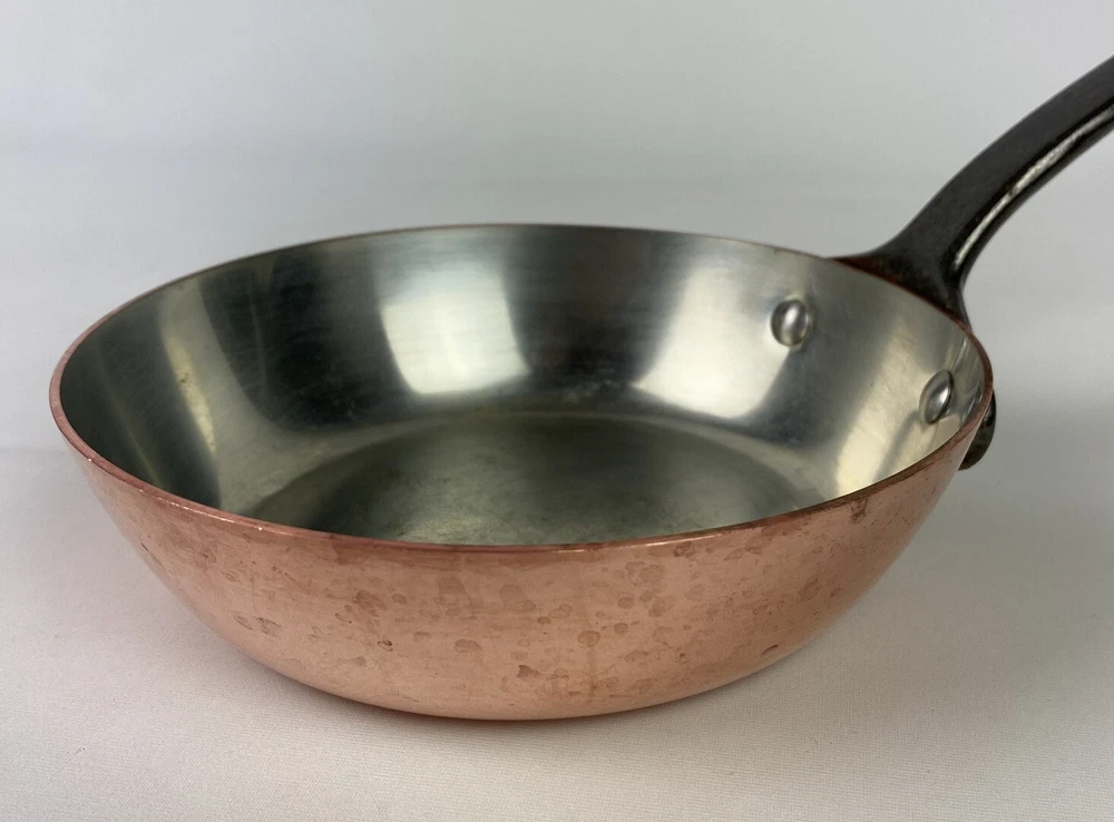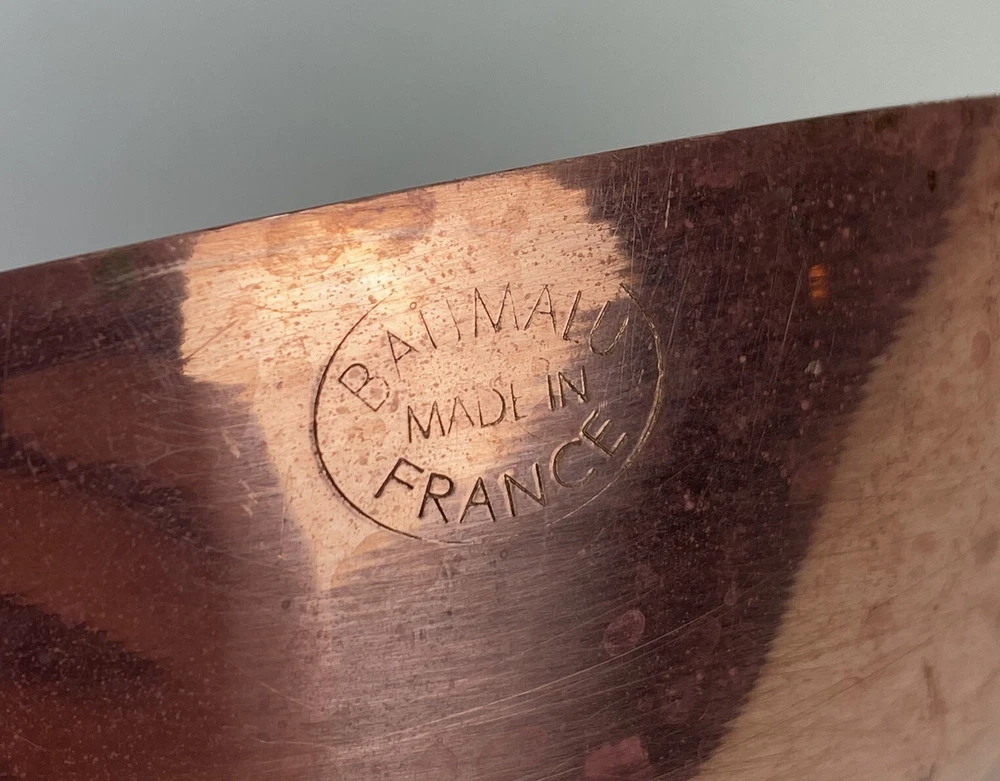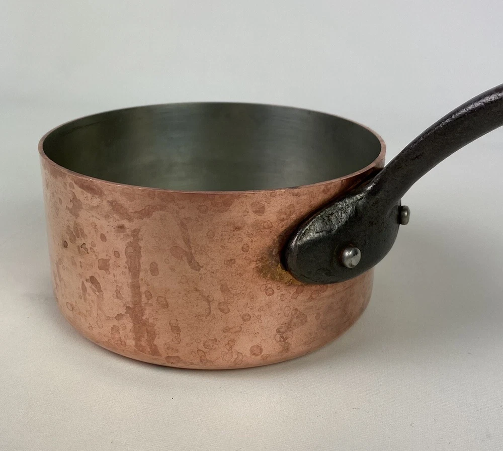 Up for sale is a set of two Baumalu copper cookware pieces made in France. The set includes a 6.5" skillet and a 5" saucepan, both featuring cast iron handles. The copper surface coating adds a touch of elegance to any kitchen and is compatible with both electric and gas stove types. This set is a great addition for any collector of vintage or antique cookware. The round shape and copper color make for a beautiful display piece, while also being functional for cooking. Don't miss out on the opportunity to own this original, two-piece set from Baumalu. Most of our items are second hand and have some shelf wear on them. We do not guarantee mint condition unless otherwise noted. Please take time to look closely at all photos of items and specifics, as they are all part of the complete description. Most noticeable flaws we see will be pointed out with a pen. All items in the photos are of the actual product being shipped directly to you (minus display props and measuring devices) If an item is not in the photos, please do not expect it. If you have any questions or concerns, please reach out to us. Our feedback speaks for itself. We do all we can to keep you satisfied with your buying experience from Streamline717
