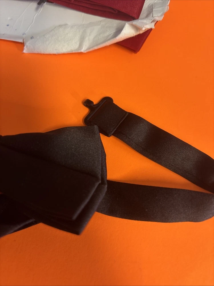 This product is a red and black adjustable bowtie made of polyester satin. It features a solid pattern and classic width, perfect for a formal event or a wedding. The clip-on attachment type makes it easy to add a touch of sophistication to any outfit, while the adjustable size ensures a comfortable fit for any wearer. Perfect for men who want to elevate their formal look with a stylish and high-quality accessory.