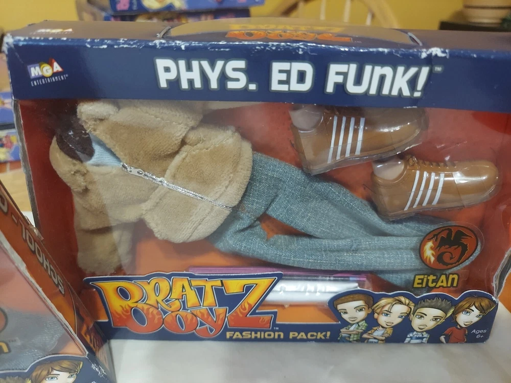 Up for bid, dated 2003 are the 2 Bratz Boyz Fashion packs seen in the photos. Both still sealed. Eitan's Phys. Ed Funk! and School - Cool!! 2 cute sets. Boxes have some wear. See photos Thanks!