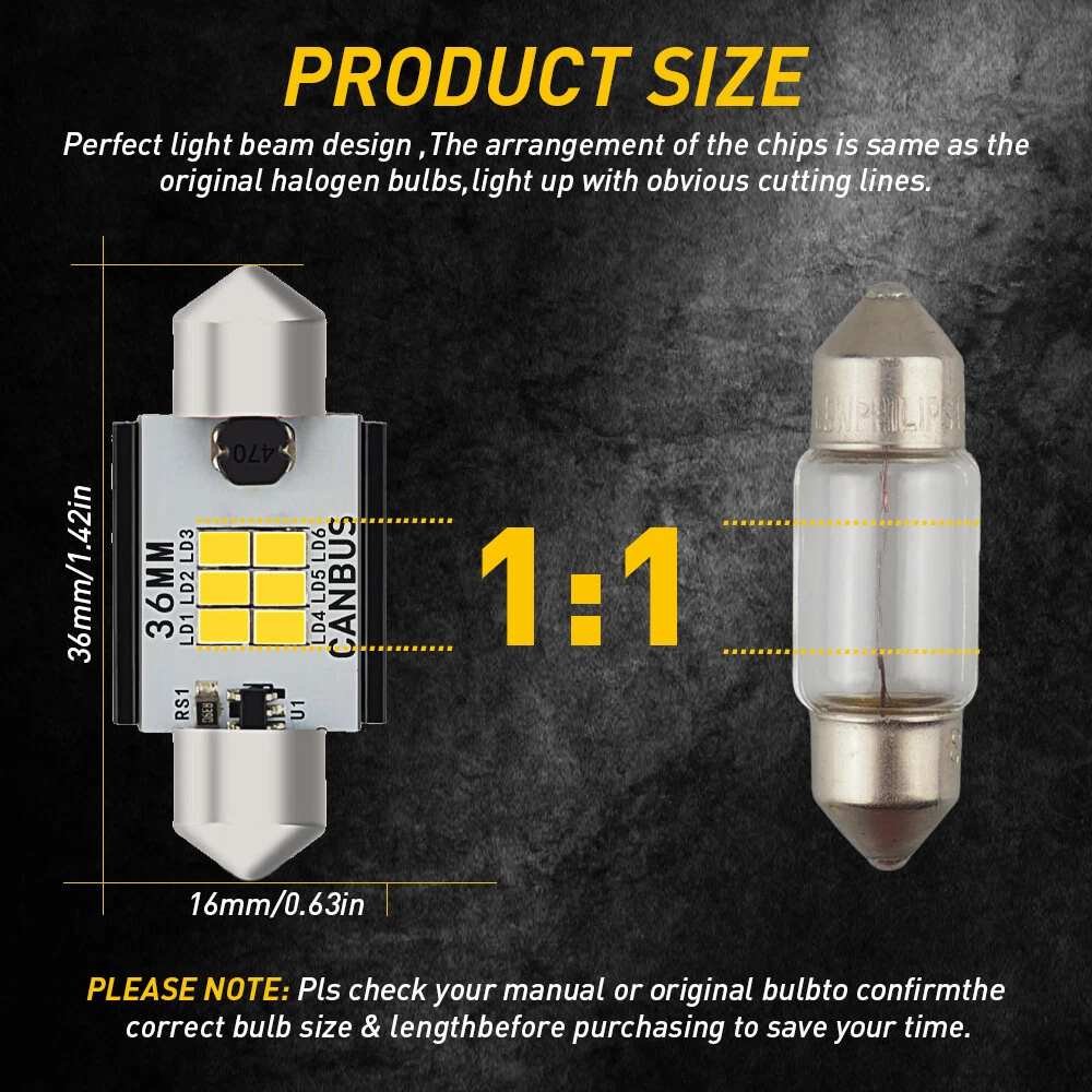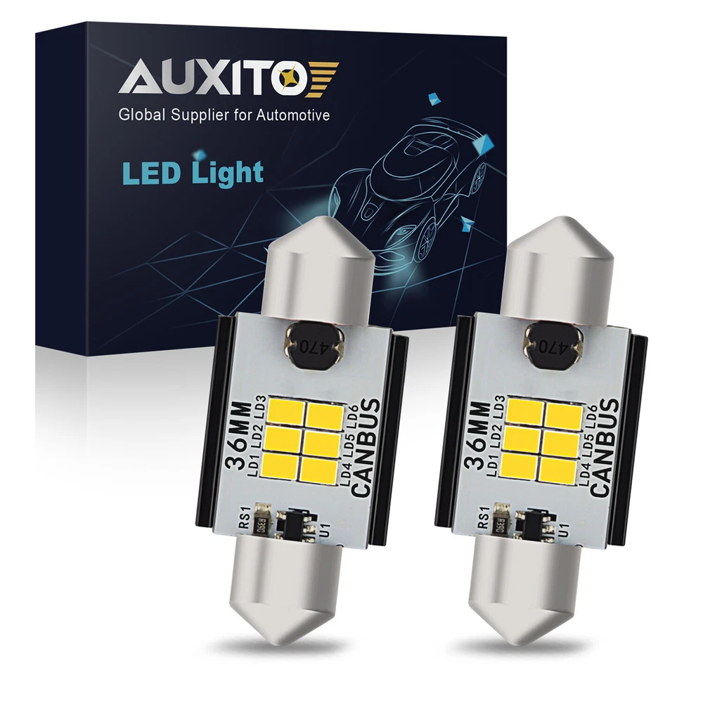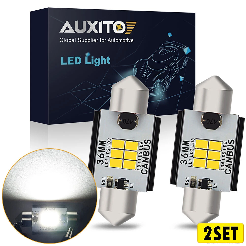1x Pair(2pcs) LED Light Bulbs Why Choose AUXITO LED Lights? * Canbus Error Free Built-in canbus decoder to pass by error check for most car, no flickering. * Excellent Light Output High power 3030 SMD LED chips, 6000K xenon white, different from original yellowish halogen bulbs. Perfect performance for an extremely bright output.360 degree extremely bright illumination, clear view. provide more comfortable driving condition. * No-Polarity Design & Ultra-Compact Size No need to consider polarity while installing, 1 inch design makes sizing comparable to halogen bulbs, fit perfectly in your vehicle. Truly plug & play. 2 Bulbs Car C5W Lights LED Festoon Interior Sidelight Number Plate Auto 36mm M 1x Pair(2pcs) LED Light Bulbs Why Choose AUXITO LED Lights? * Canbus Error Free Built-in canbus decoder to pass by error check for most car, no flickering. * Excellent Light Output High power 3030 SMD LED chips, 6000K xenon white, different from original yellowish halogen bulbs. Perfect performance for an extremely bright output.360 degree extremely bright illumination, clear view. provide more comfortable driving condition. * No-Polarity Design & Ultra-Compact Size No need to consider polarity while installing, 1 inch design makes sizing comparable to halogen bulbs, fit perfectly in your vehicle. Truly plug & play. *Non-Fading Brightness Build in Constant Current IC, ensure consistent lighting all the time and protect the bulb from burning out when the voltage is unstable. Non-polarity design, truly Plug and Play. Application: Bulb size(socket): 36MM , 3423 / 3425 / 6413 / 6411 / 6418 / 6423 / DE3423 / 6486X / 6612F Installation positions: License Plate Light, Trunk Cargo Light, Dome Light, Courtesy Light, Map Light, Interior Door Light, Luggage Compartment Light, Glove Box Light, Vanity Mirror. This item can fit more than 1 position, depending on the make, model, year of your vehicle, please double check your owner's manual before making purchase, or contact us directly to get support. AUXITO 10x T10 White Light Specifications: AUXITO LED Light Bulb has specialized in LED lights for many years. Our mission is to produce high quality automotive LED light bulbs. We believe in our LEDs and offer warranty on item(s) confirm to be manufacturer defect. Socket:T10 194 168 192 2825 W5W Lamp beads: 2835SMD Input voltage: 12V-24V Product color temperature: 6000K. Product brightness: 240LM per light Life: 30,000 hours. Working environment: -40 °C ~ 105 °C Waterproof rating: IP65 Lifespan: 50000 working hours ,Adopt imported chips, stable quality, long service life Cross Reference: W5W 194 147 152 158 159 161 168 184 192 193 259 280 285 447 464 555 558 585 655 656 657 1250 1251 12522450 2652 2921 2825 906 579 Application: Interior Door Light Bulb / side Marker Light Bulb rear / front Tail Light Bulb Inner / License Light Bulb / Glove Box Light Bulb Stepwell light bulb / Trunk or Cargo Area Light Bulb/ Dome Light Bulb Check Engine Light Bulb / Courtesy Light Bulb / Parking Light Bulb Center High Mount Stop Light /Dome Light Bulb / Map Light Bulb Door Mirror illumnination light bulb Package Included: 10x LED Bulbs ABOUT US 2 Bulbs Car C5W Lights LED Festoon Interior Sidelight Number Plate Auto 36mm M 1x Pair(2pcs) LED Light Bulbs Why Choose AUXITO LED Lights? * Canbus Error Free Built-in canbus decoder to pass by error check for most car, no flickering. * Excellent Light Output High power 3030 SMD LED chips, 6000K xenon white, different from original yellowish halogen bulbs. Perfect performance for an extremely bright output.360 degree extremely bright illumination, clear view. provide more comfortable driving condition. * No-Polarity Design & Ultra-Compact Size No need to consider polarity while installing, 1 inch design makes sizing comparable to halogen bulbs, fit perfectly in your vehicle. Truly plug & play. *Non-Fading Brightness Build in Constant Current IC, ensure consistent lighting all the time and protect the bulb from burning out when the voltage is unstable. Non-polarity design, truly Plug and Play. Application: Bulb size(socket): 36MM , 3423 / 3425 / 6413 / 6411 / 6418 / 6423 / DE3423 / 6486X / 6612F Installation positions: License Plate Light, Trunk Cargo Light, Dome Light, Courtesy Light, Map Light, Interior Door Light, Luggage Compartment Light, Glove Box Light, Vanity Mirror. This item can fit more than 1 position, depending on the make, model, year of your vehicle, please double check your owner's manual before making purchase, or contact us directly to get support. AUXITO 10x T10 White Light Specifications: AUXITO LED Light Bulb has specialized in LED lights for many years. Our mission is to produce high quality automotive LED light bulbs. We believe in our LEDs and offer warranty on item(s) confirm to be manufacturer defect. Socket:T10 194 168 192 2825 W5W Lamp beads: 2835SMD Input voltage: 12V-24V Product color temperature: 6000K. Product brightness: 240LM per light Life: 30,000 hours. Working environment: -40 °C ~ 105 °C Waterproof rating: IP65 Lifespan: 50000 working hours ,Adopt imported chips, stable quality, long service life Cross Reference: W5W 194 147 152 158 159 161 168 184 192 193 259 280 285 447 464 555 558 585 655 656 657 1250 1251 12522450 2652 2921 2825 906 579 Application: Interior Door Light Bulb / side Marker Light Bulb rear / front Tail Light Bulb Inner / License Light Bulb / Glove Box Light Bulb Stepwell light bulb / Trunk or Cargo Area Light Bulb/ Dome Light Bulb Check Engine Light Bulb / Courtesy Light Bulb / Parking Light Bulb Center High Mount Stop Light /Dome Light Bulb / Map Light Bulb Door Mirror illumnination light bulb Package Included: 10x LED Bulbs FAQ Shipping Returns Contact Us Payment Why swith to LED? LEDs not only give your vehicle a clean, modern look but, with proper use, will outlast any halogen bulb and HID bulb! Low energy draw, high lumen output, and instant on/off LED technology out shines stock bulbs in every way. Which bulbs are used in my ve