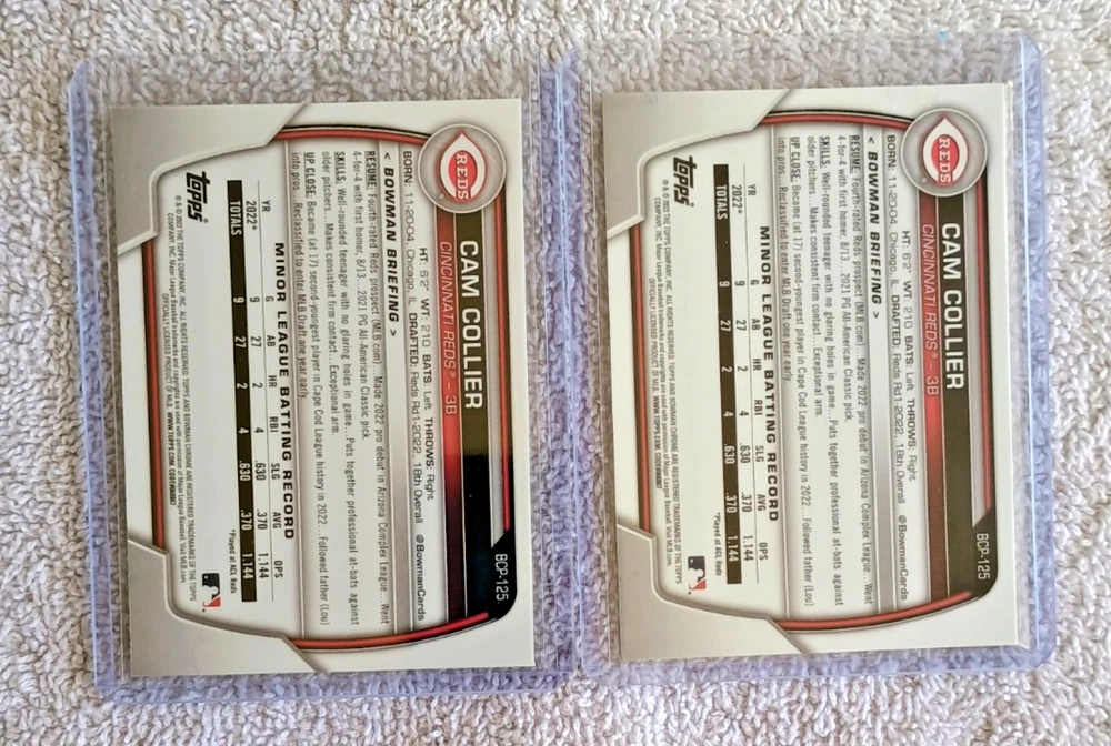 2 CAM COLLIER 2023 BOWMAN CHROME MEGA MOJO REFRACTOR RC LOT # BCP125 REDS SHIPPING WILL BE $4.99. I DO COMBINE SHIPPING FOR ADDITIONAL ITEMS PURCHASED. PLEASE CONTACT ME FOR DISCOUNTED RATES. USPS FIRST CLASS SHIPPING UNLESS OTHERWISE LISTED. I ONLY SHIP TO THE U.S. EBAY SELLER WITH 100% FEEDBACK. PLEASE VIEW MY OTHER LISTING. MONEY BACK IS GURANTED IF YOU NOT SATISFIED WITH THE RETURN OF THE ITEM OR ITEMS.