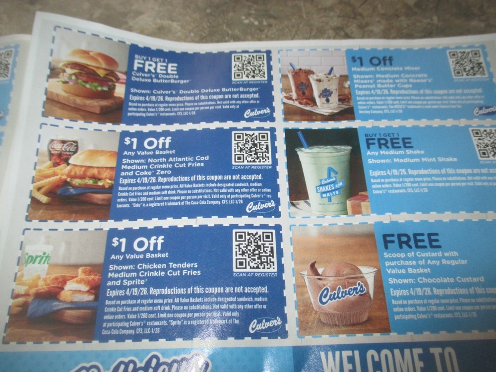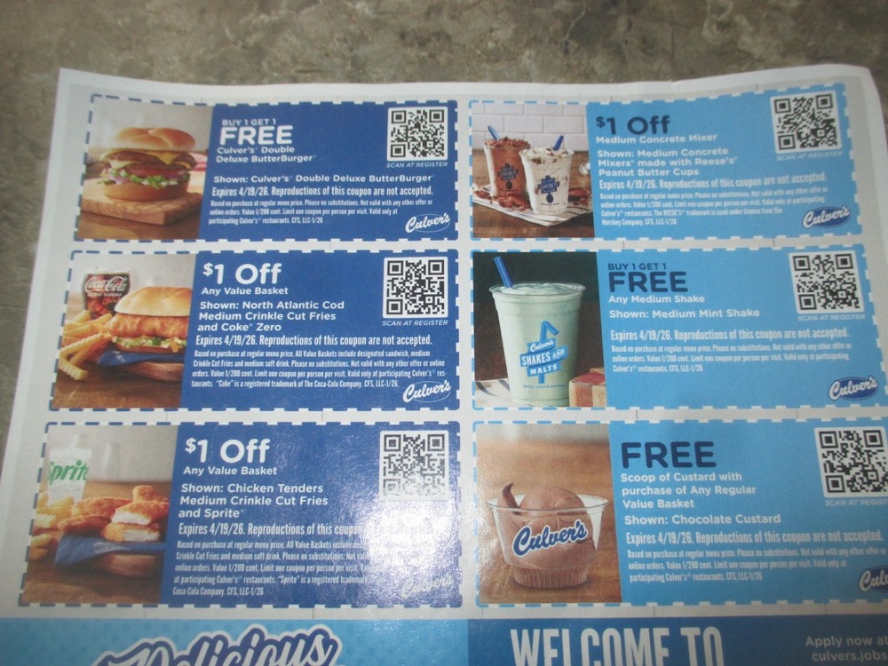 2 - CULVER'S COUPON SHEETS. 6 Coupons Per Sheet, 12 Total. Expiration Date 04-19-2026. -- Free First Class Shipping in US --