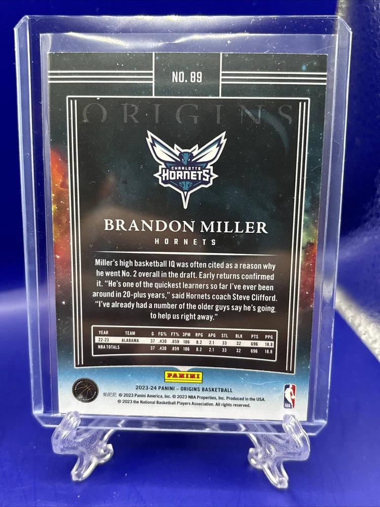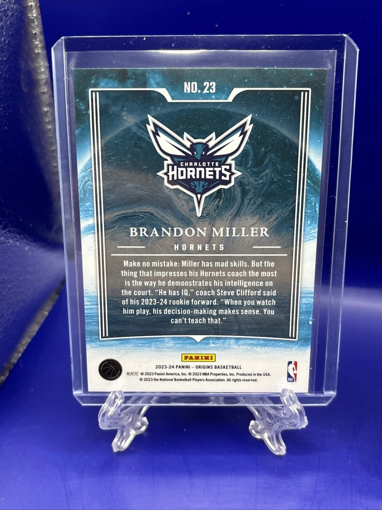 Player/Athlete: Brandon Miller Type: Sports Trading Card Sport: Basketball League: National Basketball Association (NBA) Number of Cards: 2 Features: Rookie Year Manufactured: 2023 Original/Licensed Reprint: Original Set: 2023-24 Panini Origins Season: 2023-24 Manufacturer: Panini