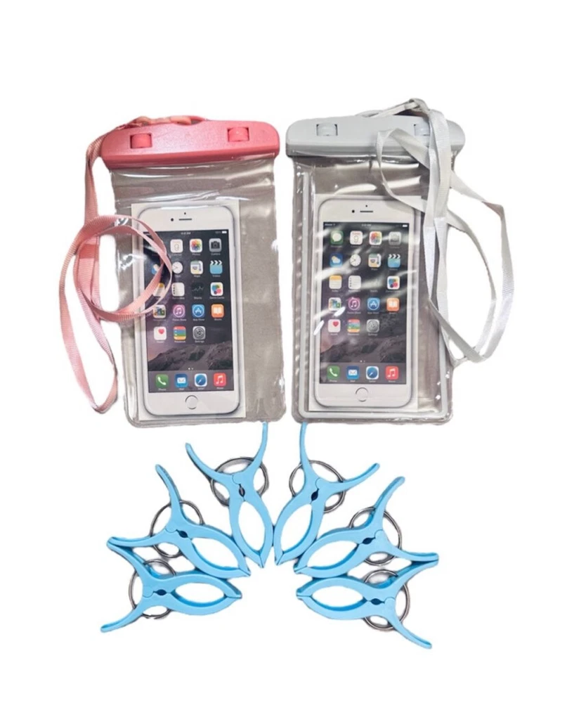 NWOT/Never used - may have slight marks from being stored. Includes 2 Clear Plastic Phone Waterproof Bag/Pouches (pink/white) and 6 light blue Clothespins Towel Holder for Beach Chair. Ended up not needing it for a trip and never used.