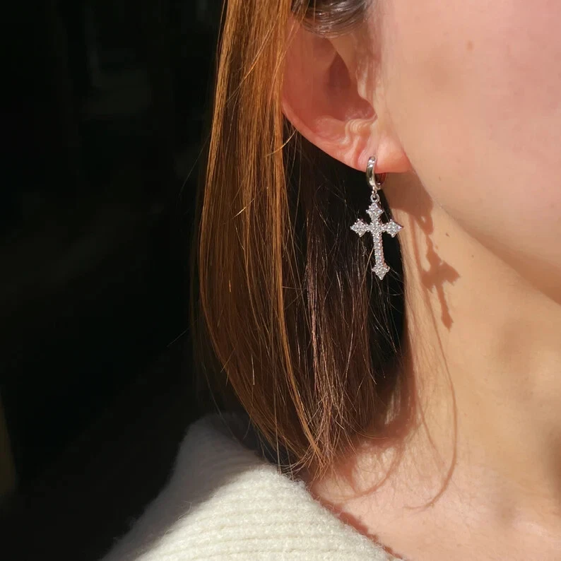 This 2 Ct Round Simulated Diamond Women Cross Hoop & Drop Earring is crafted in sterling silver with a 14k white gold overlay. The earrings feature a cross shape with huggie and dangle/drop style, adorned with simulated diamonds in a prong setting. Measuring 18mm in length and 10mm in diameter, these earrings are nickel-free and engraved, making them suitable for various occasions like engagements, birthdays, and Valentine's Day. They are handmade and can be personalized according to the buyer's requirements, offering a unique touch to the accessory.