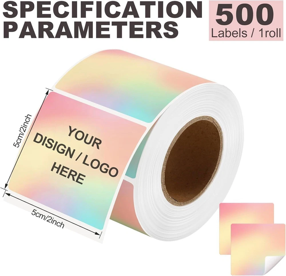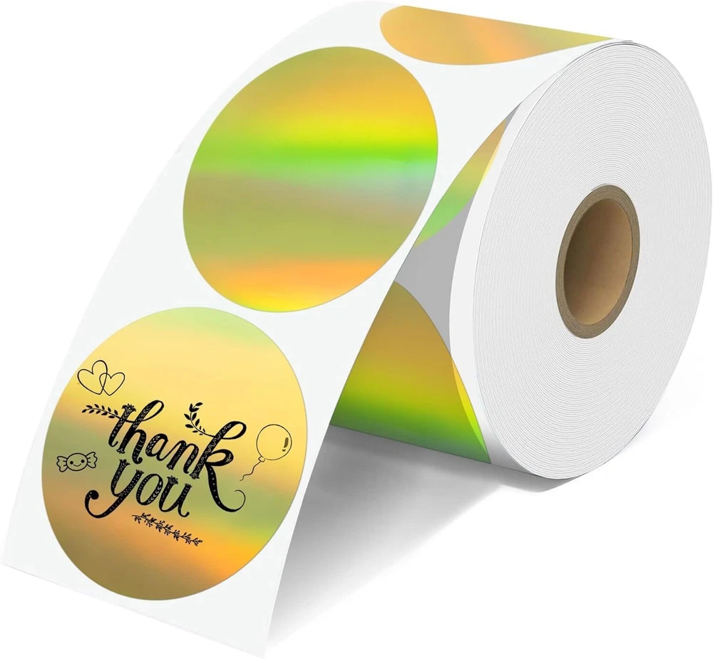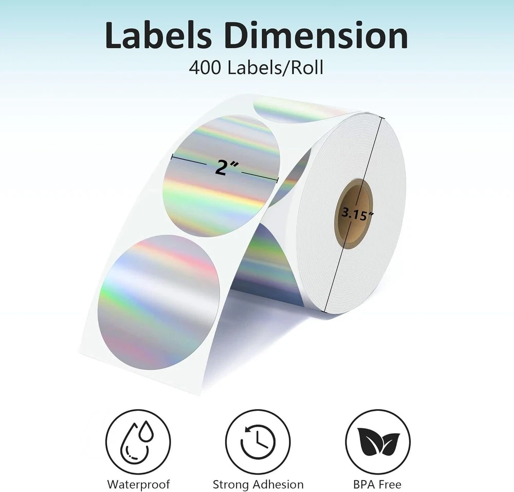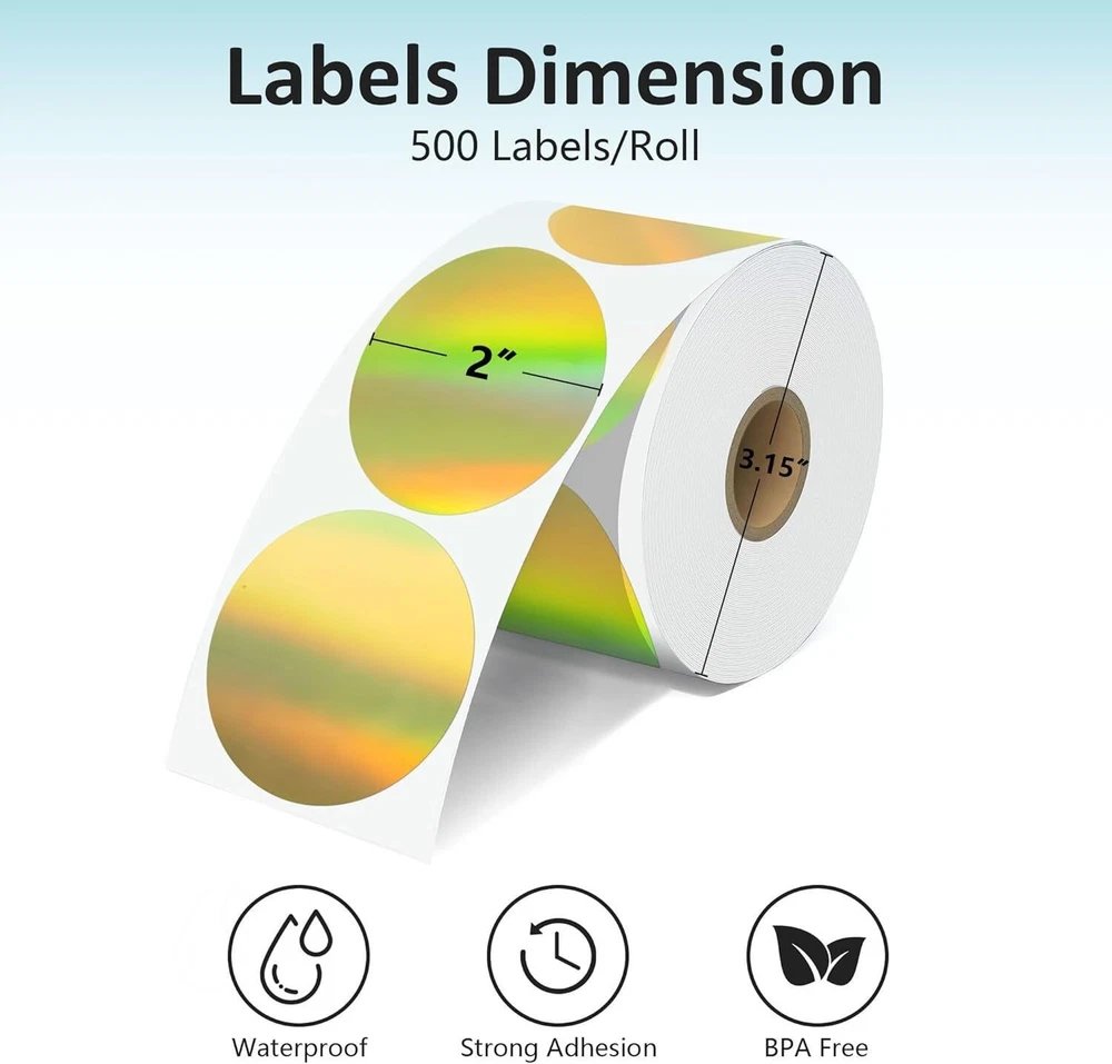 Specifications: Size : 2 Inch Round thermal labels Paper tube diameter: 1.19"(30mm) Paper roll diameter: Round thermal labels paper tube diameter: 1.19"(30mm) 3.35"(85mm). Exclusive for thermal printers. Print Clearly: Our circle label stickers produces clear and crisp printing, making it easy to read and scan. Super Adhesive: Our thermal printer labels are highly self-adhesive, ensuring they stay in place even in harsh environments.Can be used with confidence. Water, Oil and Stain: Our labels are resistant to water and oil, making them ideal for use in a variety of environments. It will not affect its printing handwriting, very convenient. Wide Use: Circle thermal labels can be used for kitchen and room storage at home, school sorting, children's stationery sorting, work file sorting, and purchase products DIY logo design, QR code, name brand, custom stickers. Compatible with MUNBYN, Rollo, iDRPT, Polono, Jiose, K Comer, LabelRange, OFFNOVA, JADENS, Phomemo, NefLaca, Zebra, MFLABEL, Arkscan, BESTEASY, and other direct thermal printers. (NOT Compatible With DYMO and Brother). Features: 100% compatible with zebra eltron printers Direct Thermal Labels,White, Self-Adhesive Strong adhesive to corrugated boxes and envelopes Resist scratches, water, dirt, dust and grease Compatible printers include but not limited to: Zebra: LP 2844; LP 2844Z; LP 3844Z; TLP 2824; TLP 2824Z, TLP 2844Z; TLP3842; TLP3844Z; GX420 DD; GX420 TT; GX430 TT; GK420D; GK420T;ZP-450 Holographic Thermal Labels Feature: Dazzling Visual Effects:Our Holographic gold Thermal Stickers Labels boast a mesmerizing rainbow metallic vinyl surface that transforms colors in the light, ensuring a captivating and unique visual experience. Make an unforgettable impression that stands out! Print Without Limits:Unlock the potential of thermal printing with our thermal label. No ink, toner, or ribbons required! Enjoy the convenience of direct thermal printing while eliminating the need for additional supplies. Versatile Label Solutions:We offers authenticity in 2” round (400/500 labels/roll). Elevate your packaging game with thermal sticker labels, ensuring clear printing and hassle-application. Uncompromising Quality:Our thermal labels deliver more than aesthetics. Experience clear printing, strong self-adhesive grip, and durability. Waterproof, oil-proof, and scratch-resistant, these labels safeguard your product without compromise. Easy to remove without damage! Universal:Our thermal label stickers are from BPA and BPS, making them safe for all. Embrace sustainability without sacrificing quality – a choice for the planet and your business success! Wide Compatibility: Perfectly compatible with Phomemo, JADENS, MUNBYN, Rollo, iDRPT, Zebra, LabelRange, K COMER, vretti, Rongta, Polono, Jiose, OFFNOVA, NefLaca, MFLABEL, Arkscan, BESTEASY, and other direct thermal printers. (Not Compatible With Dymo or Brother) Package Include: 1/2 Roll thermal label