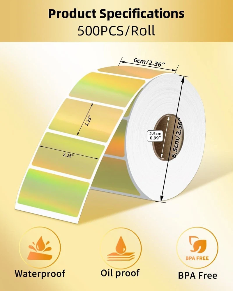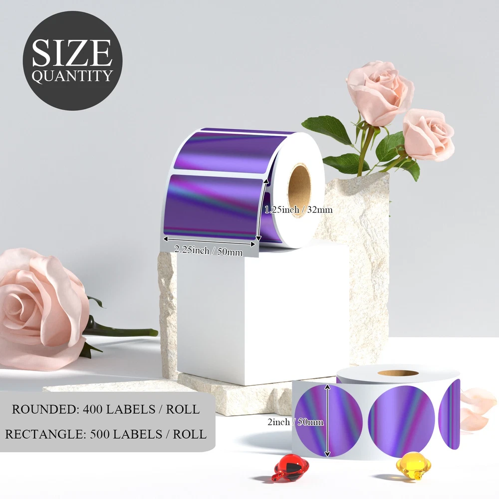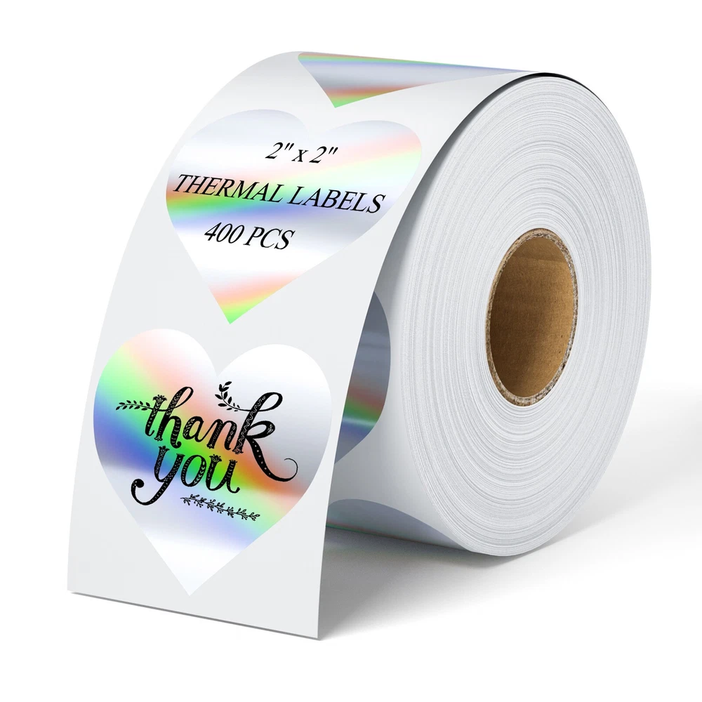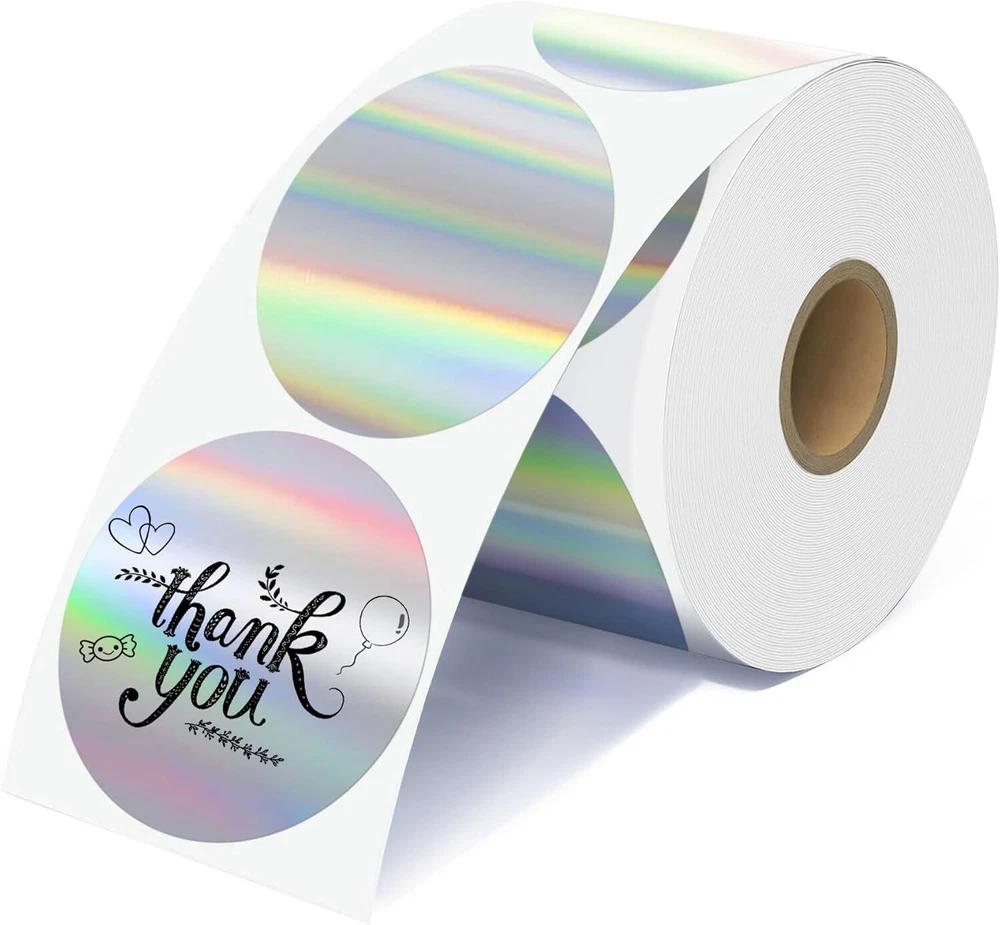 Specifications: Size : 2 Inch Round thermal labels Paper tube diameter: 1.19"(30mm) Paper roll diameter: Round thermal labels paper tube diameter: 1.19"(30mm) 3.35"(85mm). Exclusive for thermal printers. Print Clearly: Our circle label stickers produces clear and crisp printing, making it easy to read and scan. Super Adhesive: Our thermal printer labels are highly self-adhesive, ensuring they stay in place even in harsh environments.Can be used with confidence. Water, Oil and Stain: Our labels are resistant to water and oil, making them ideal for use in a variety of environments. It will not affect its printing handwriting, very convenient. Wide Use: Circle thermal labels can be used for kitchen and room storage at home, school sorting, children's stationery sorting, work file sorting, and purchase products DIY logo design, QR code, name brand, custom stickers. Compatible with MUNBYN, Rollo, iDRPT, Polono, Jiose, K Comer, LabelRange, OFFNOVA, JADENS, Phomemo, NefLaca, Zebra, MFLABEL, Arkscan, BESTEASY, and other direct thermal printers. (NOT Compatible With DYMO and Brother). Features: 100% compatible with zebra eltron printers Direct Thermal Labels,White, Self-Adhesive Strong adhesive to corrugated boxes and envelopes Resist scratches, water, dirt, dust and grease Compatible printers include but not limited to: Zebra: LP 2844; LP 2844Z; LP 3844Z; TLP 2824; TLP 2824Z, TLP 2844Z; TLP3842; TLP3844Z; GX420 DD; GX420 TT; GX430 TT; GK420D; GK420T;ZP-450 Holographic Thermal Labels Feature: Dazzling Visual Effects:Our Holographic gold Thermal Stickers Labels boast a mesmerizing rainbow metallic vinyl surface that transforms colors in the light, ensuring a captivating and unique visual experience. Make an unforgettable impression that stands out! Print Without Limits:Unlock the potential of thermal printing with our thermal label. No ink, toner, or ribbons required! Enjoy the convenience of direct thermal printing while eliminating the need for additional supplies. Versatile Label Solutions:We offers authenticity in 2” round (400/500 labels/roll). Elevate your packaging game with thermal sticker labels, ensuring clear printing and hassle-application. Uncompromising Quality:Our thermal labels deliver more than aesthetics. Experience clear printing, strong self-adhesive grip, and durability. Waterproof, oil-proof, and scratch-resistant, these labels safeguard your product without compromise. Easy to remove without damage! Universal:Our thermal label stickers are from BPA and BPS, making them safe for all. Embrace sustainability without sacrificing quality – a choice for the planet and your business success! Wide Compatibility: Perfectly compatible with Phomemo, JADENS, MUNBYN, Rollo, iDRPT, Zebra, LabelRange, K COMER, vretti, Rongta, Polono, Jiose, OFFNOVA, NefLaca, MFLABEL, Arkscan, BESTEASY, and other direct thermal printers. (Not Compatible With Dymo or Brother) Package Include: 1/2 Roll thermal label