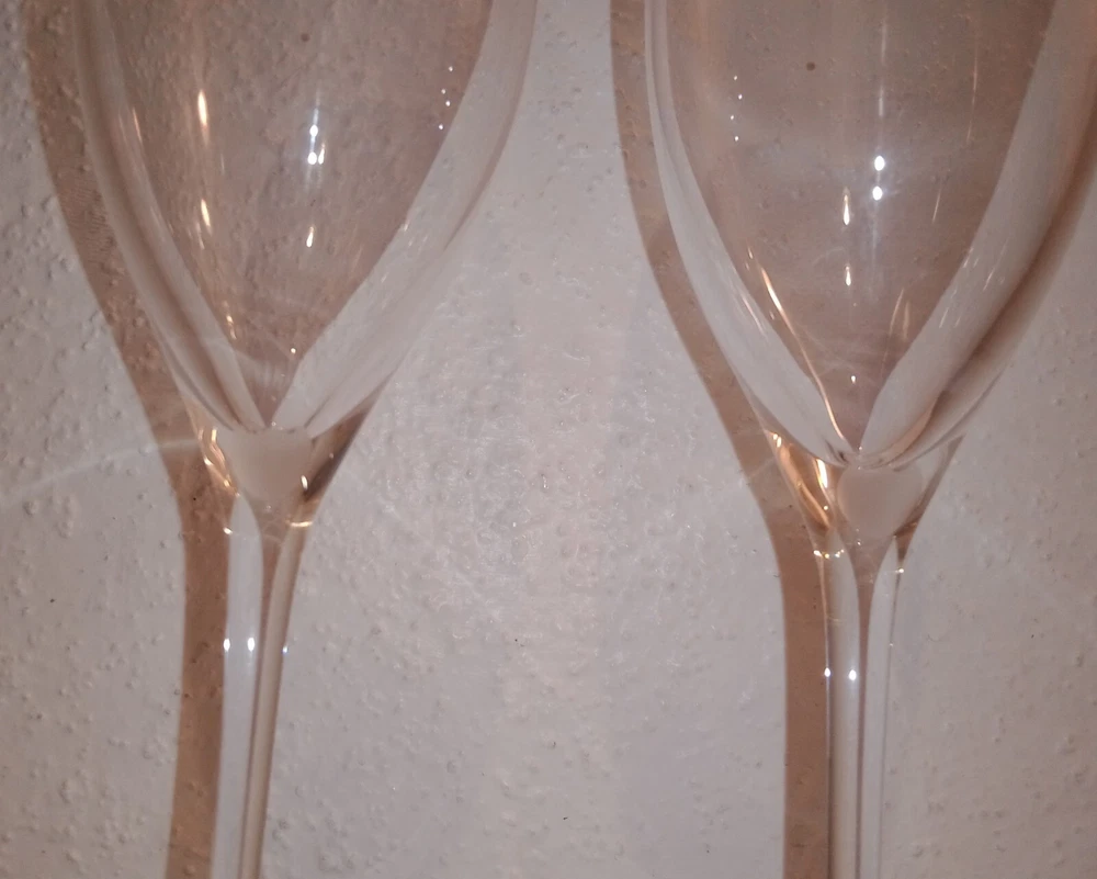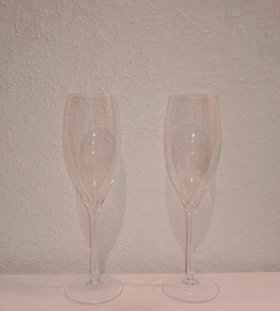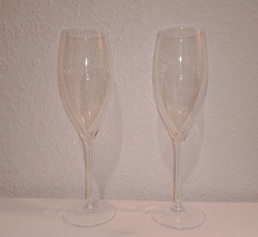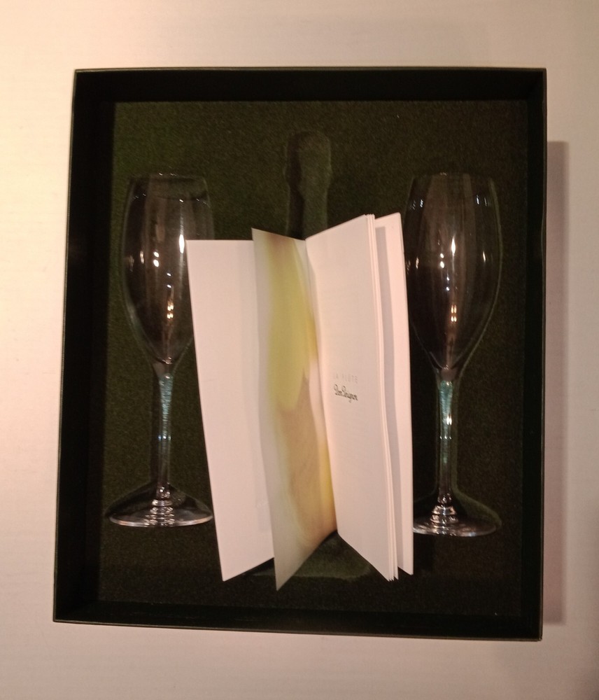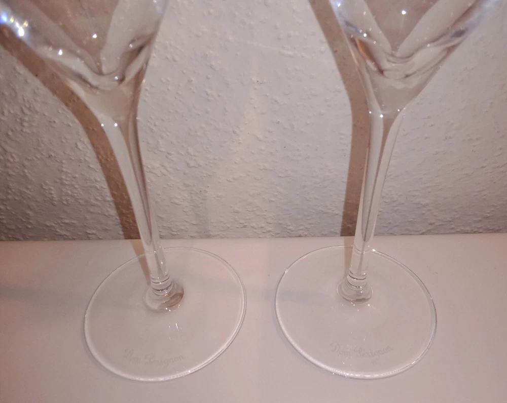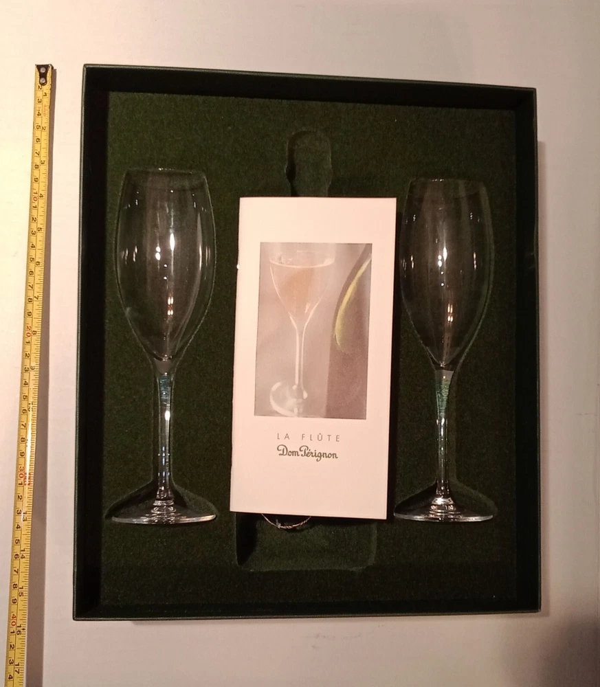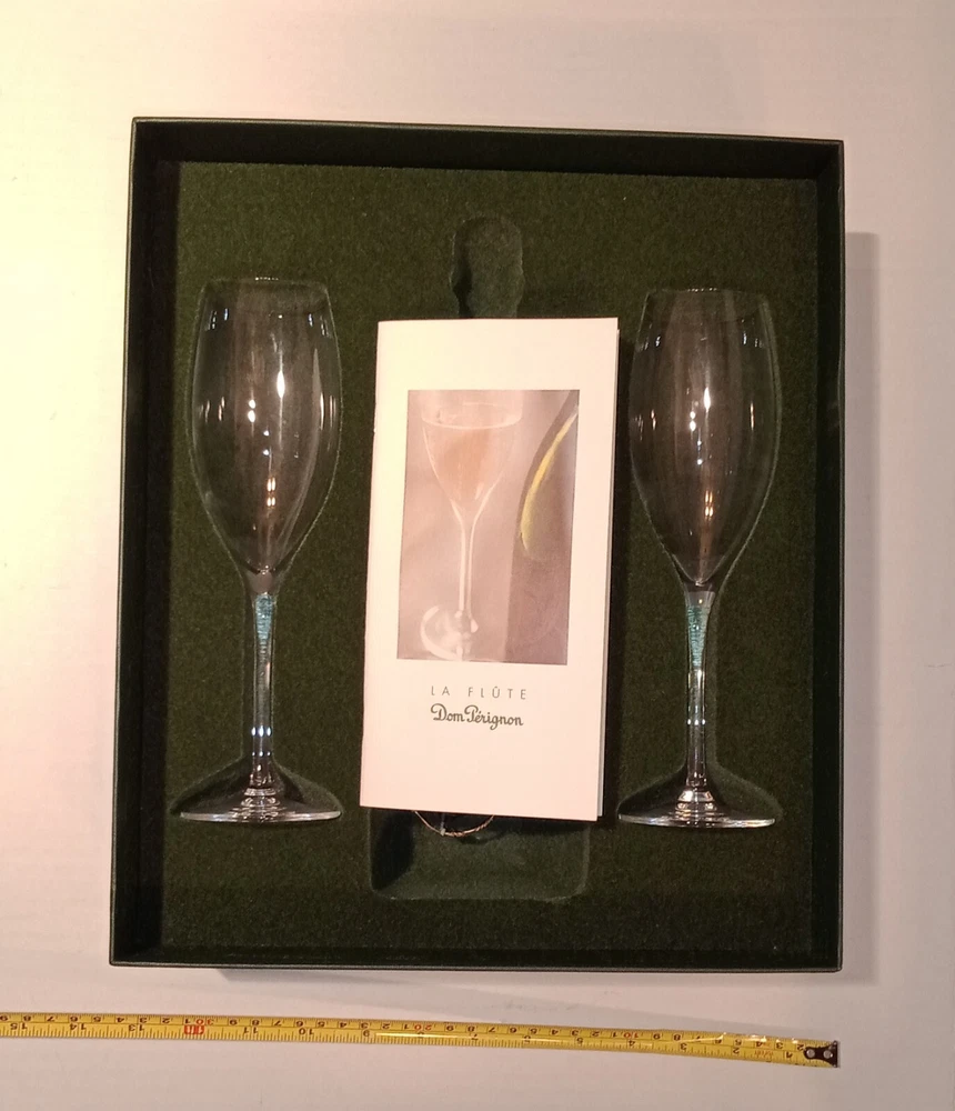 Cuvee Dom Perignon Vintage 1993 Gift Box Set of 2 Crystal Champagne Flute Glasses with brochure, but without the bottle. Fine stemware with logos and a dot to indicate the fill line. This is a guide for what's recognized as the correct way to serve champagne. Zoom in. See pics. These elegant flutes are in excellent pre-owned condition, used only once. Hand washed. The box will be wrapped with the flutes inside with the "foam" insert. Pet free, smoke free household.... Please see my other quality items including designer handbags, designer shoes, designer, vintage, semi-precious jewelry, Swiss watches, apparel and home goods, etc. Thanks for looking.