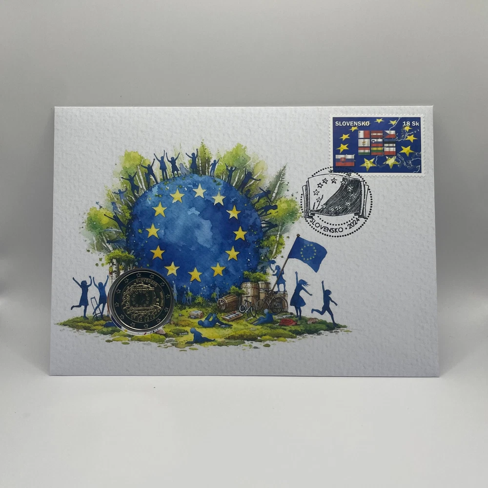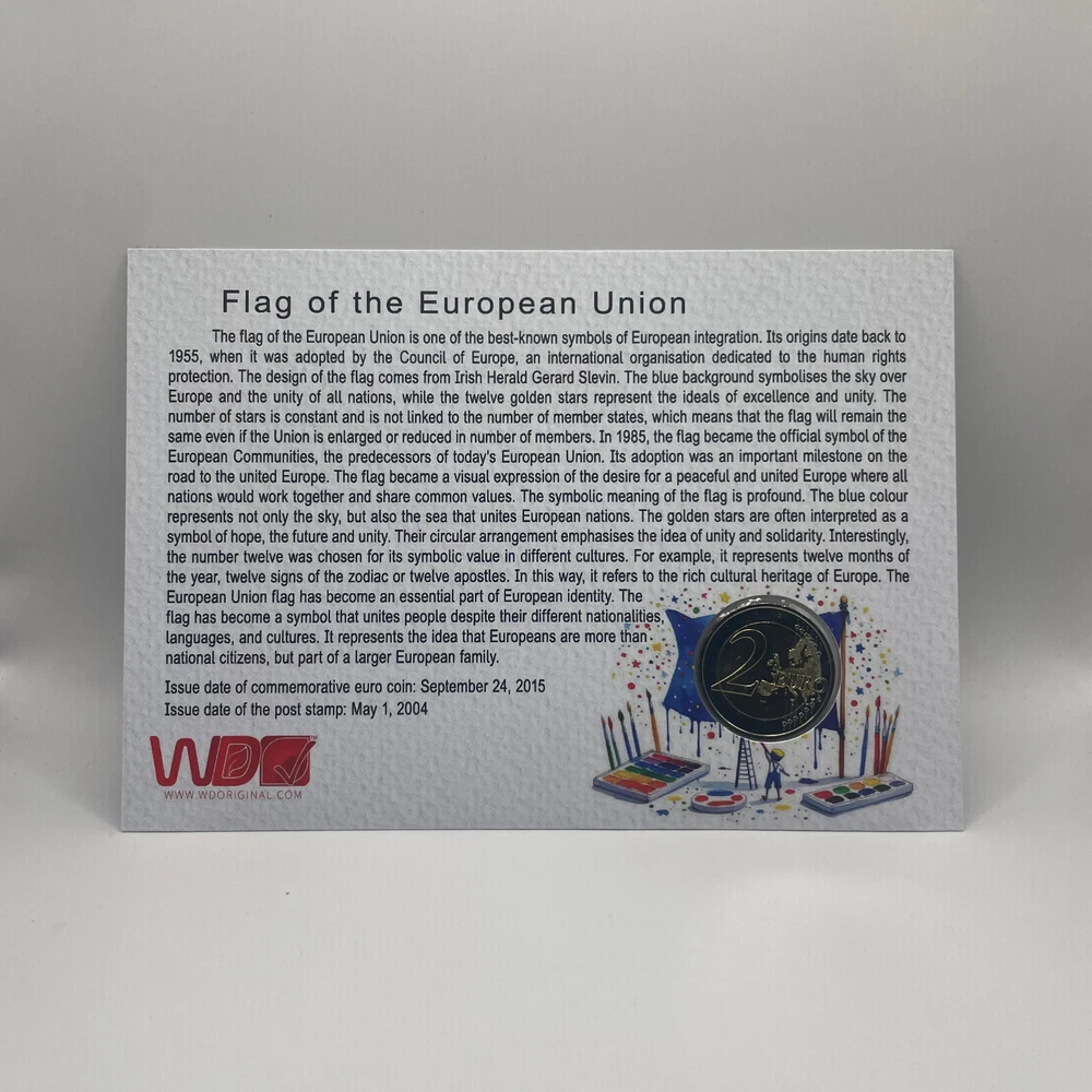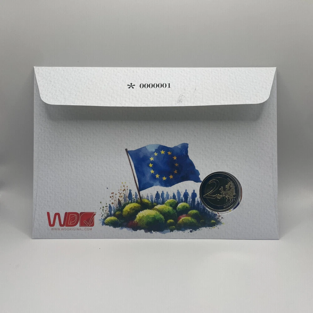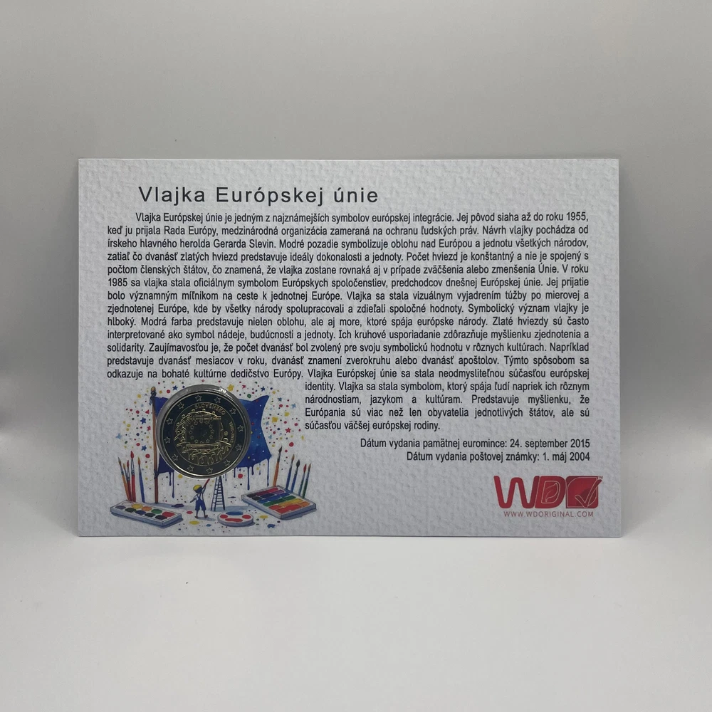 Numizmatická obálka zo série „Výročia a udalosti“ sa môže stať unikátnym zberateľským kúskom vo Vašej zbierke. Limitovaná edícia 300 kusov, s možnosťou dotlače na maximálne 500 kusov, robí túto sériu jedinečnou nie len zo zberateľského ale aj z investičného hľadiska. | The numismatic envelope from the „Anniversaries and Events“ series can become a unique collector’s item in your collection. The limited edition of 300 pieces, with the option of reprinting a maximum of 500 pieces, makes this series unique not only from a collector’s point of view, but also from an investment point of view. NUMIZMATICKÁ OBÁLKA – VLAJKA EURÓPSKEJ ÚNIE – UNC | Slovensko/Slovakia 2024 ( www.wdoriginal.com ) Numizmatická obálka/Numismatic envelope Nominálna hodnota mince | Nominal value of the coin: 2 EURO Nominálna hodnota známky | Nominal value of the stamp: 18 SKK Autor numizmatickej obálky | Author of the numismatic envelope: Ing. Pavol Lipták Dátum vydania | Release date: 09.11.2024 Náklad | Quantity: 300 kusov/pieces ( číslované/numbered ) Kvalita mince | Quality of the coin: UNC Kvalita UNC Názov kvality pochádza z anglického slova „uncirculated“ , čo znamená neobehový . UNC kvalita euro mincí je najrozšírenejšou kvalitou mincí. Takáto minca sa razí vo veľkých množstvách a od obehovej kvality sa líši len tým, že sa do obehu nikdy nedostala a pochádza priamo z banky. Jej hodnota je pochopiteľne vyššia ako je hodnota obehovej mince. S takouto mincou je potrebné správne manipulovať. V opačnom prípade s nanesením prachu či mastnoty zostávajú na minci viditeľné odtlačky, čím sa už považuje za obehovú kvalitu. Pri manipulácií je vhodné používať bavlnené rukavice, pinzetu a mince mať uložené v kvalitnom albume určenom na daný účel. Quality UNC The name of the quality comes from the english word „uncirculated“ , which means non-circulating . UNC quality euro coins are the most common quality coins. Such a coin is minted in large quantities and differs from the circulation quality only in that it has never entered circulation and comes directly from the bank. Its value is, of course, higher than the value of the circulation coin. Such a coin must be handled correctly. Otherwise, with the application of dust or grease, imprints remain visible on the coin, which is already considered a circulatory quality. When handling, it is advisable to use cotton gloves, tweezers and coins stored in a quality album designed for the purpose.