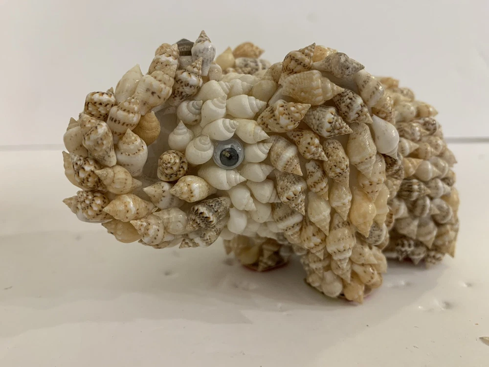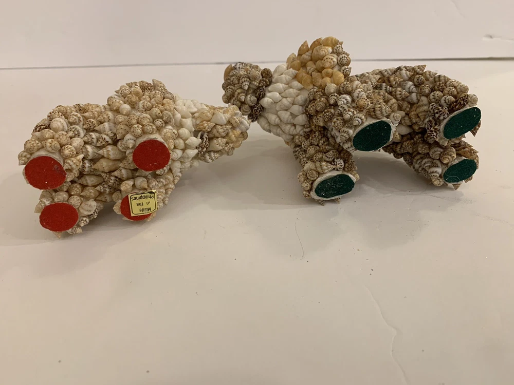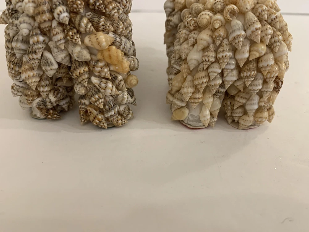 Set 2 Sea Shell Encrusted Elephants Trunks Up Figurines Handmade in Philippines Collectible Coastal decor A few missing seashells not very noticeable- refer to pics Approximately 4” and 2”H
